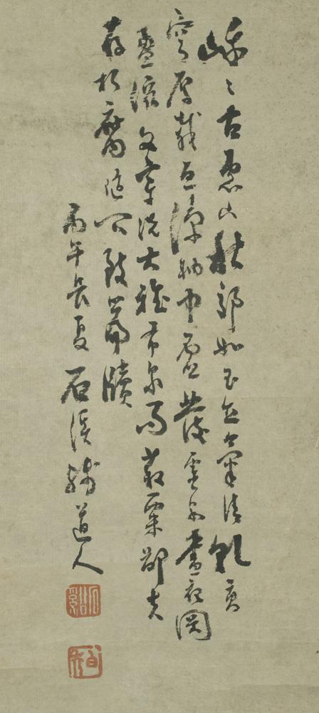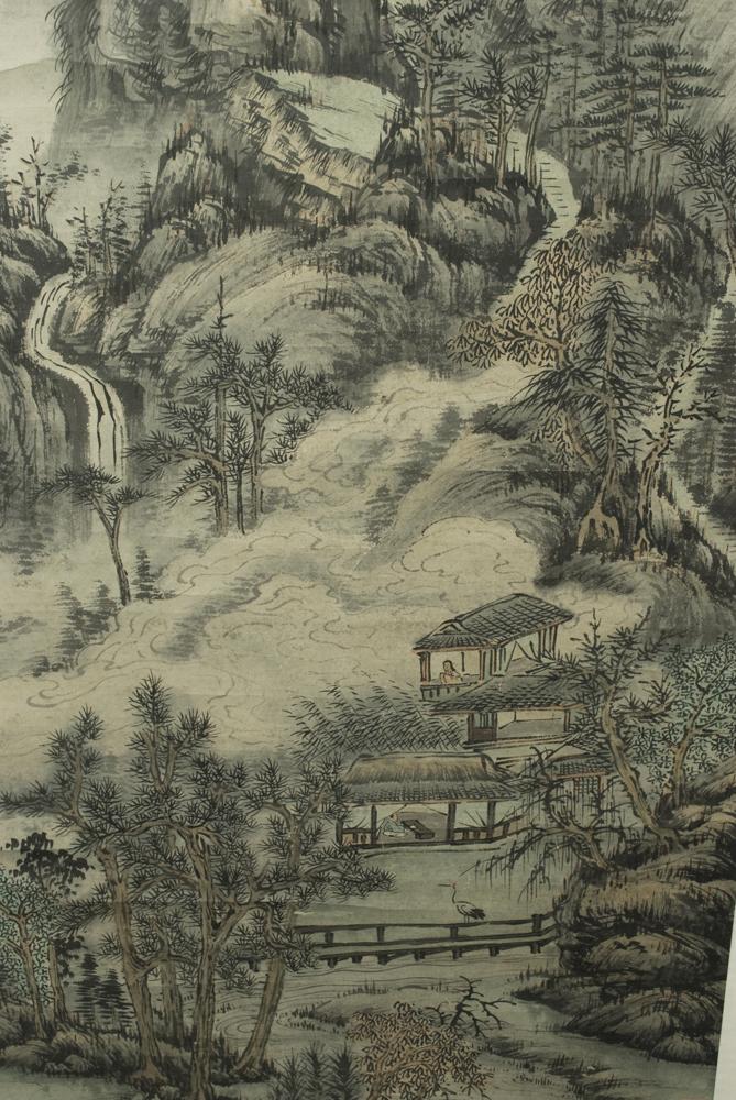 Shi Tao, 1641-1707. Long watercolor painting attached to scroll depicting a mountain village scene with winding roadways and figures. Signed and two seal marks in UL, two seal marks in LR. 52" H x 18" W (sight).