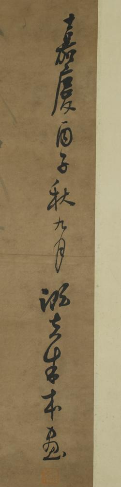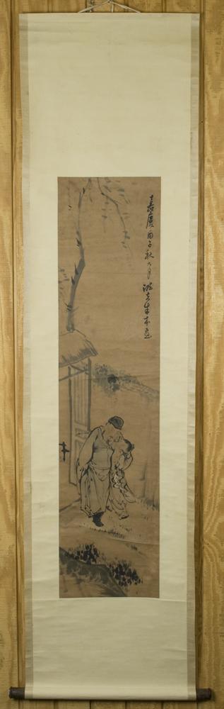 Zhu Ben, 1761-1819. Long watercolor painting attached to scroll depicting two figures either leaving or entering through a door. Signature and two seal marks in UR. 45" H x 11" W (sight).