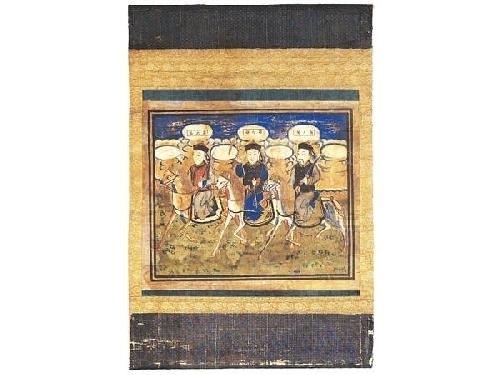 Paper, in silk brocade frame. Manchurian noble rider sitting on a horse with bodyguards, Chinese letters over them. China, late 19th century. Size: 87 x 60 cm