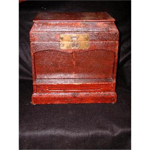 Early 19th century imported Official's Seal box is red lacquered and comes from Shanxi Provence,China.Made of Yumu,northern elmwood. Has removable tray and plate rest. This type of box was used to store official Chops,stone pieces,carved with official seals on one end used in stamping documents in ink or was., The Chops were stored underneath the removable tray.The removable plate was used to place documents on which were to be sealed. Threee interior drawers and concealed compartment below the bottom drawer. Brass decorative latch and side handles along with drop pulls,all original. Makes an exceptional jewelry box or other accent piece with storage today. Super condition. Measures 17H X 17L X 12D.