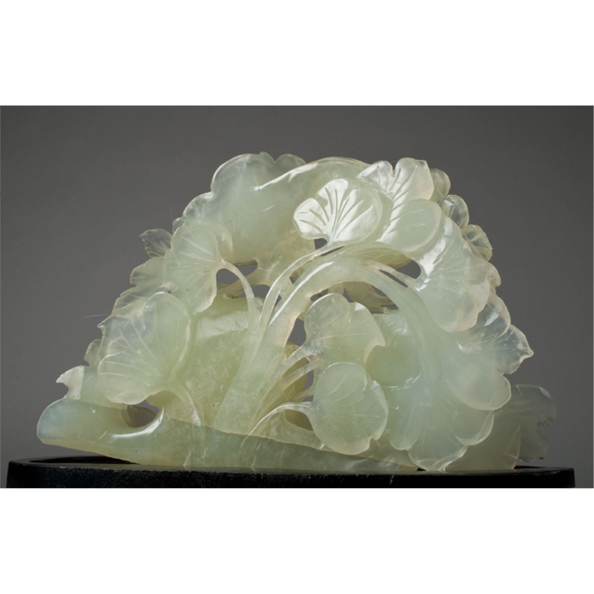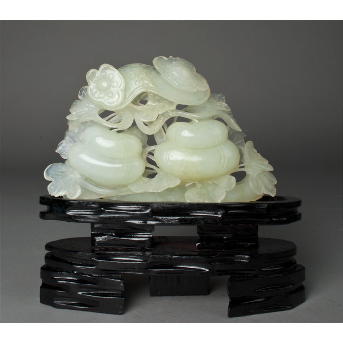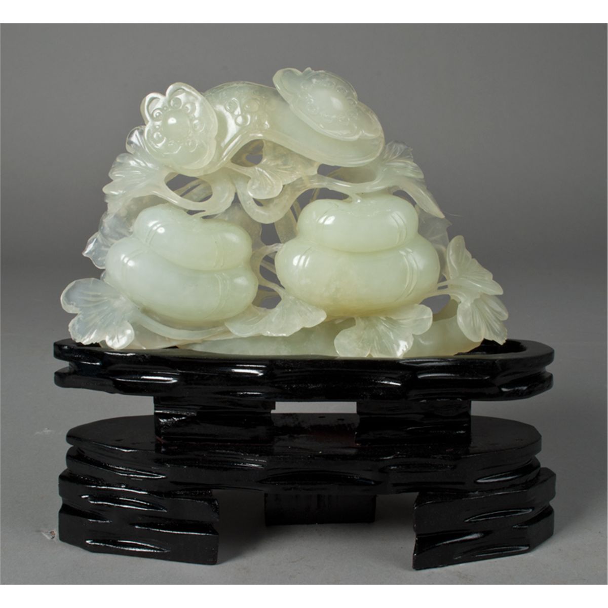Finely carved and polish to depict double gourds with whimsy on fitted hardwood stand. 5" H x 8.5" W, circa early 20th century. Private collection Troy, MI.