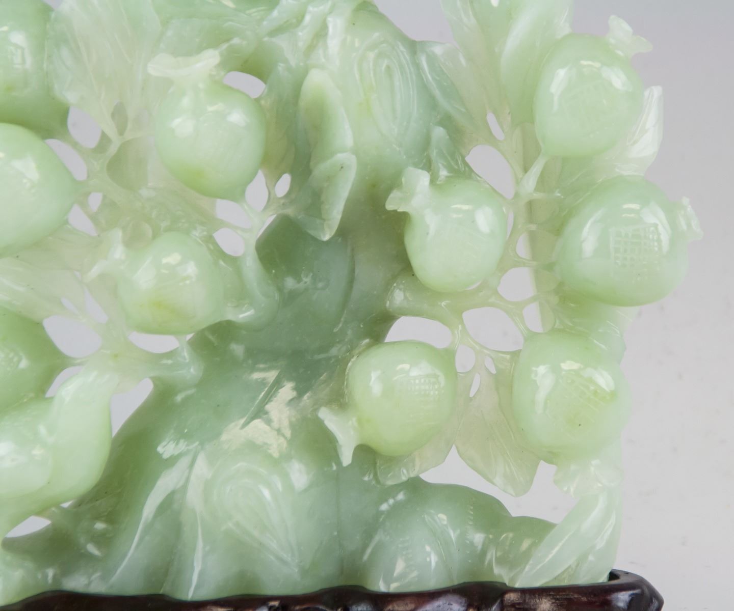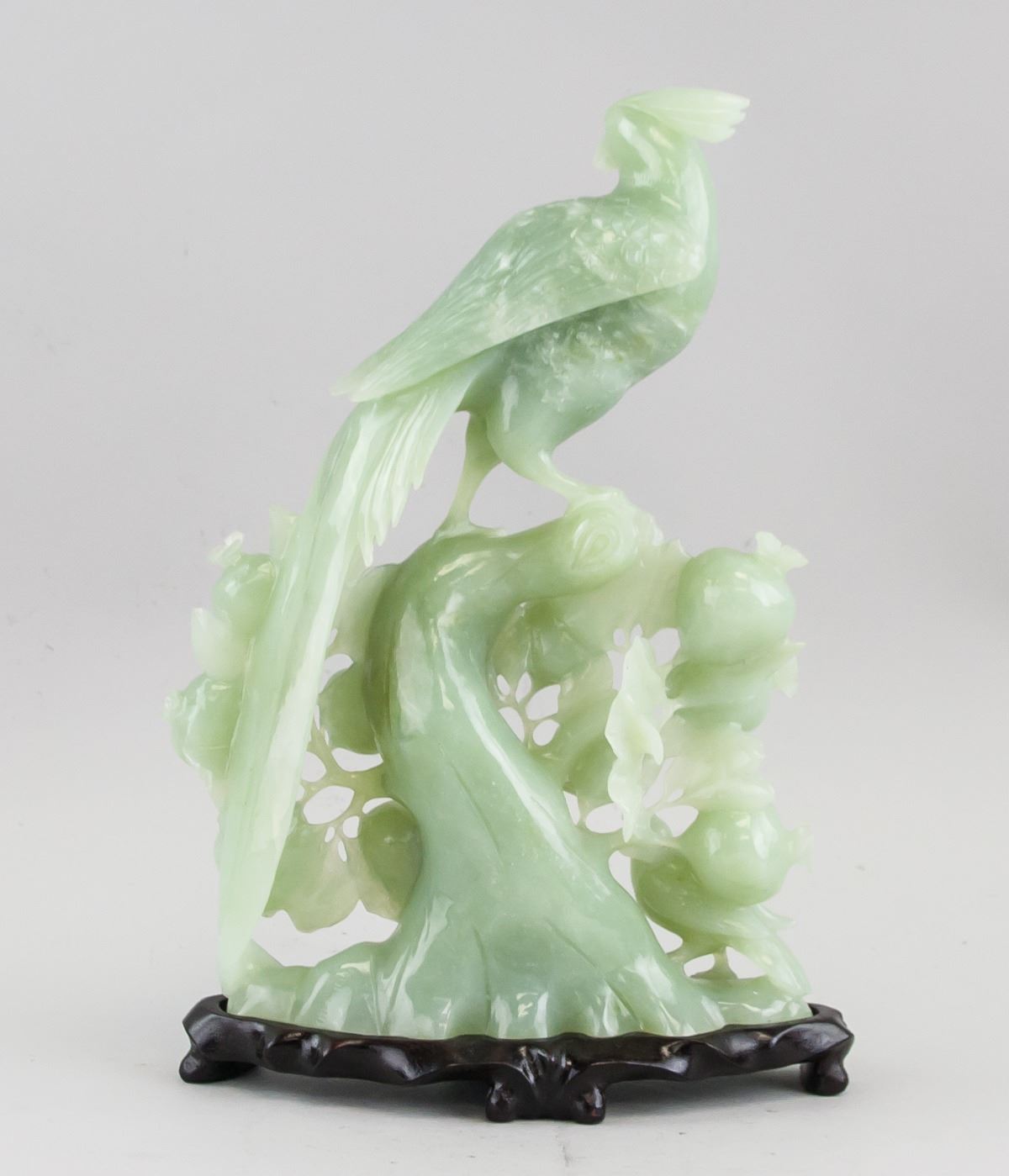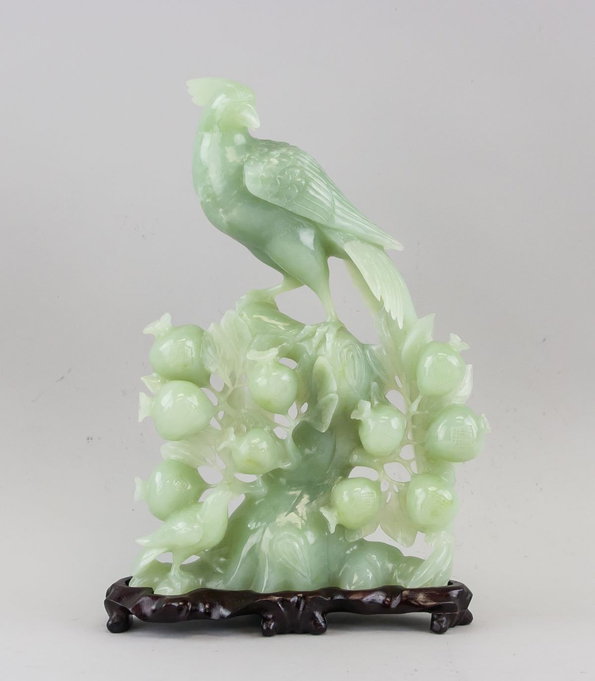 Chinese serpentine stone carved decoration, featuring pheasant standing on pomegranate and flowers, with customized wood base. 28 x 19 cm, 1861 grams