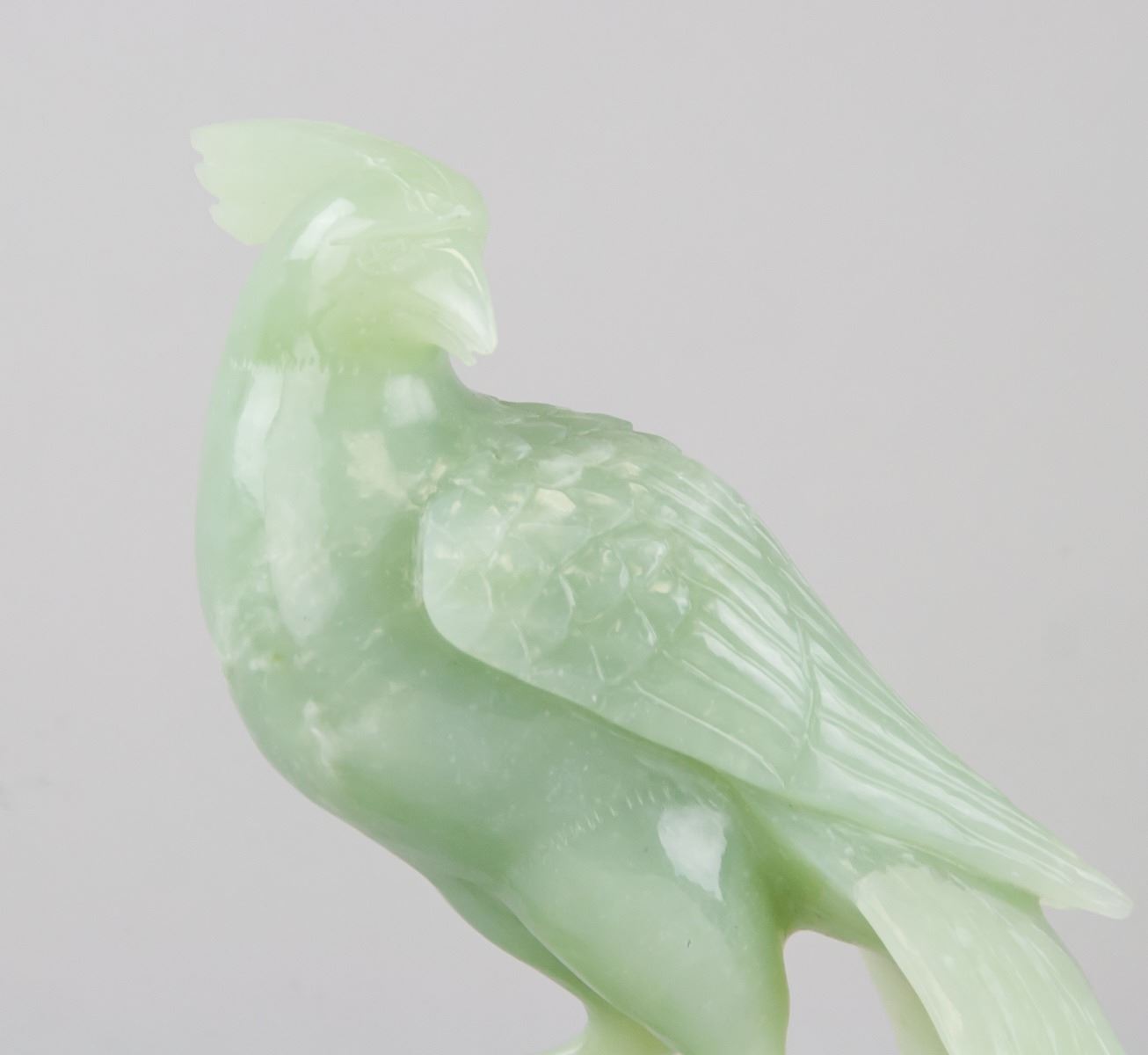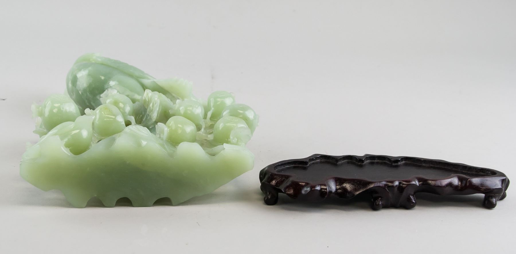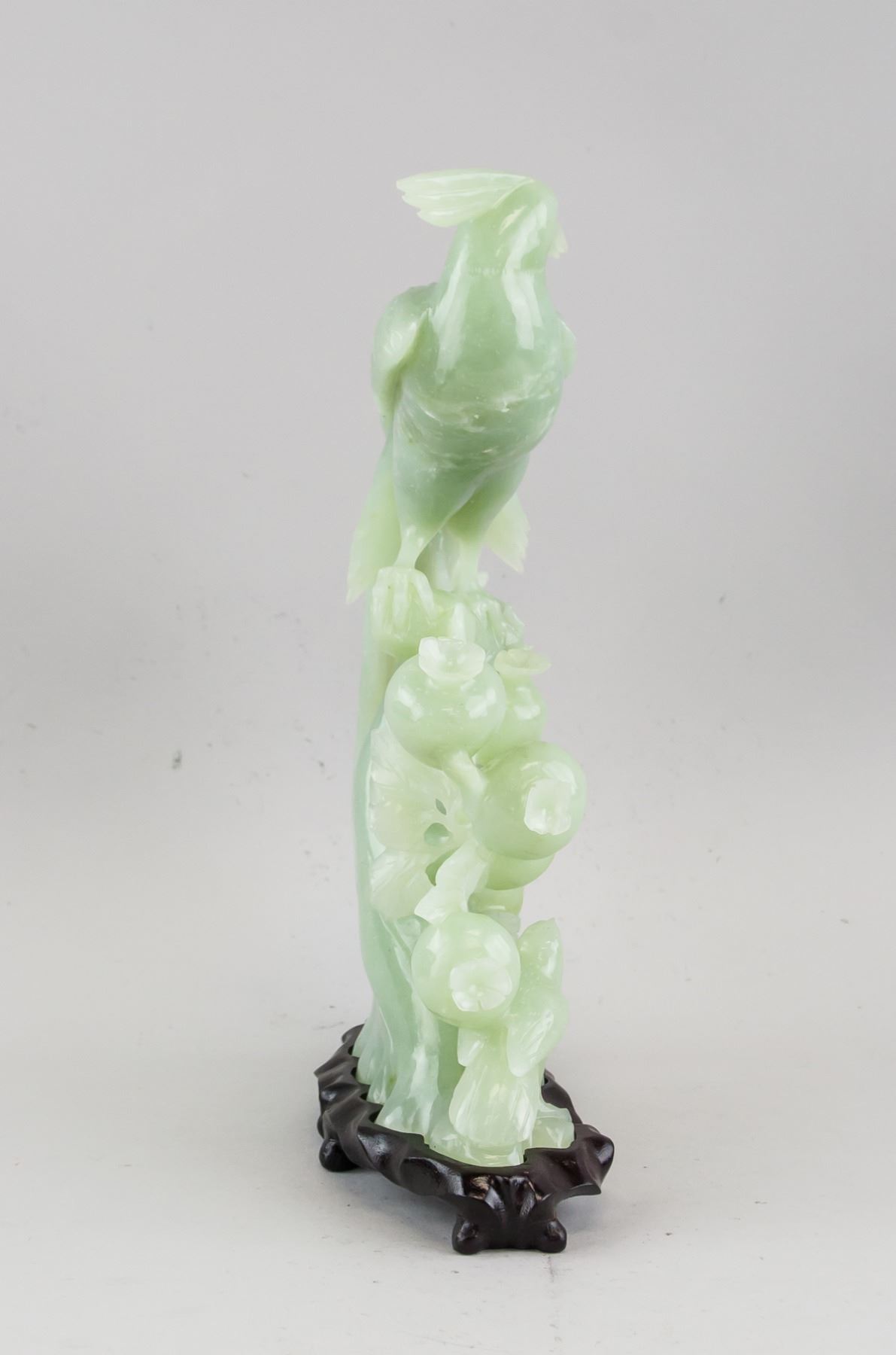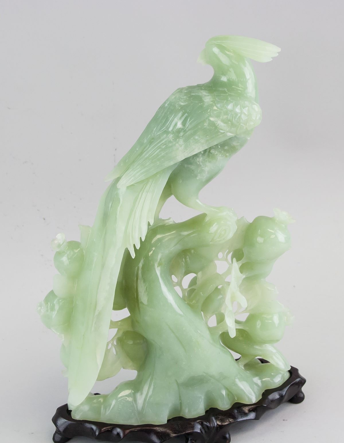 Chinese serpentine stone carved decoration, featuring pheasant standing on pomegranate and flowers, with customized wood base. 28 x 19 cm, 1861 grams