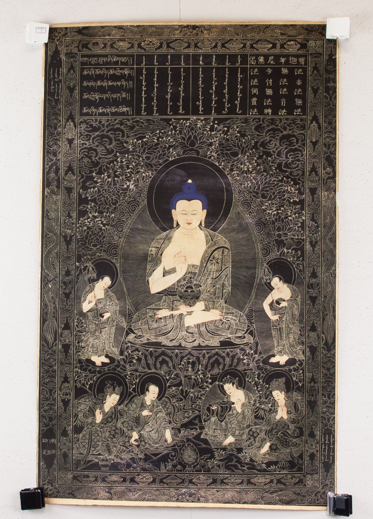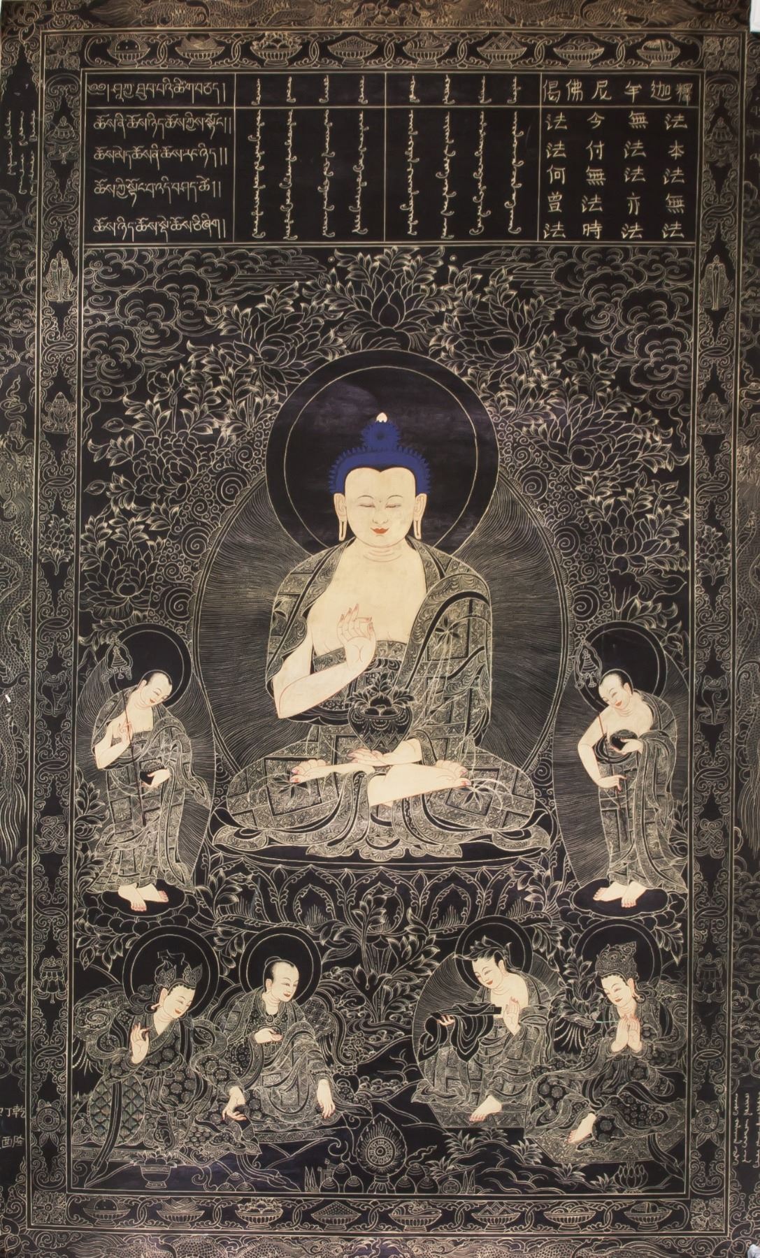 Chinese gilt thanka print; depicting Shakyamuni Buddha with disciples; black paper roll; with inscription in Chinese, Tibetan and Manchurian; 88 cm x 55 cm