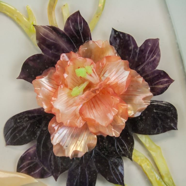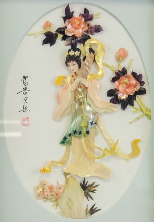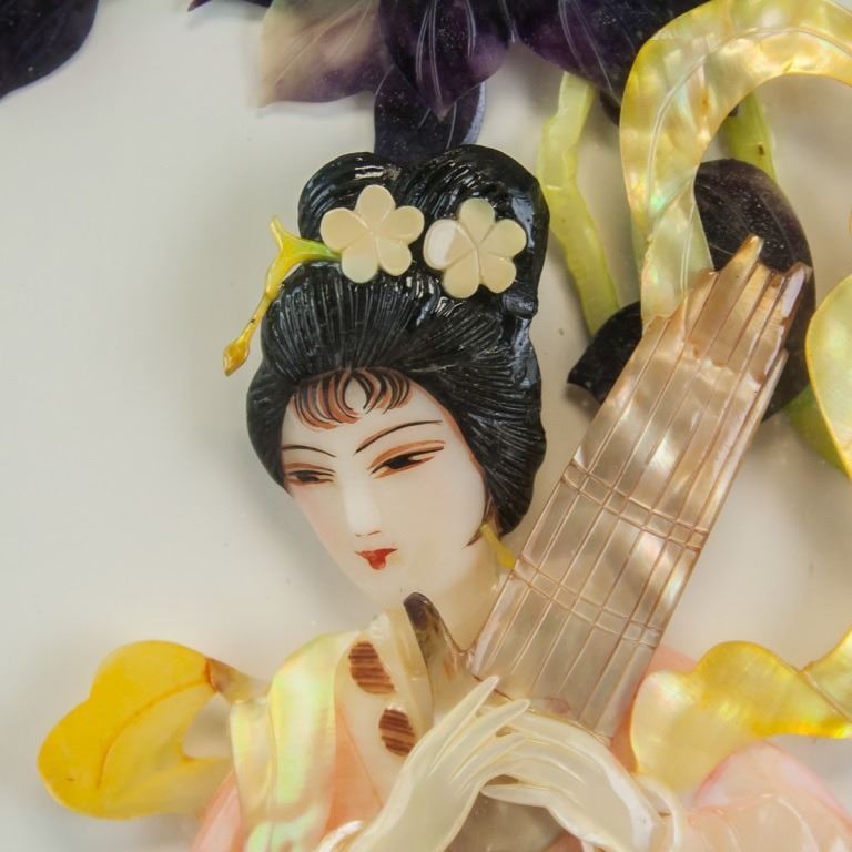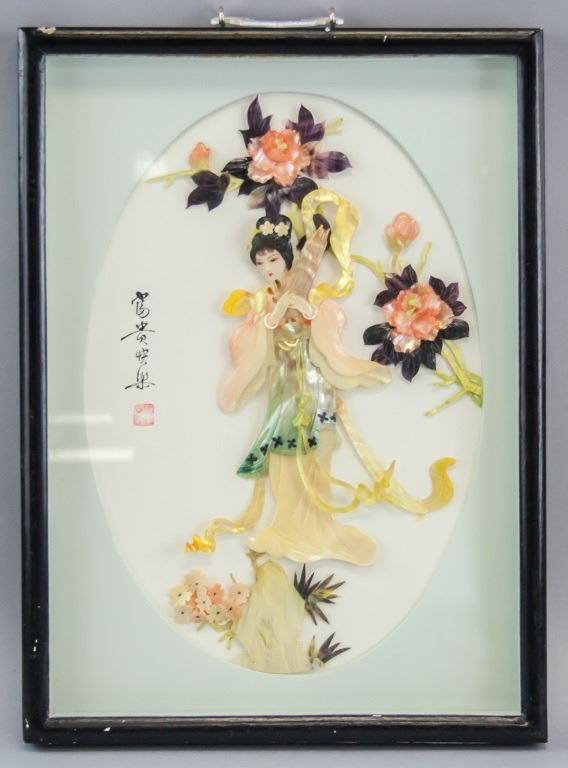 Chinese shell carving, framed. Featuring beauty holding an instrument with flowers in the background. 38 x 28 cm.