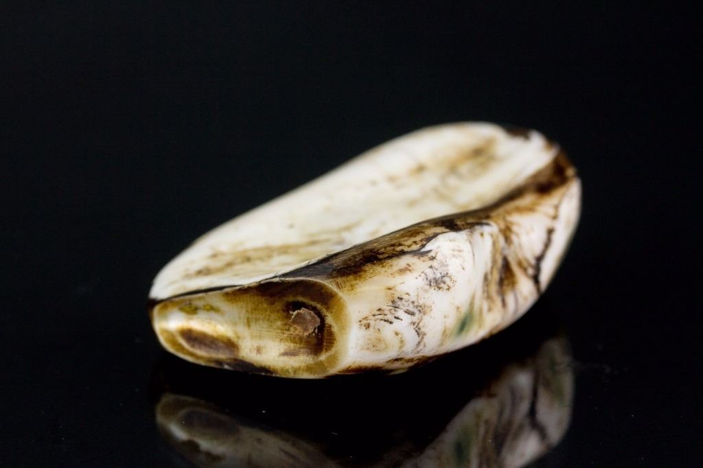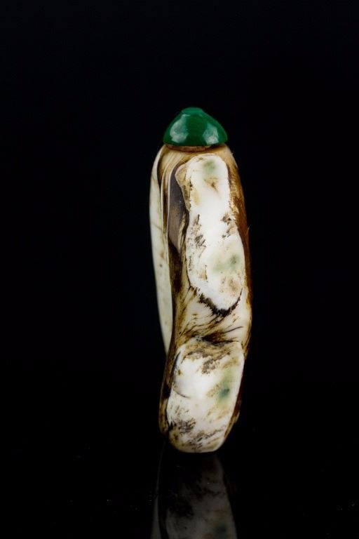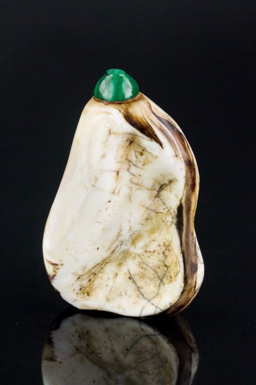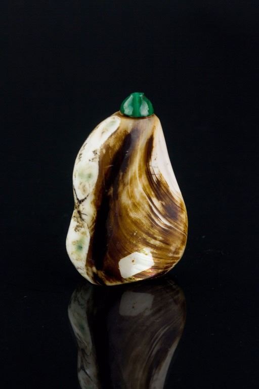 Chinese shell carved stuff bottle; of natural shape shell with green jade cover; of natural shell strip; 7 cm x 4.5 cm, 75 grams
