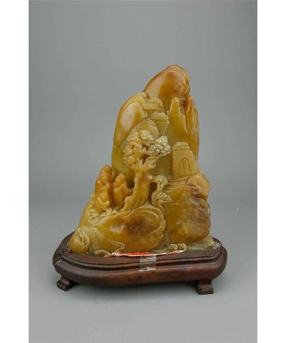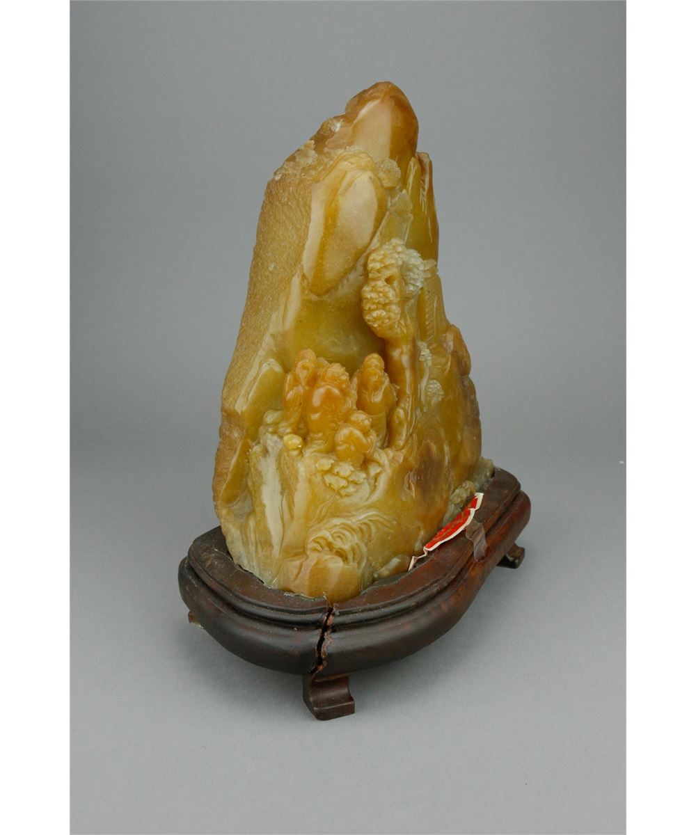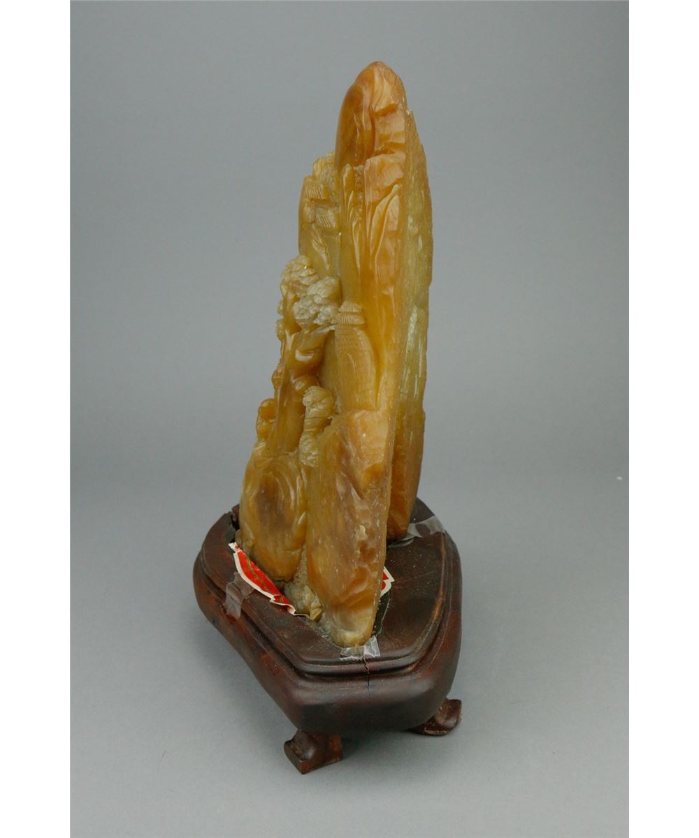 Chinese Shoushan stone carved large boulder; featuring carvings of figures, pine trees and village in low-relief; of mixed yellow tone; custom wood stand included; H: 25 cm, W: 18.5 cm, 3486 grams with stand