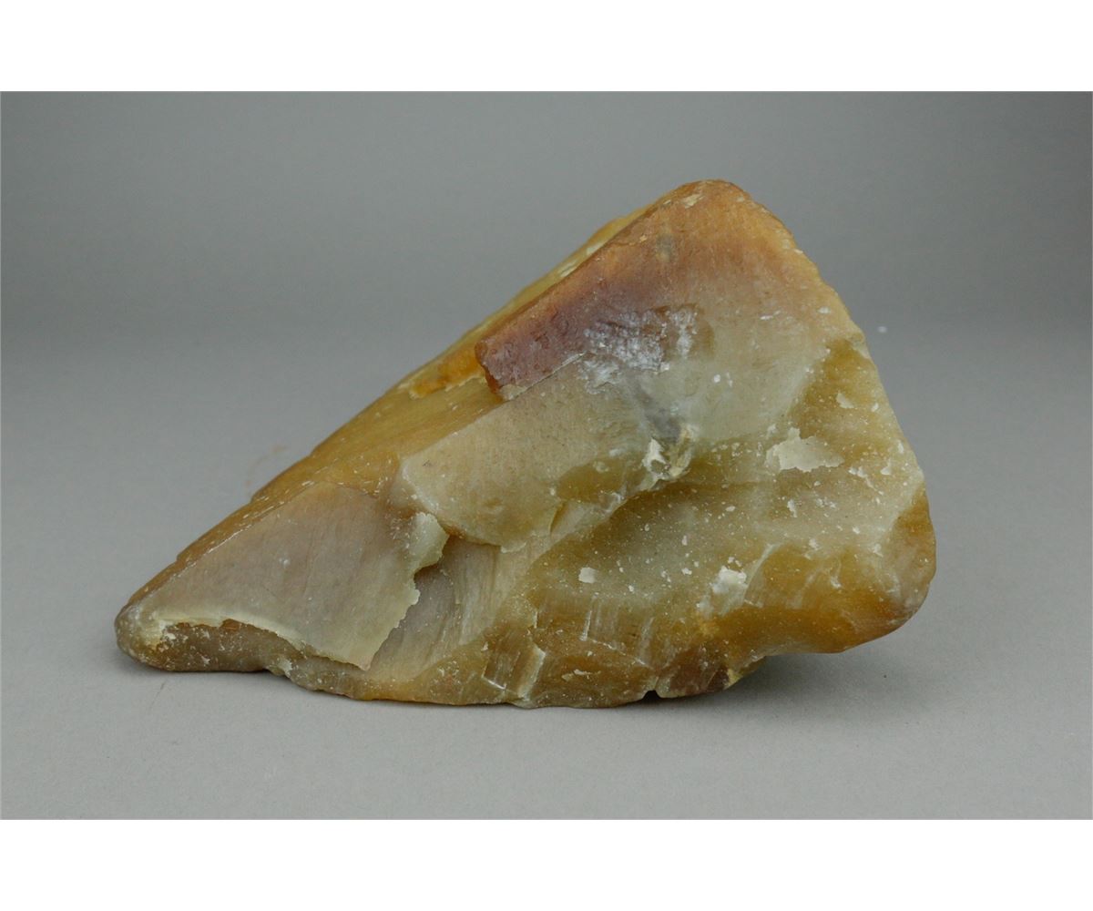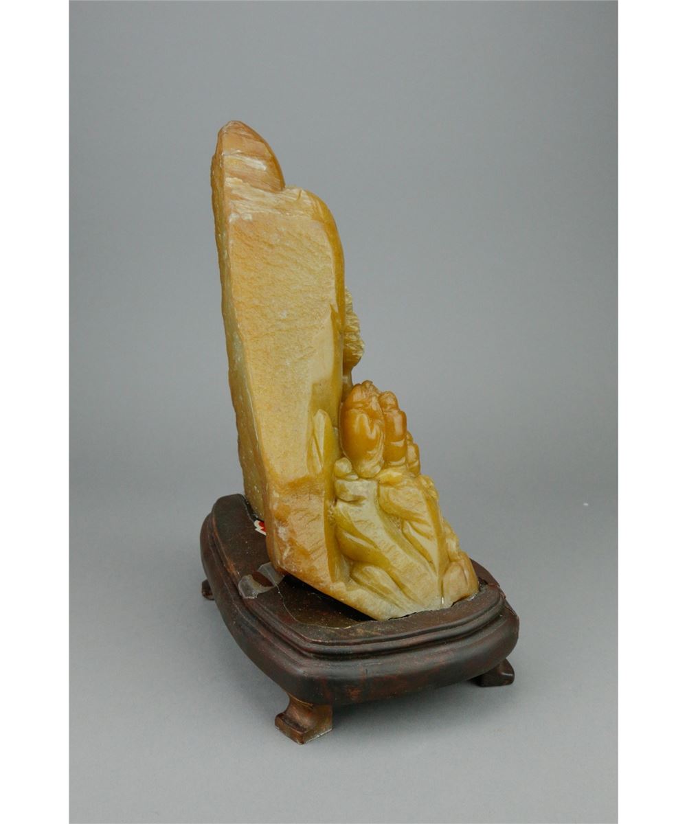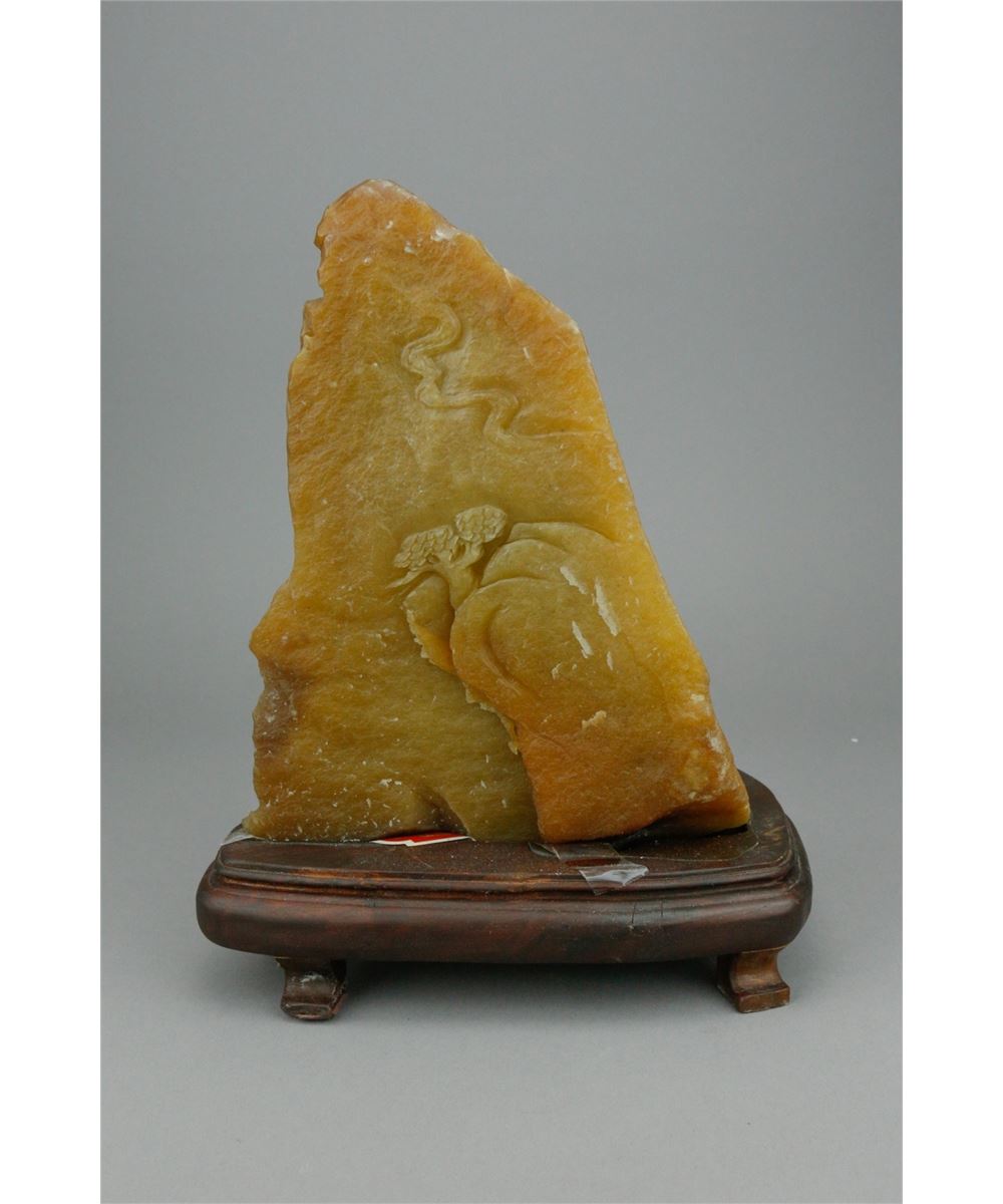 Chinese Shoushan stone carved large boulder; featuring carvings of figures, pine trees and village in low-relief; of mixed yellow tone; custom wood stand included; H: 25 cm, W: 18.5 cm, 3486 grams with stand