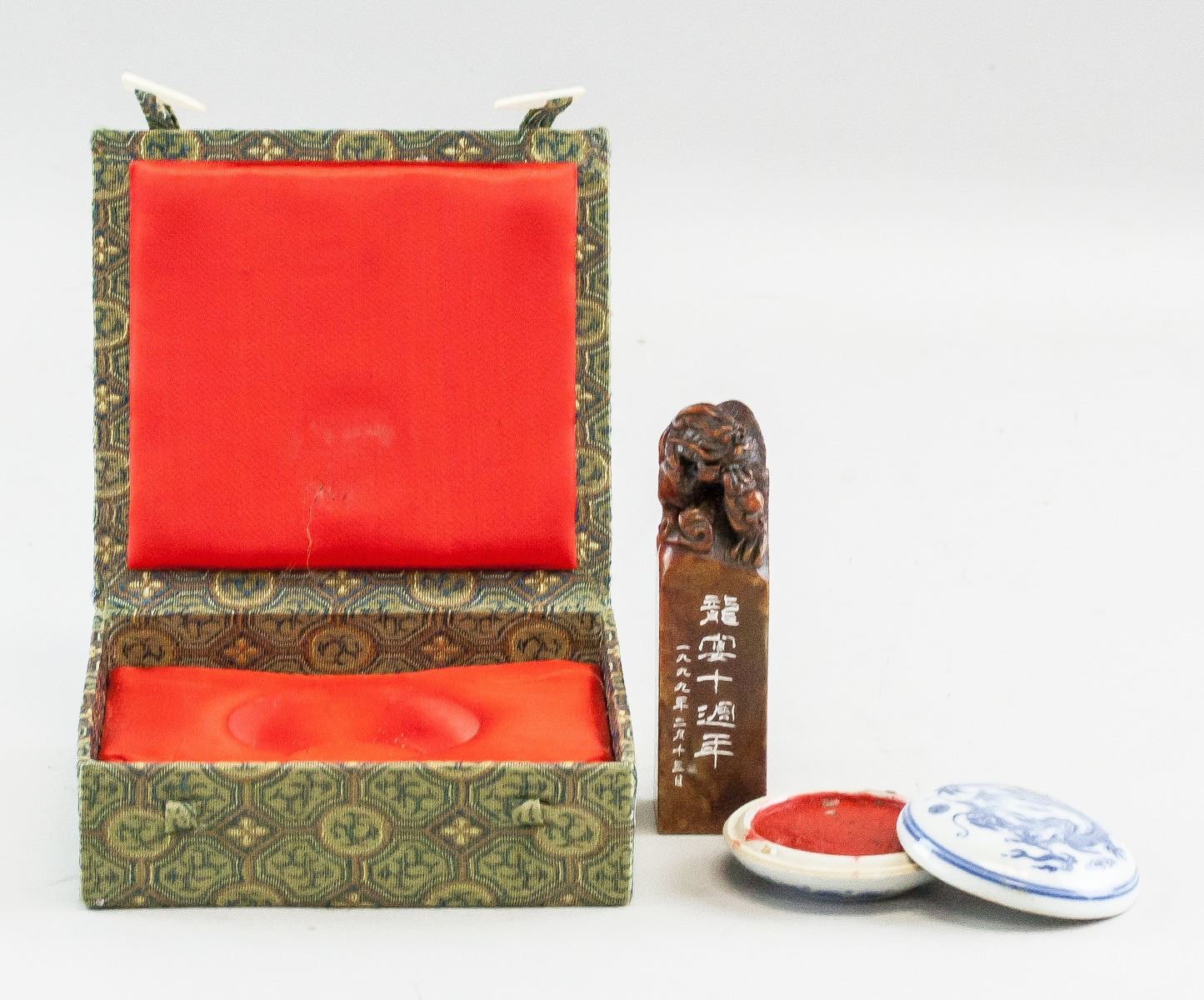 Chinese Shoushan stone seal with red ink. Seal featuring a dragon form. Lettering Long Yan Shi Zhou Nian and dated February 13, 1999. Empty seal face. Red ink in round porcelain case. Four-character Qing dynasty Qianlong mark on base. Seal: 12 x 3 cm, Stamp pad diameter: 7cm, 528 grams