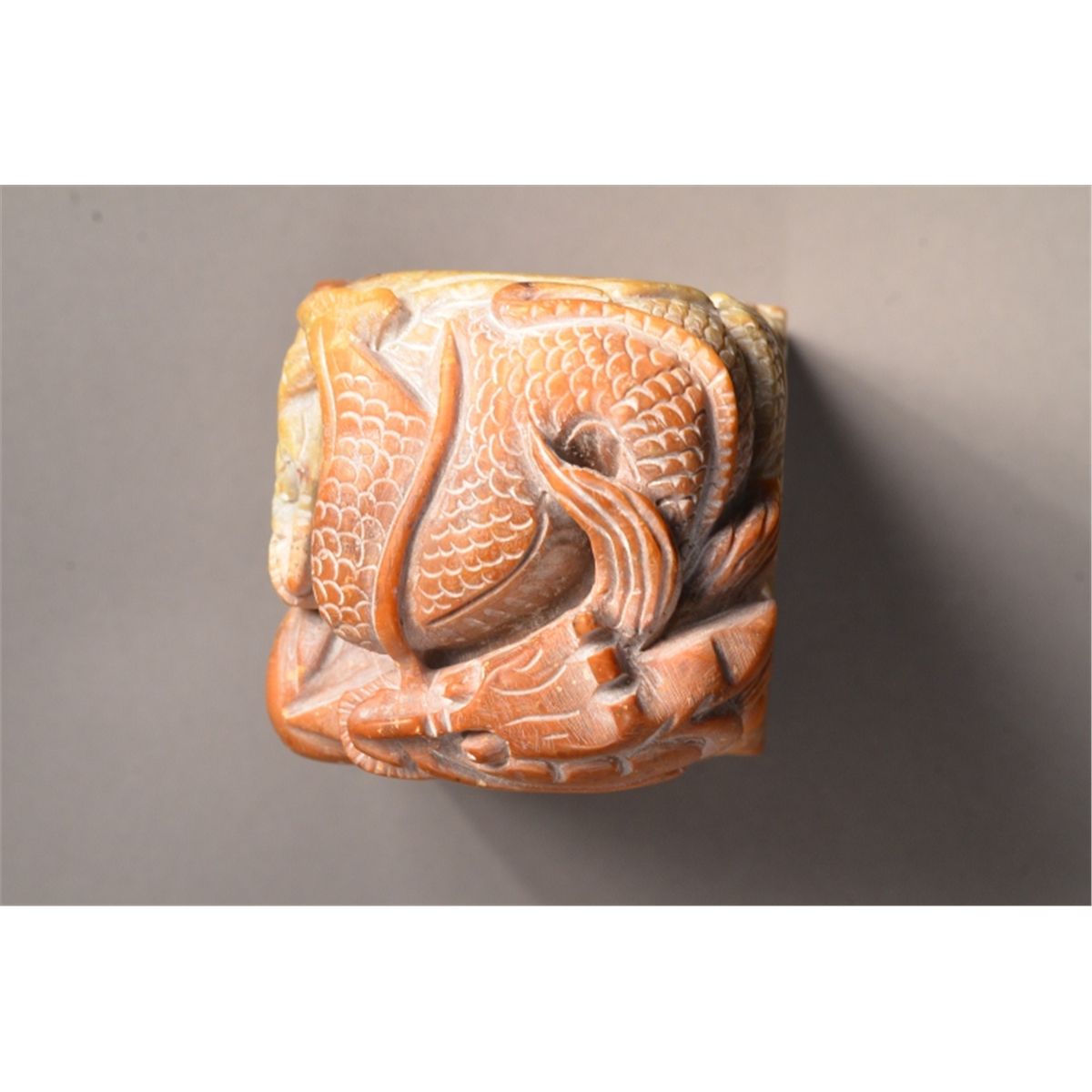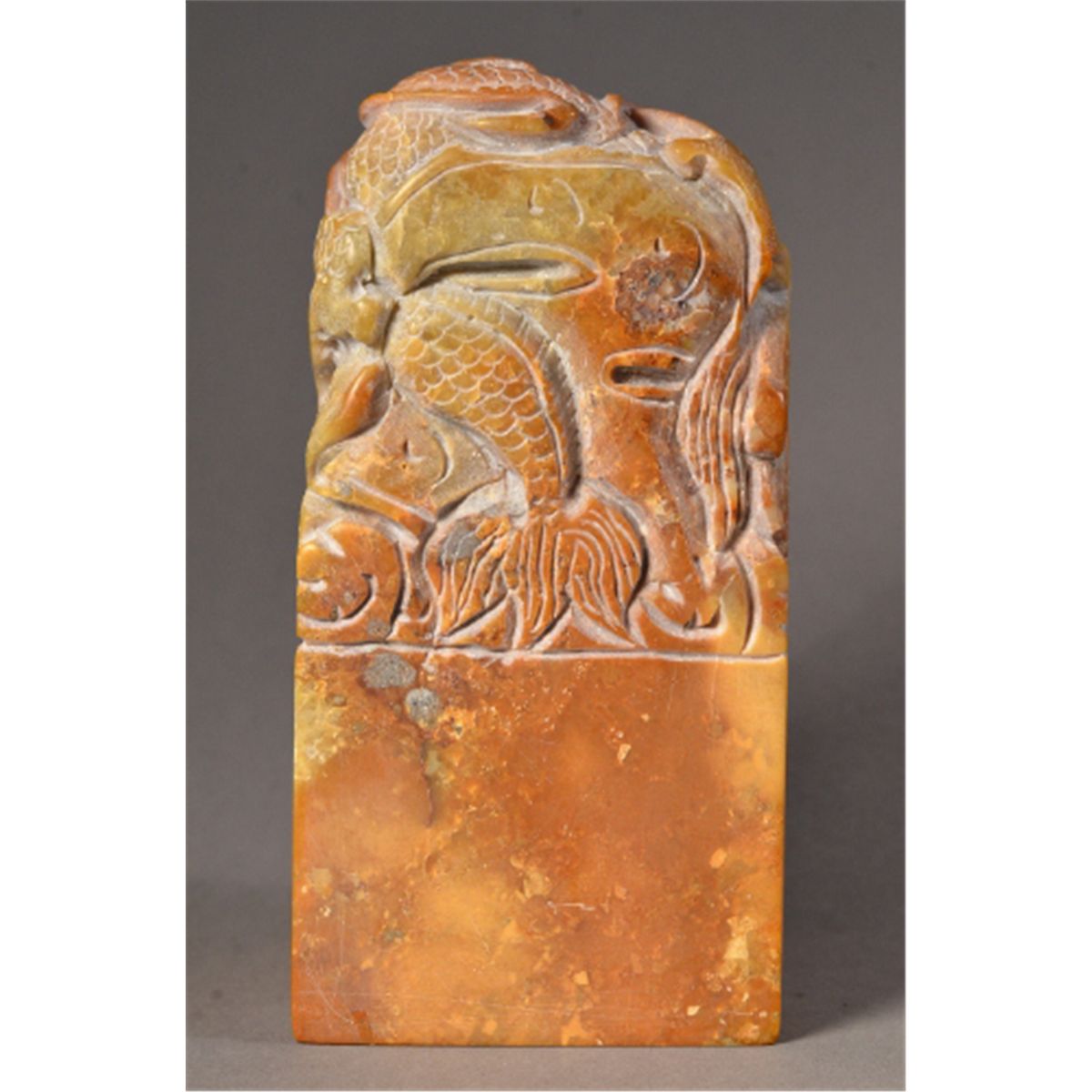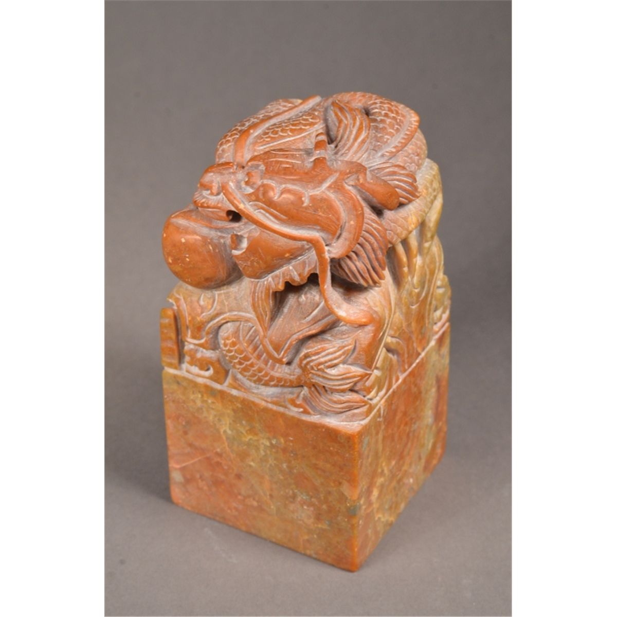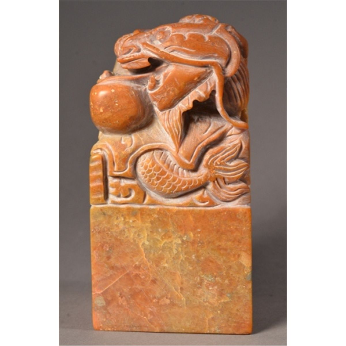 Finely carved, Chinese shoushan block; of square form surmounted by finely carved dragon in relief chasing pearl; 5" tall, 2 1/2" wide