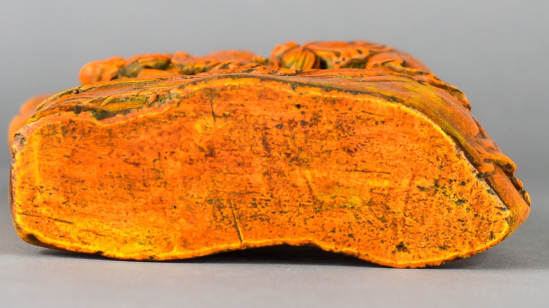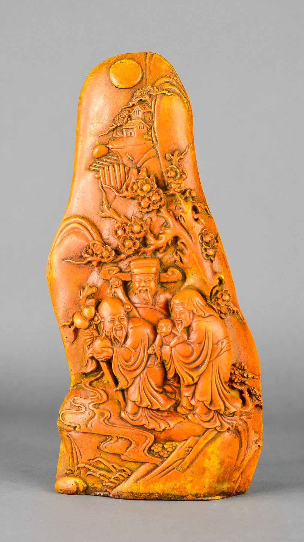 Chinese boulder carving; featuring fu, lu, shou immortals in relief; H: 22.5 cm, 1042 grams
