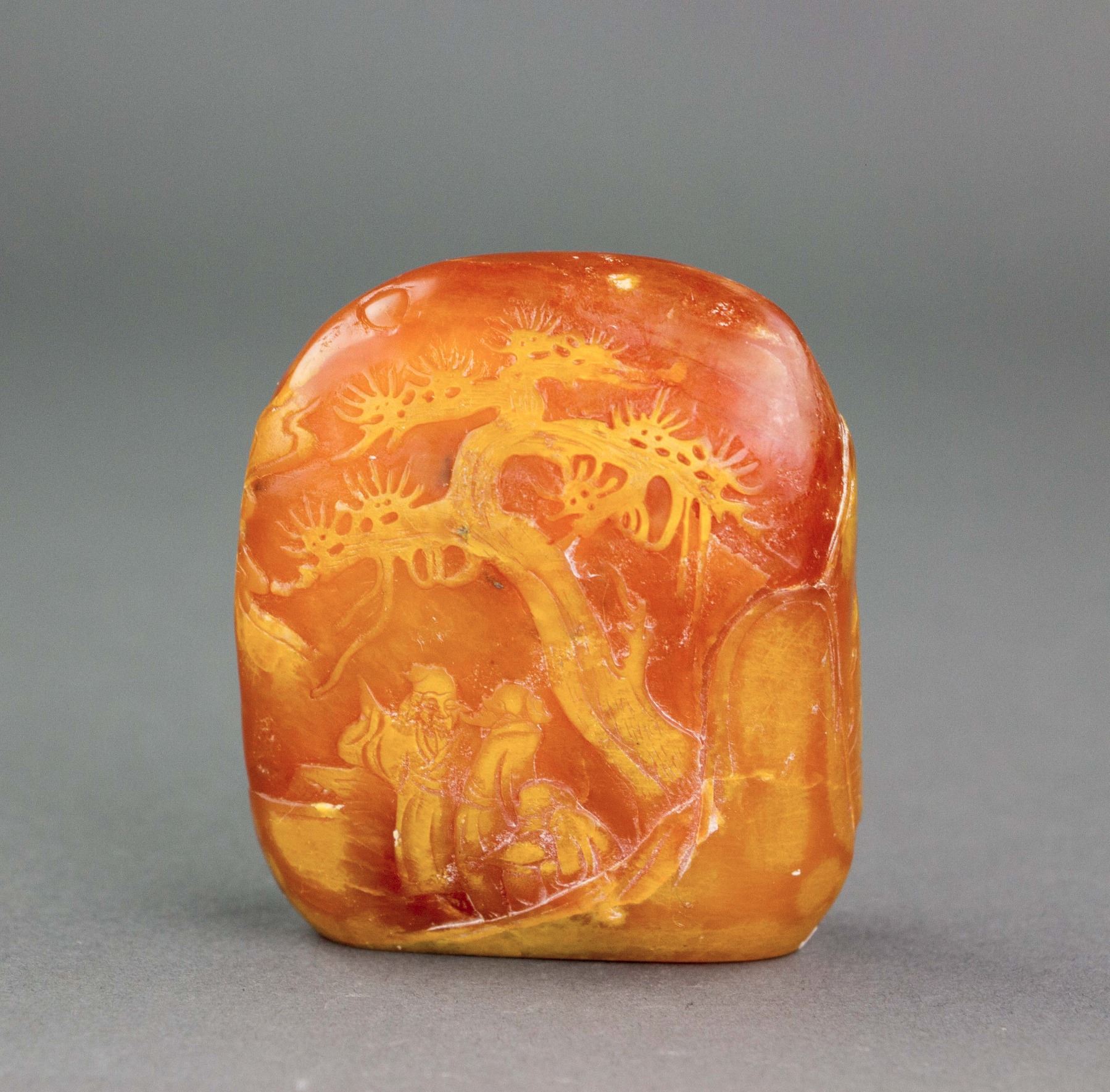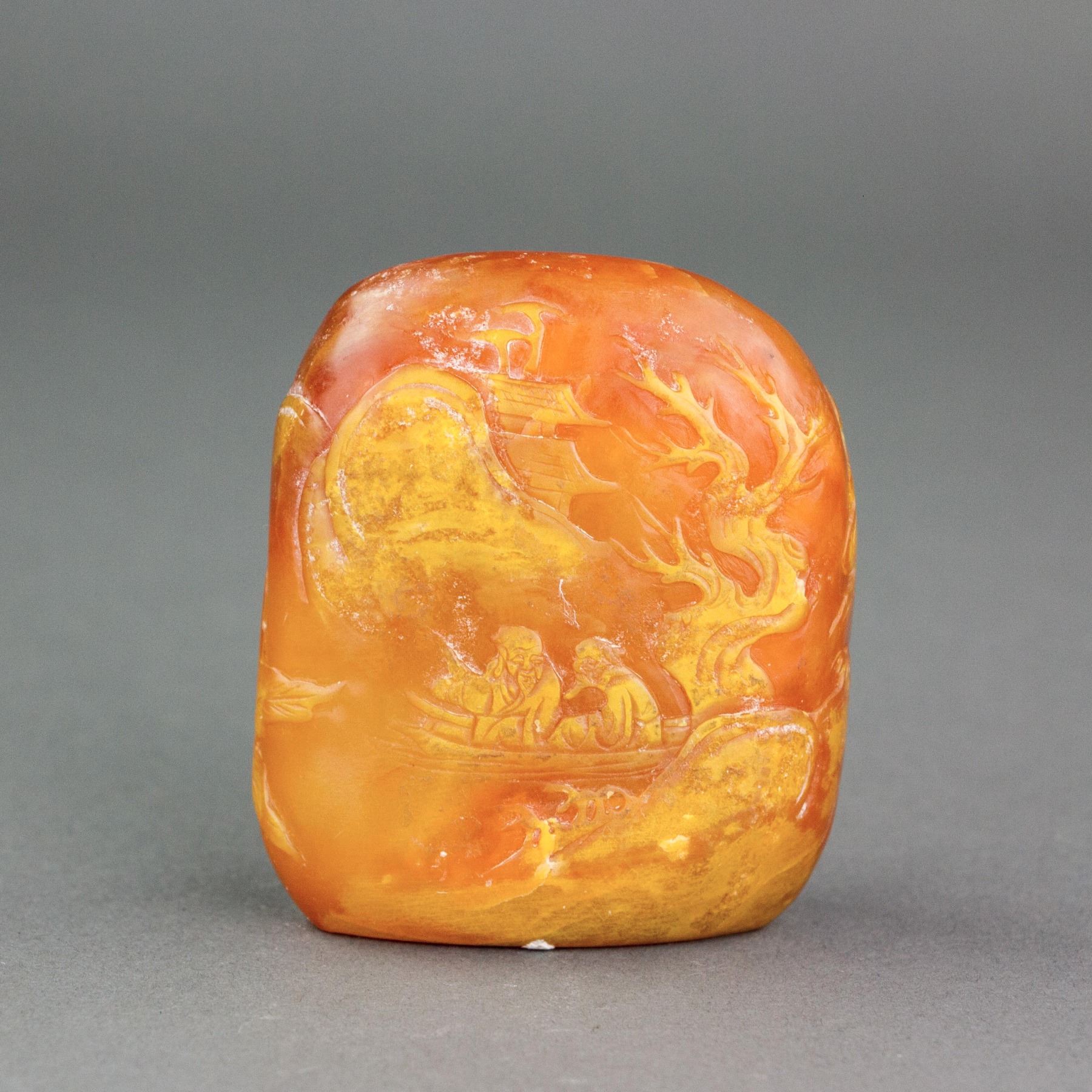 Chinese shoushan stone carved boulder; of natural stone form with flat bottom; carved with mountainous landscape and figure on boat; 7 cm x 6 cm, 235 grams