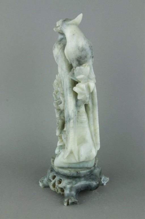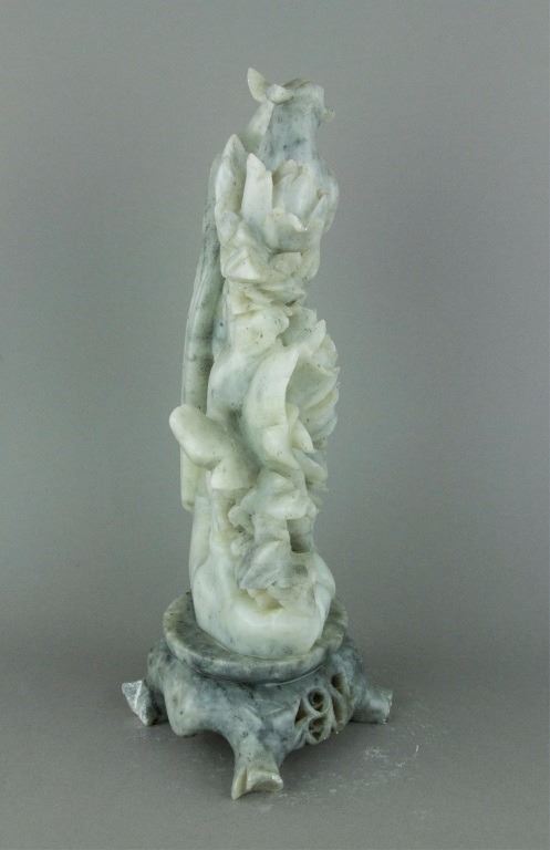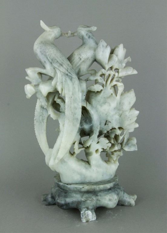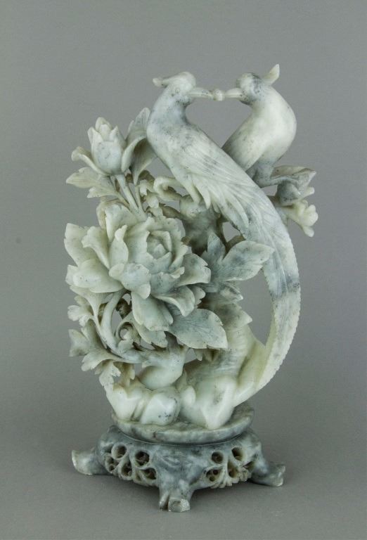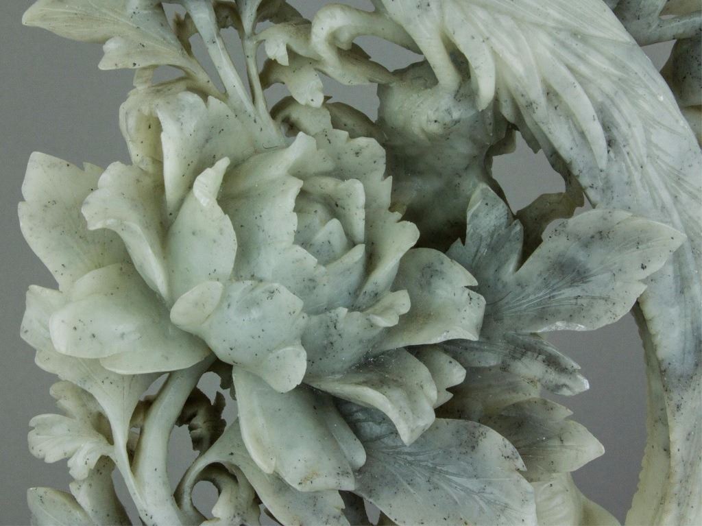 Chinese Shoushan stone carved figure; openwork carved with double pheasants perching on peony branches; of white tone with light grey suffusions; H: 30.5 cm, W: 13 cm, L: 15.5 cm, 3316 grams