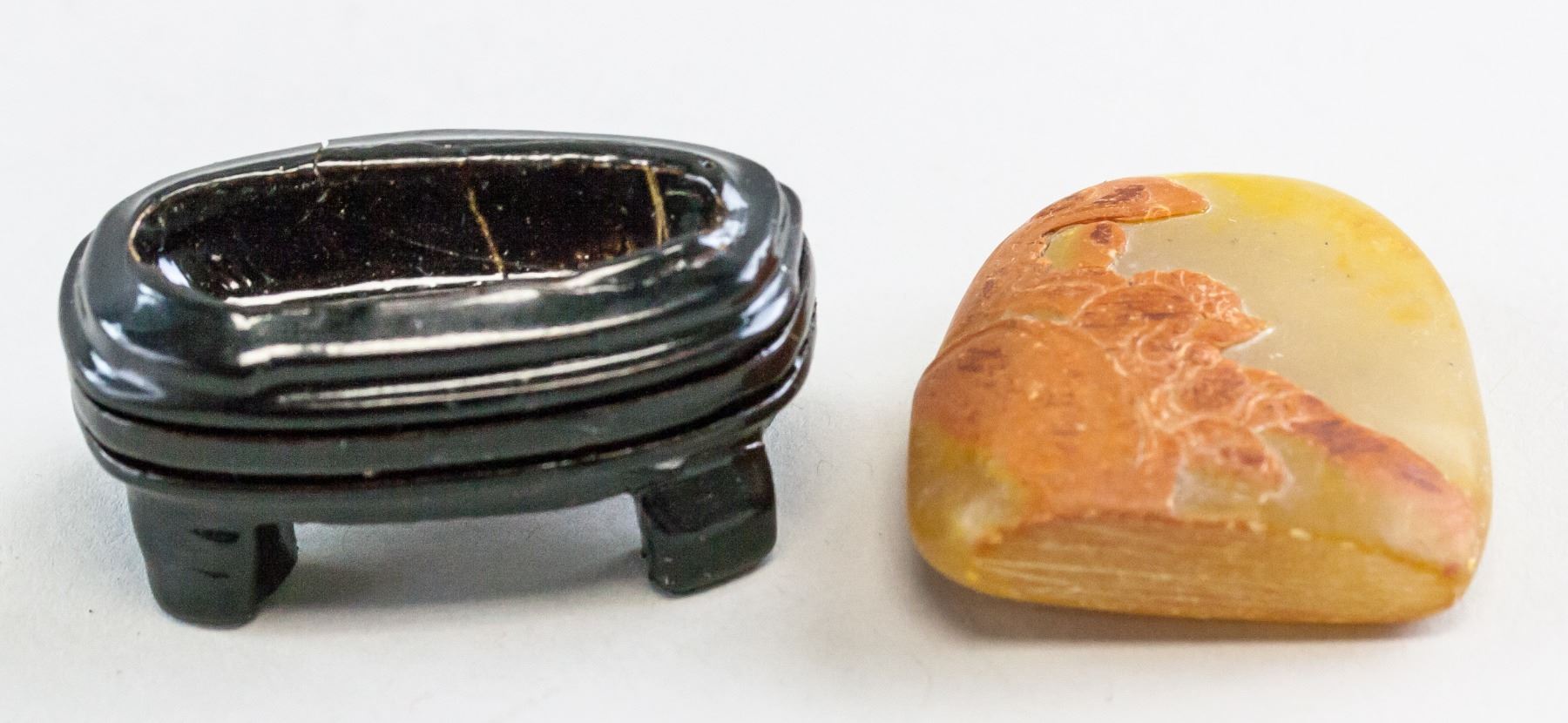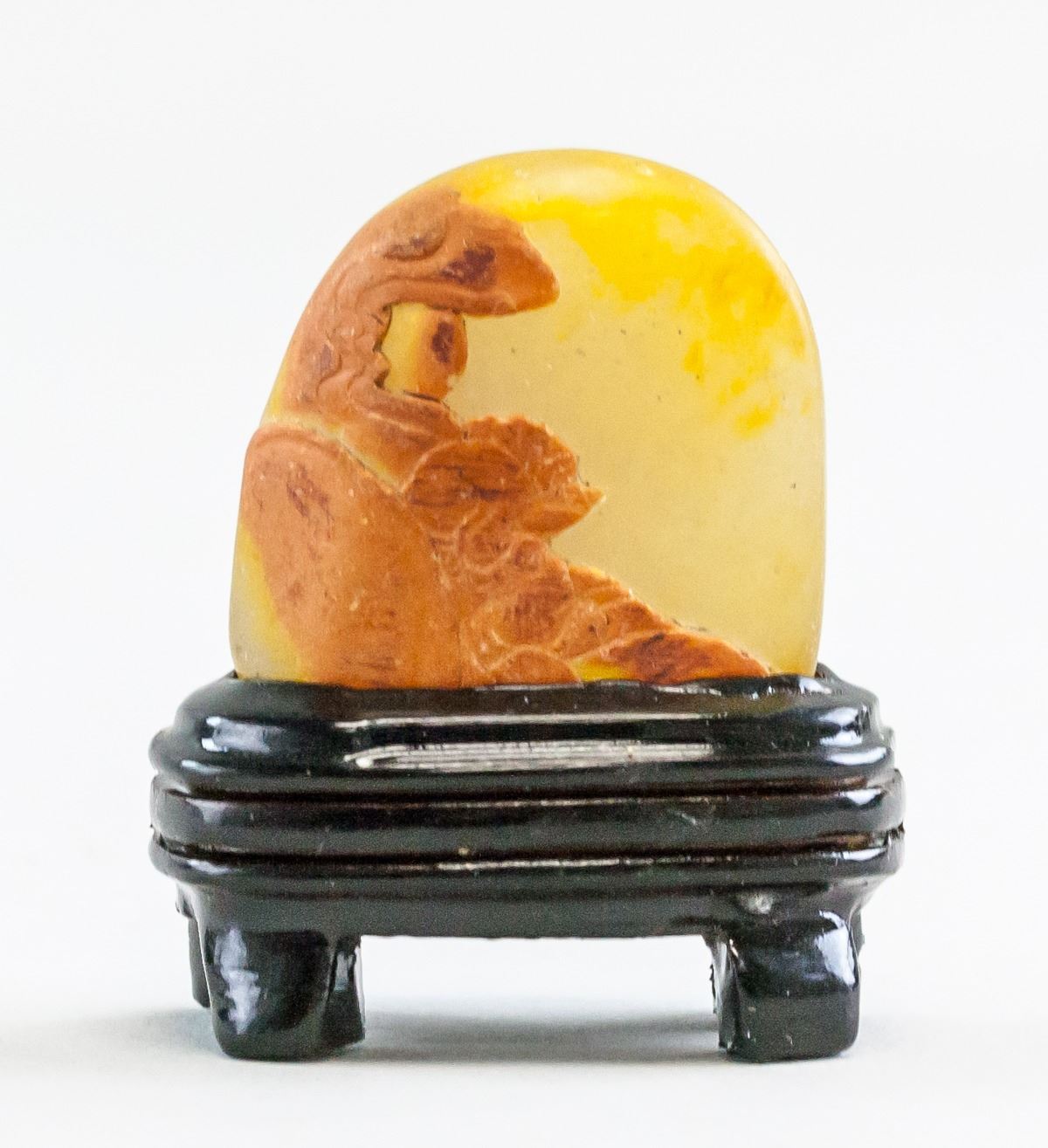 Chinese shoushan stone with stand. Of yellow and brown tone. 4 x 3.5 cm, 32 grams.