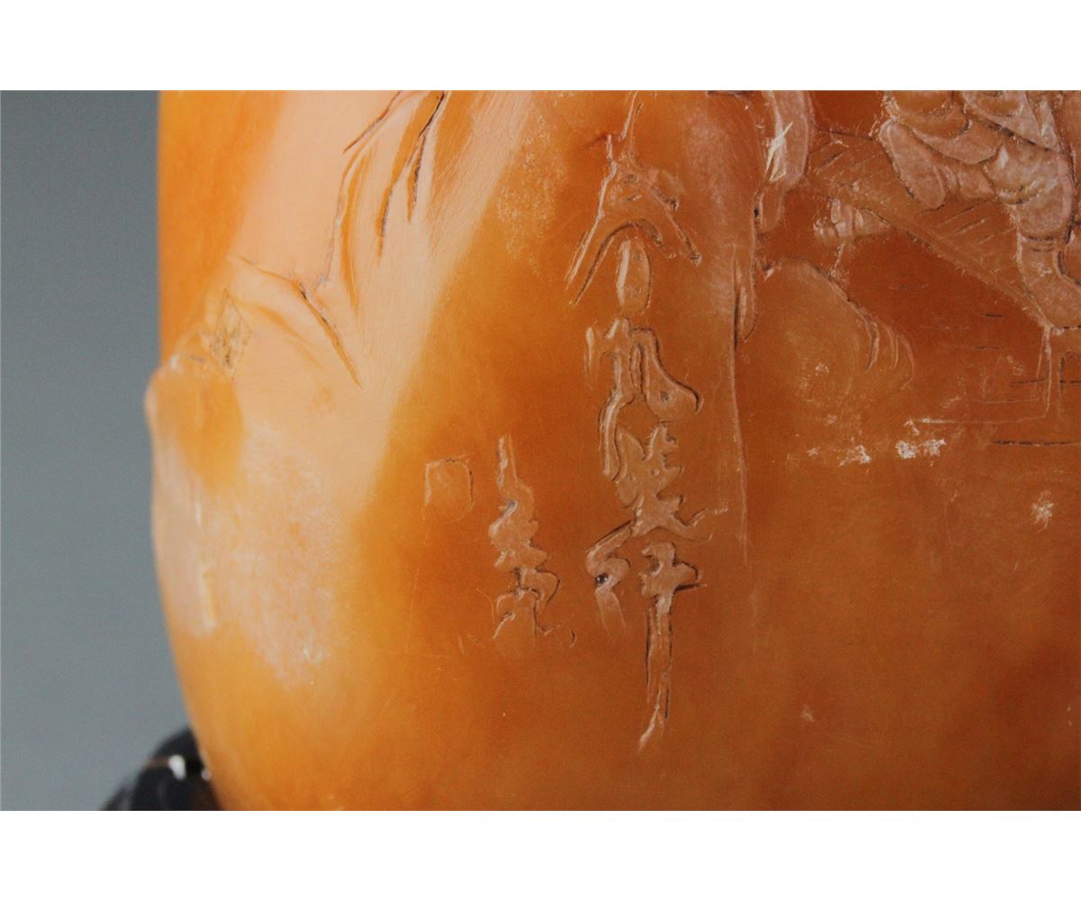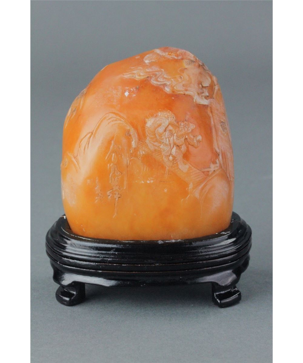 Chinese carved shoushan stone boulder; featuring landscape scene in relief; of light caramel tone; with custom-made stand; H: 9 cm, W: 7 cm, 493 grams