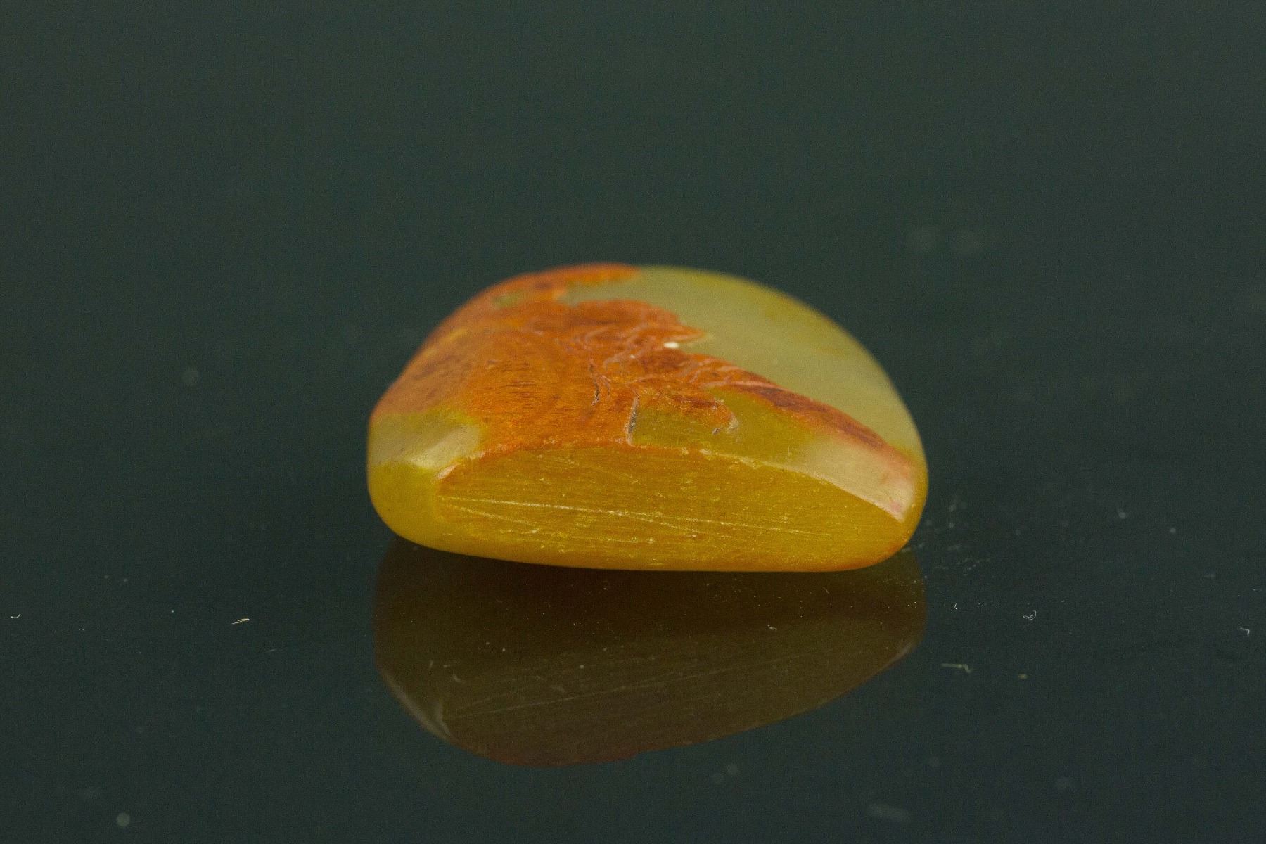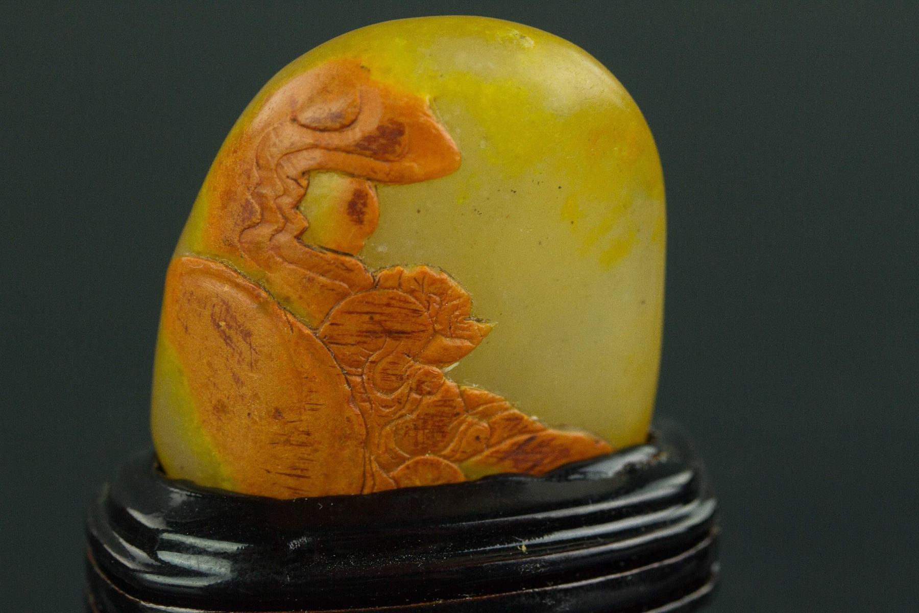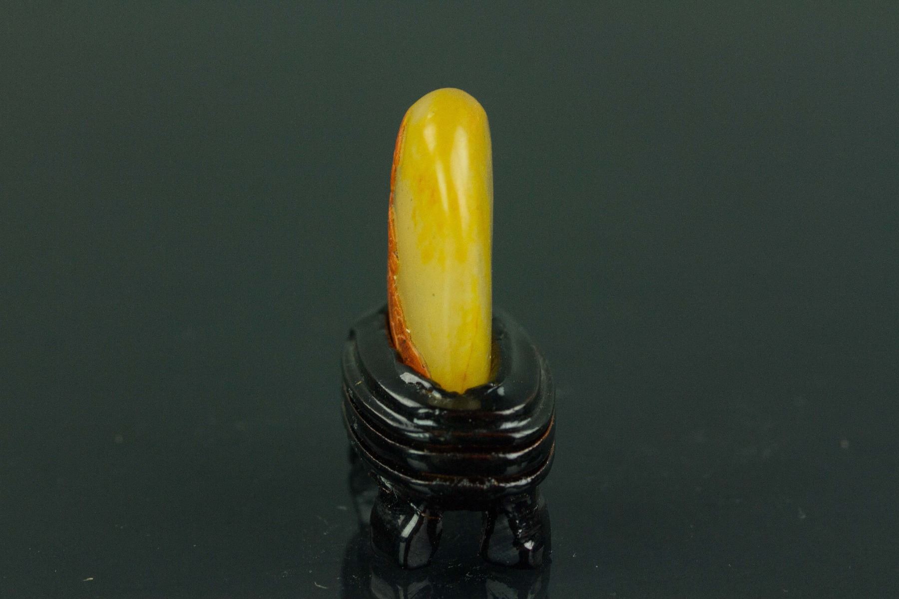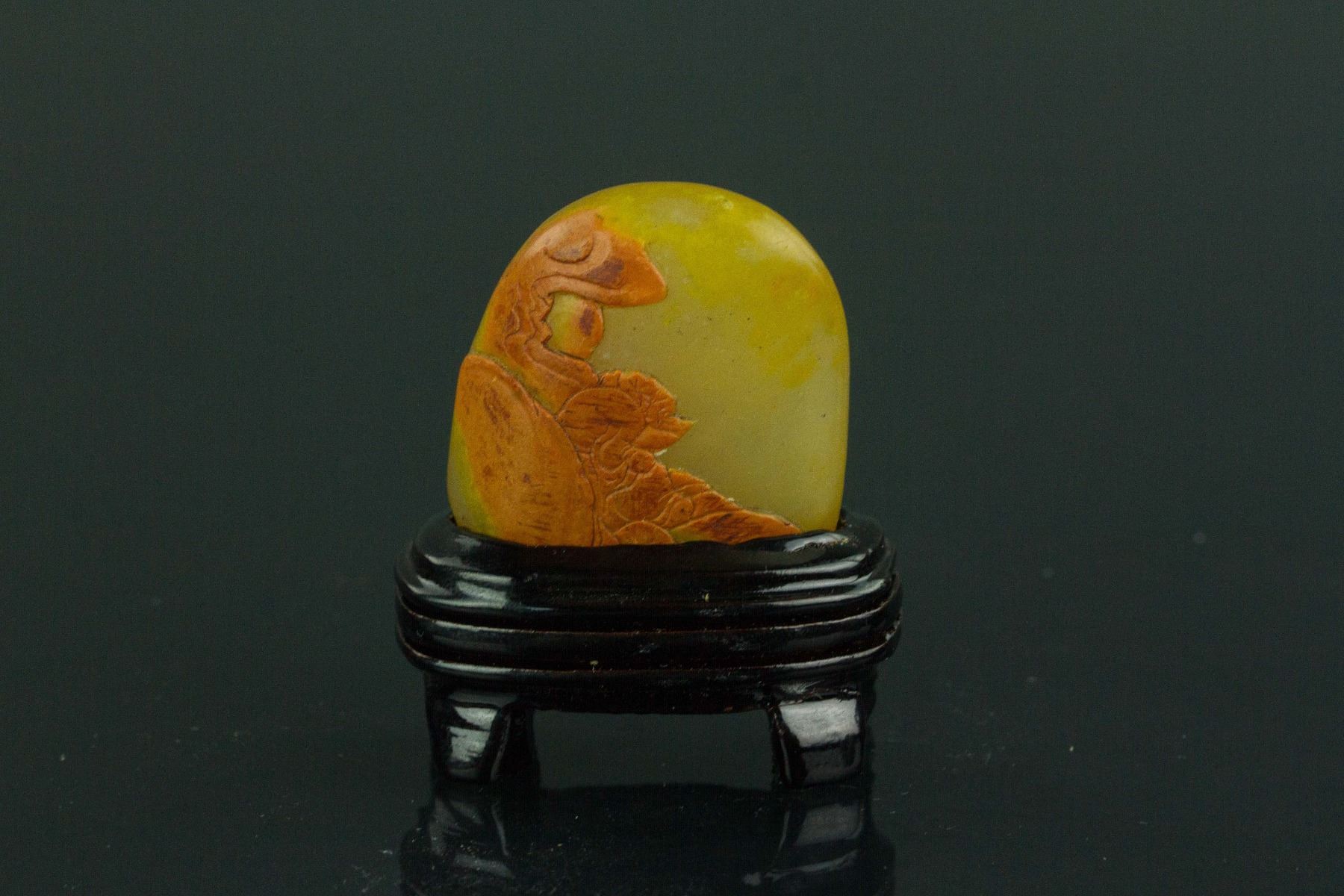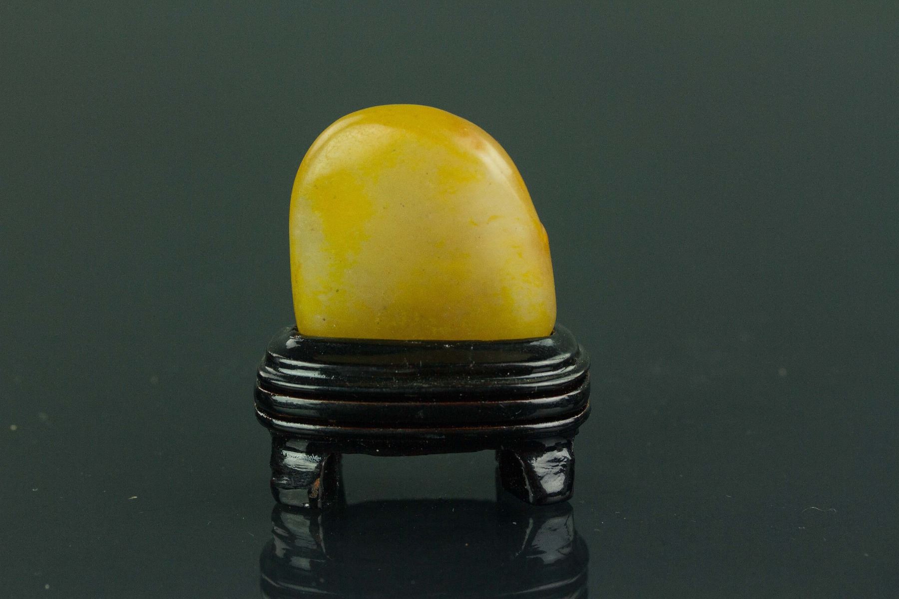 Chinese Shoushan stone boulder; of flatten pebble form; carved with an elderly figure seated on craggy rock; the stone of orange and yellow tone; custom-made wood stand included; H: 3.5 cm, W: 0.8 cm, L: 3.5 cm, 31 grams