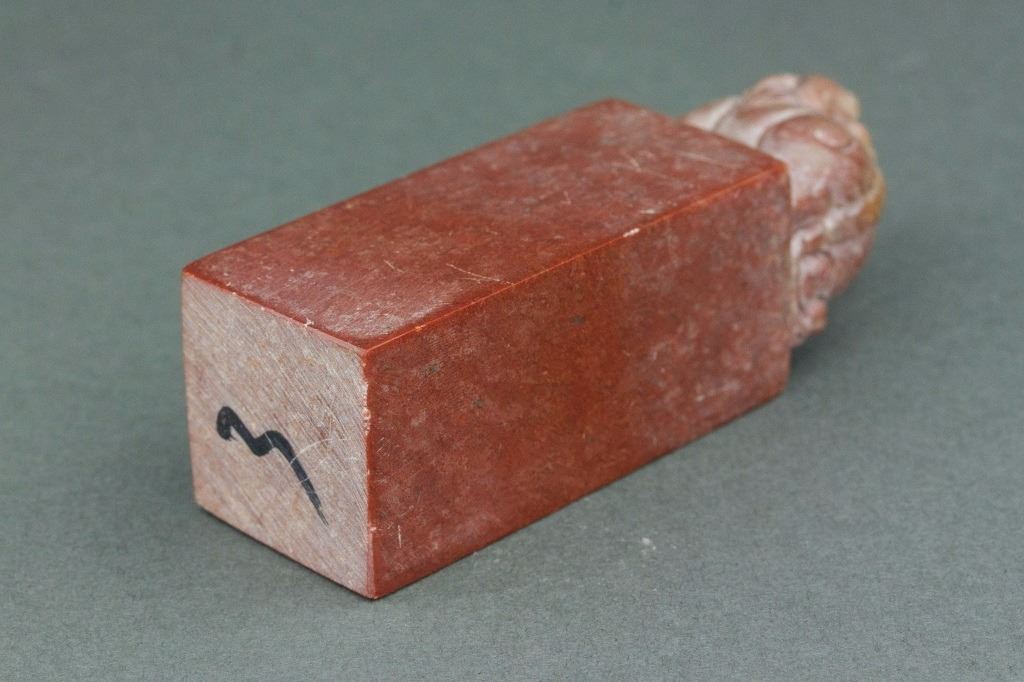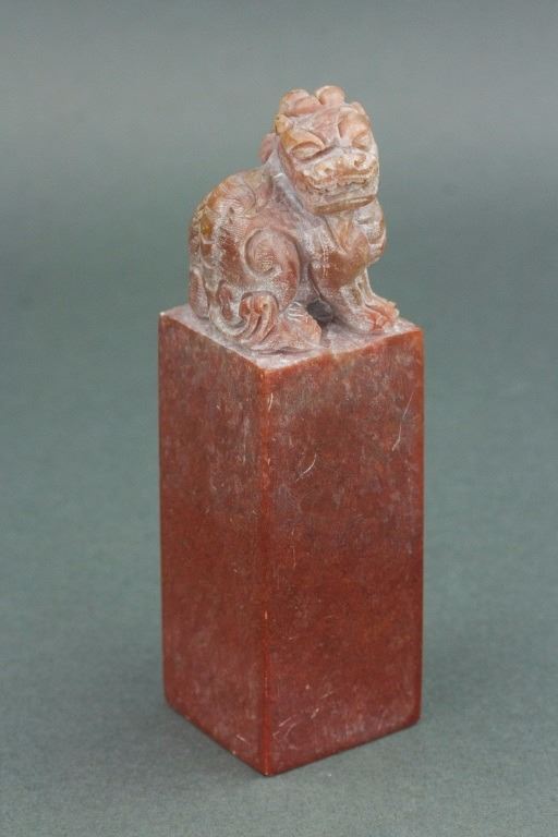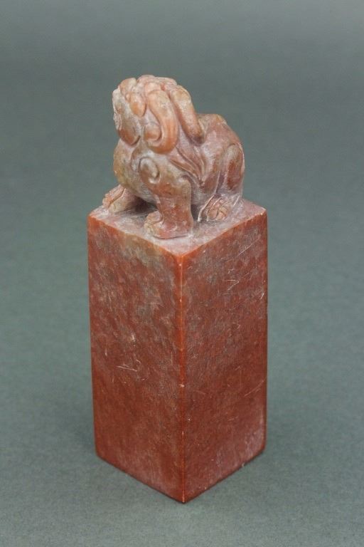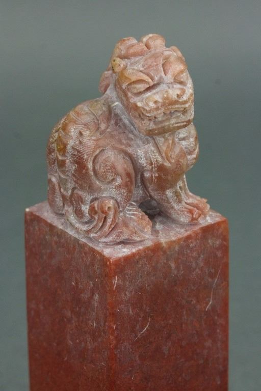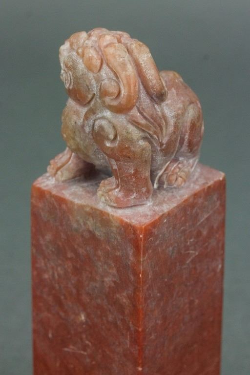 Chinese shoushan stone carved mythical beast seal; of square cylinder shape with carved mythical beast sitting on top; empty seal base; H: 10.5 cm, W: 3 cm, L: 3 cm, 234 grams