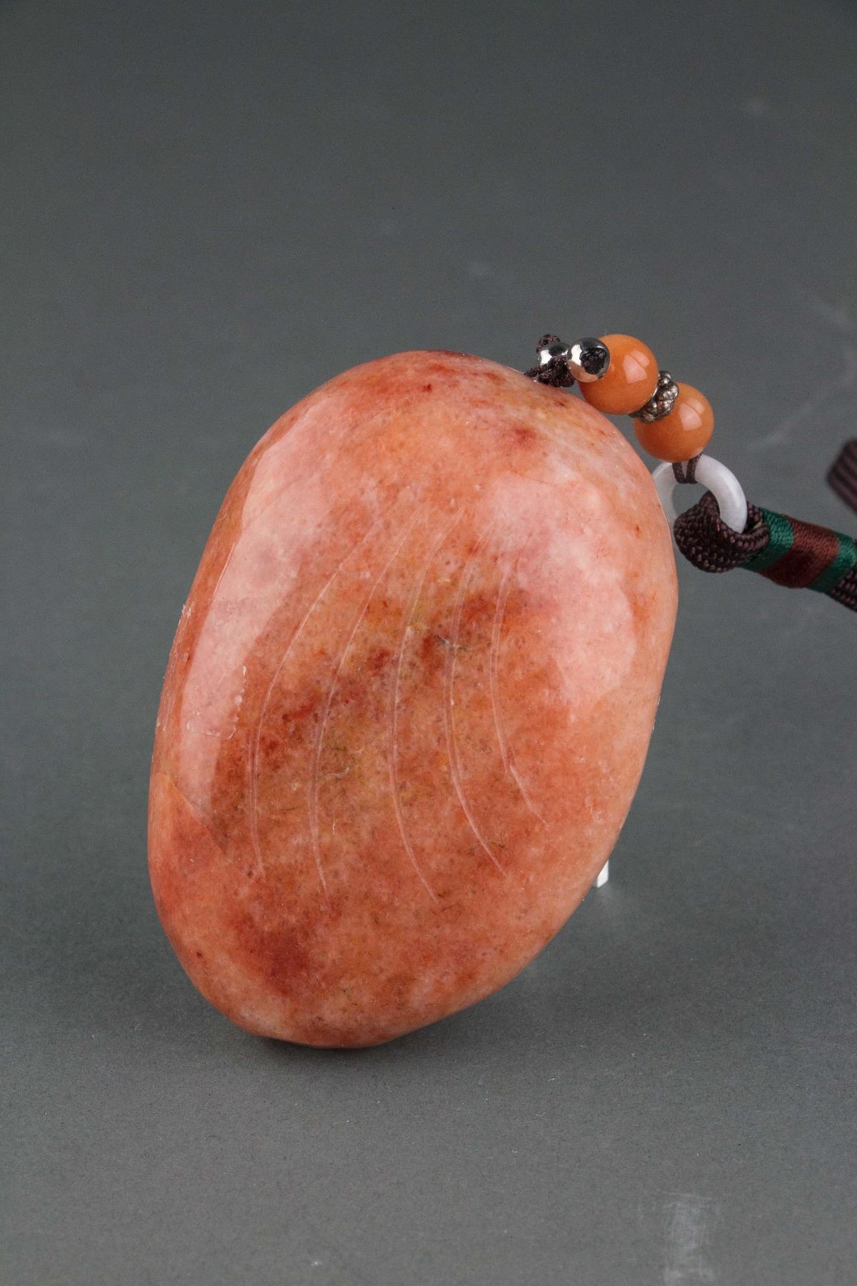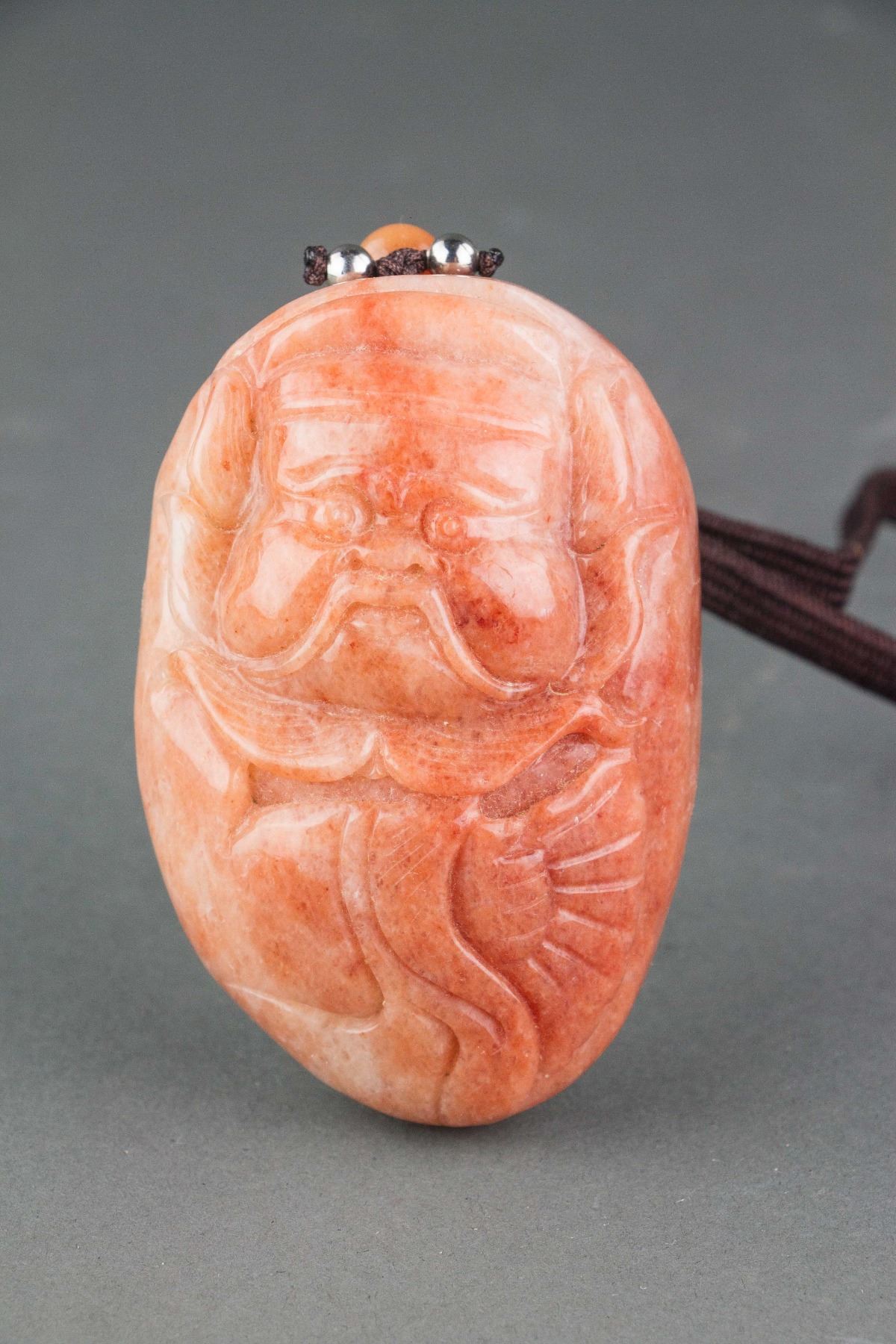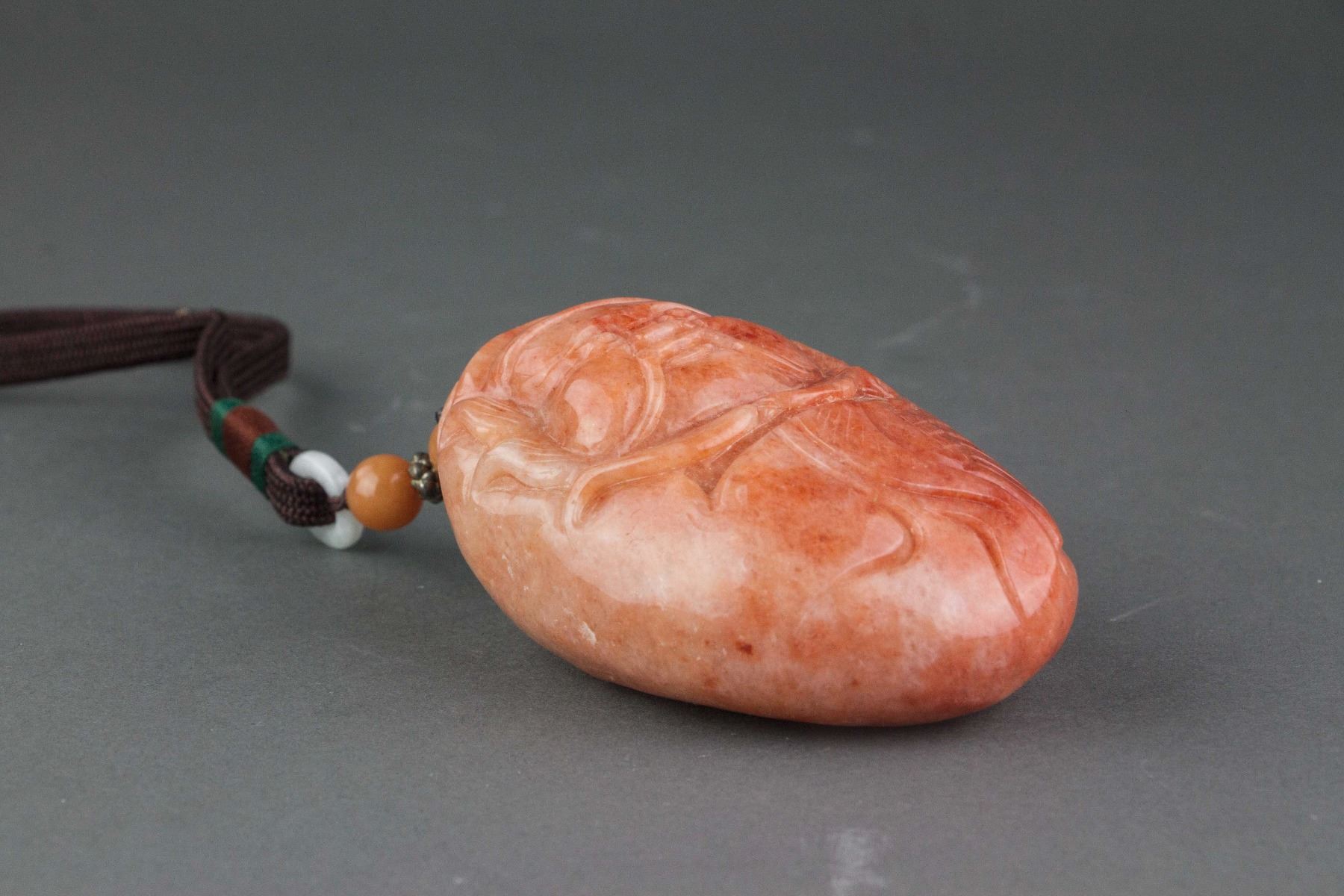 Chinese shoushan stone carved toggle; of natural pebble form; carved with Zhong Kui with fan; pierced for suspension; 10 cm x 6 cm, 390 grams