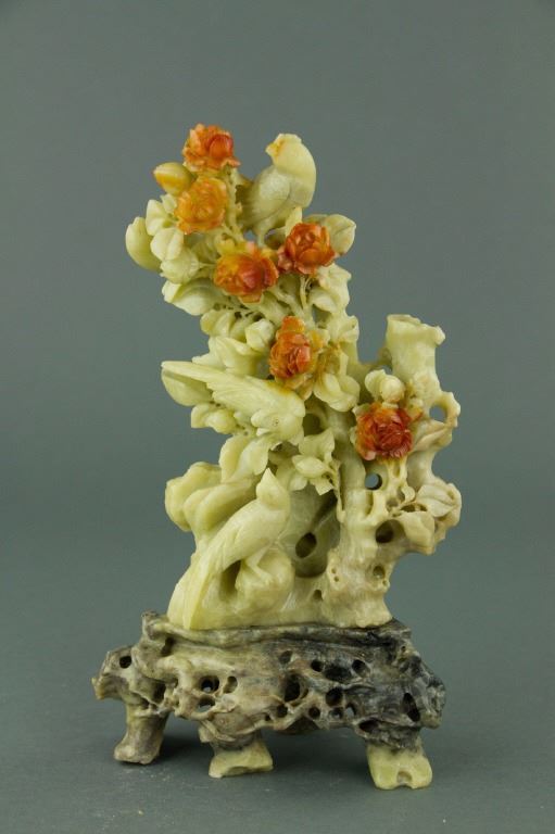 Chinese Shoushan stone carving with carved stand; depicting birds perching on peony branches; the stone of light yellow and orange tone; H: 24 cm, W: 15 cm, 1197 grams