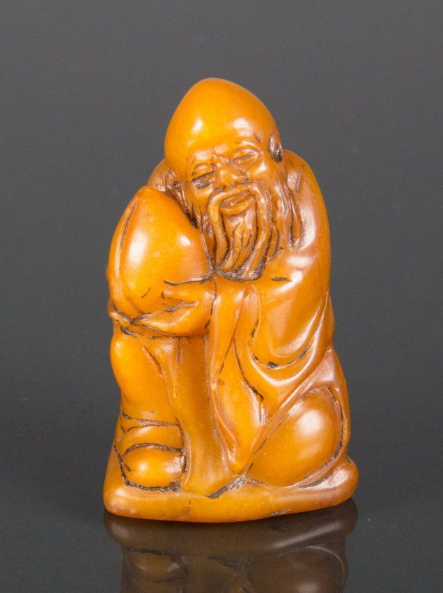 Chinese shoushan stone carved figure of old man holding peach of immortality in relief; H: 7 cm, W: 4 cm, 97 grams
