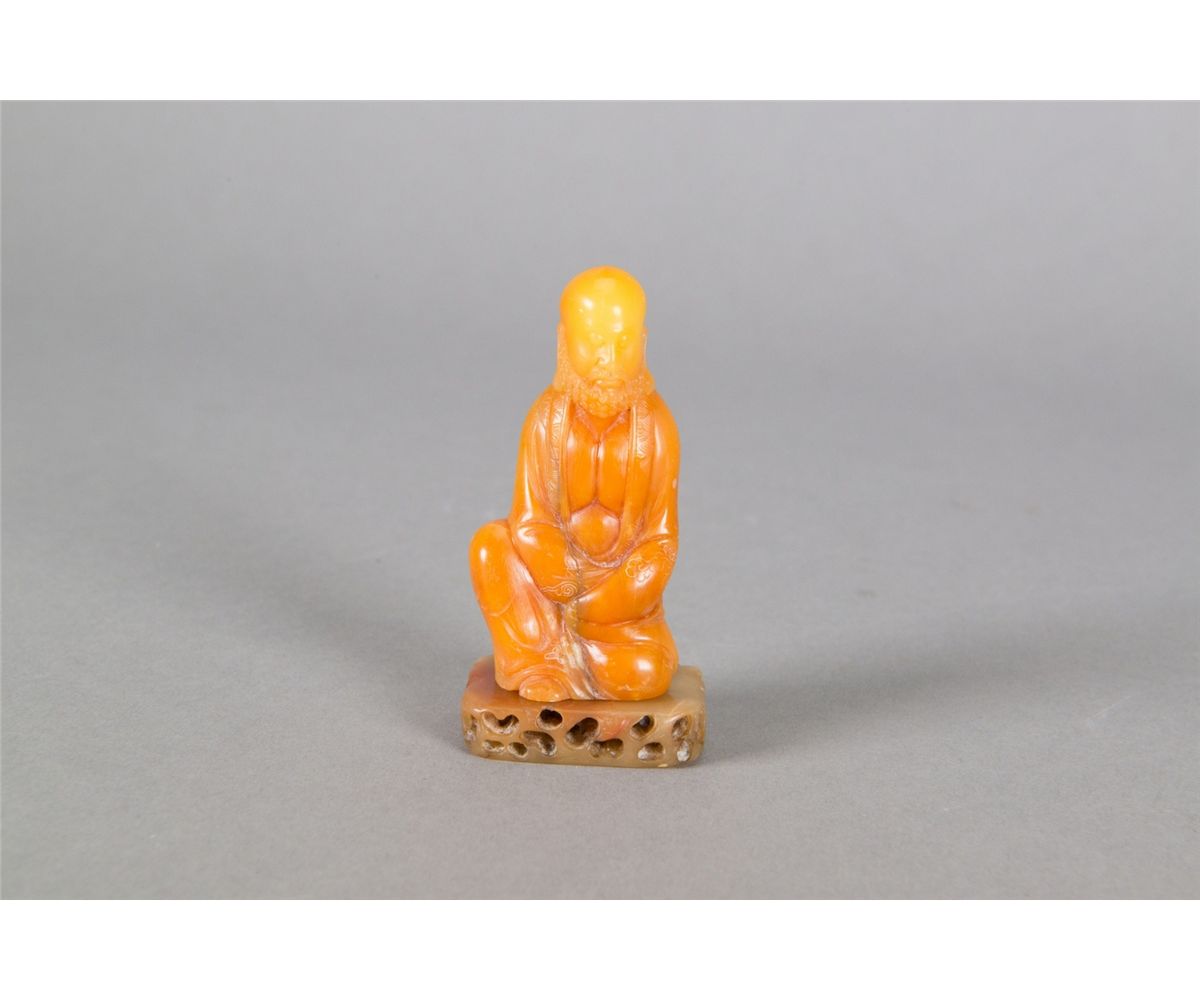 Chinese shoushan stone carved pendant; featuring Gaoshan yellow stone; H: 7 cm, W: 3 cm, 77 grams with stand.