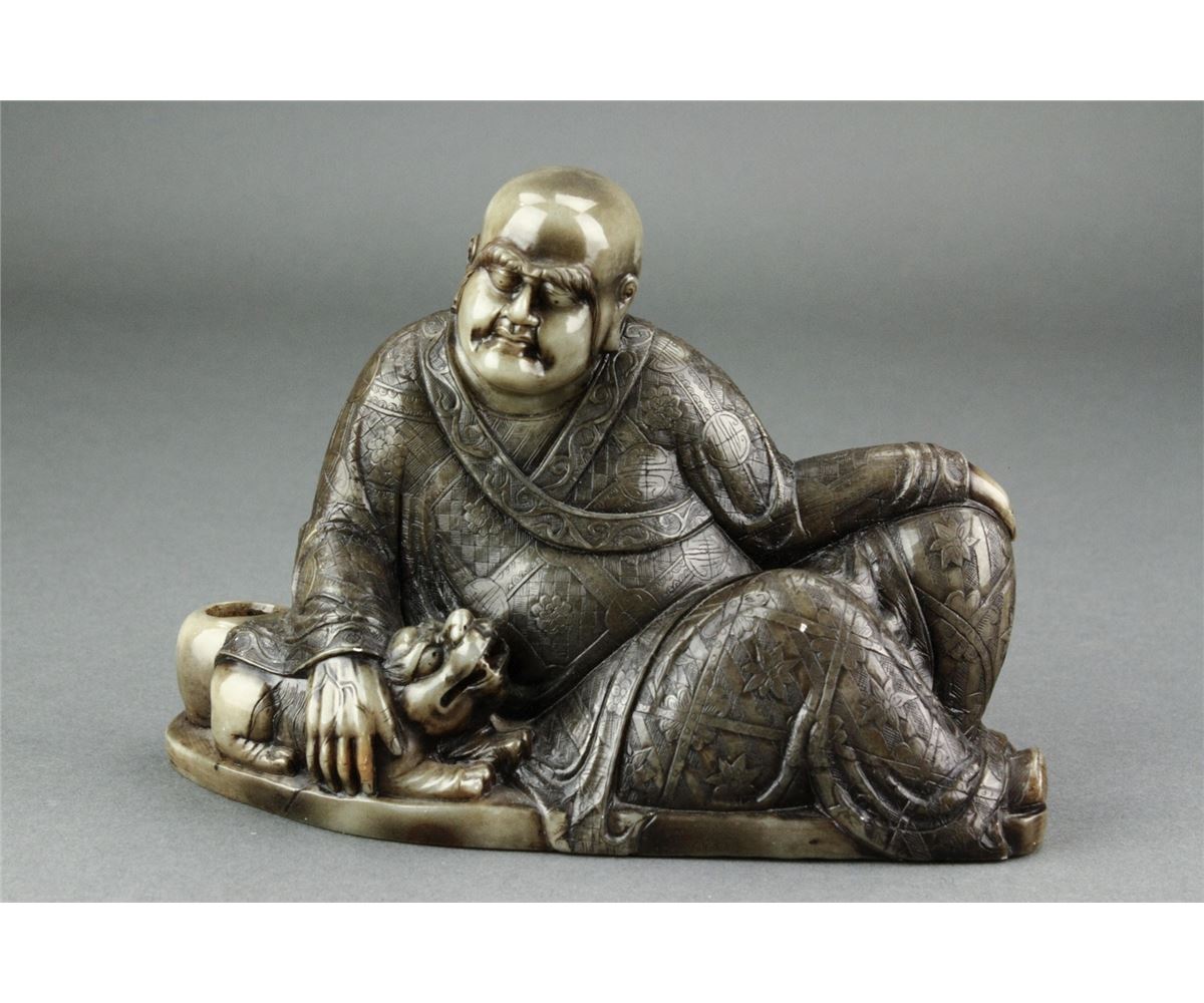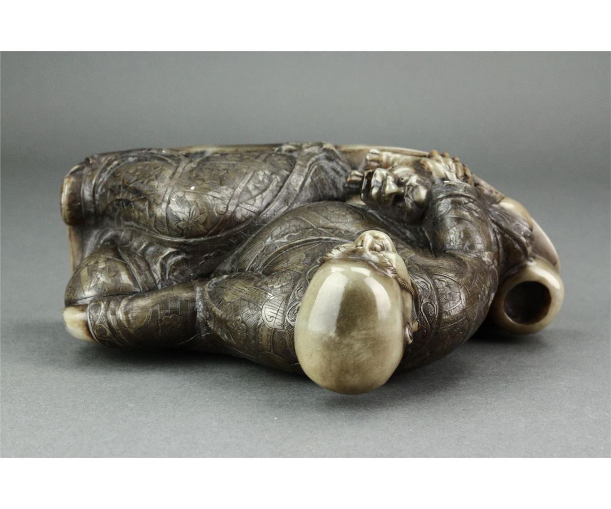 In finely detailed robes, the Lohan gazing to beast in hand while the beast look upon him. H: 12 cm, L: 15 cm, 1247 grams. Provenance: T. Ng Collection Toronto.