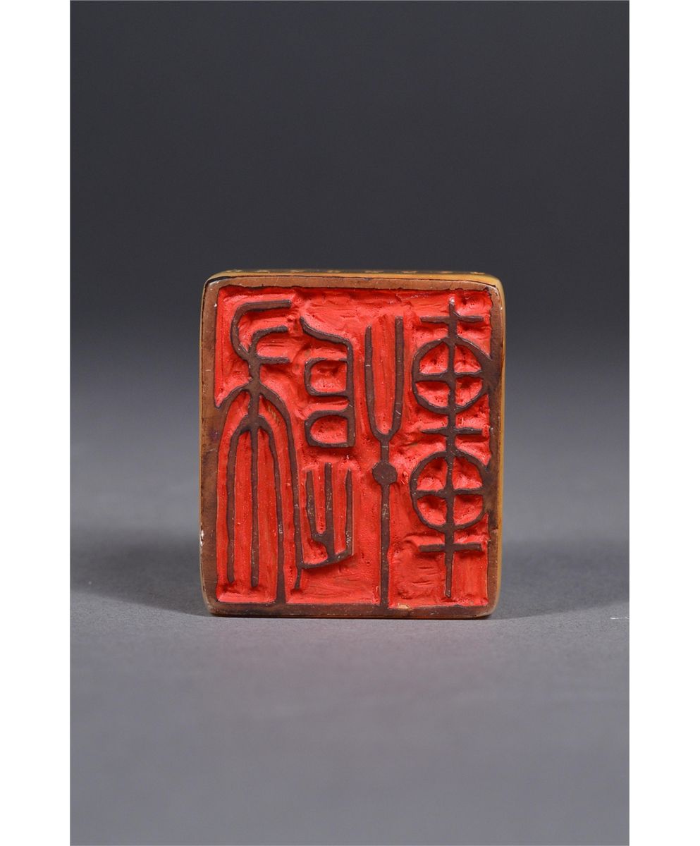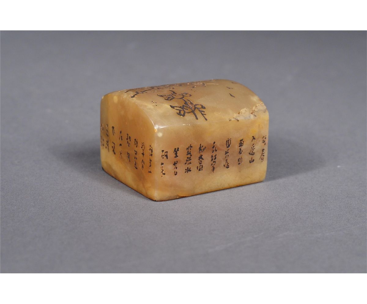 Chinese shoushan stone seal; of rectangular form with rounded top; the top featuring figural scene with bamboo stalks; all four sides incised with calligraphy; the stone of light brown tone; L: 4 cm, W: 3 cm, H: 3 cm, 82 grams