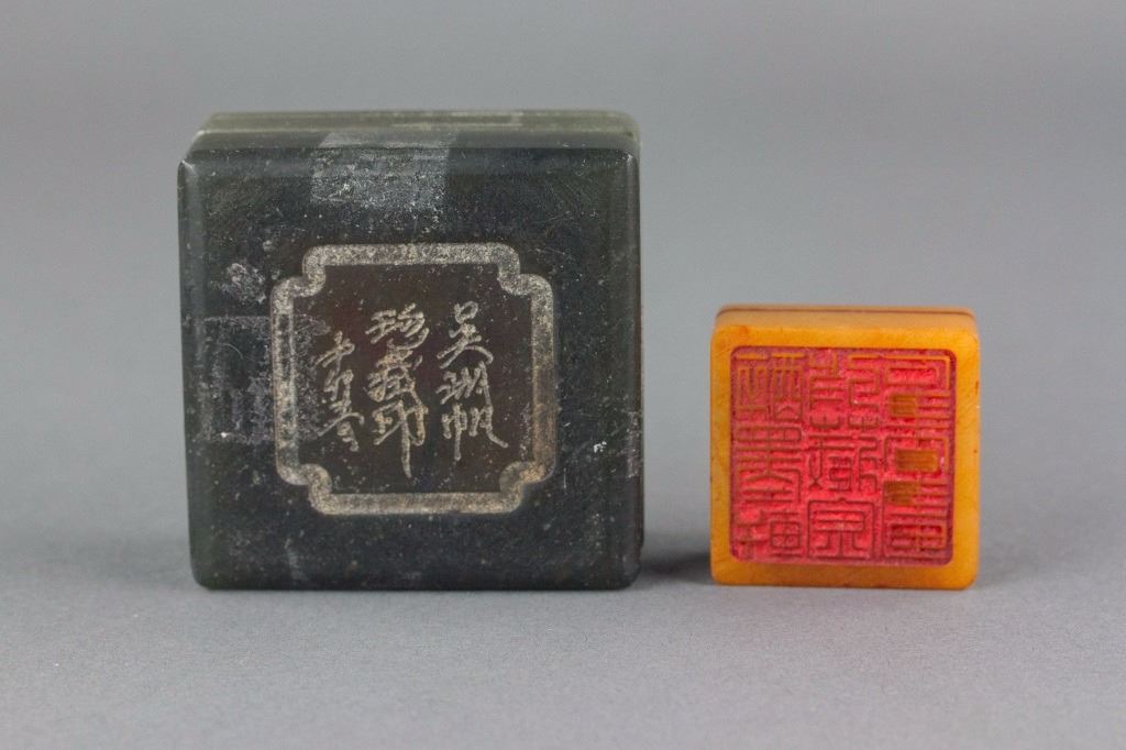 Chinese Shoushan stone seal; of square form body with rounded edge; top carved bamboo, seal face carved nine Chinese characters in seal script; with a stone carved box, top carved Kangxi Tongbao pattern; base carved six-character Wu Zhou Fan Zhen Cang Yin mark; accompanied with a wood stand with broken corner; 3 cm x 6.5 cm x 6.5 cm (case), 1.7 cm x 3.7 cm x 3. 7 cm (stamp) 436 grams total