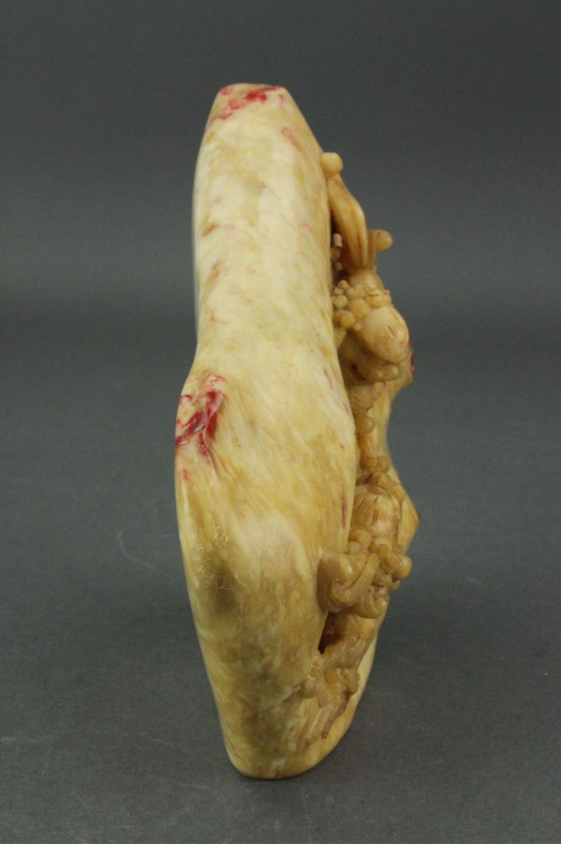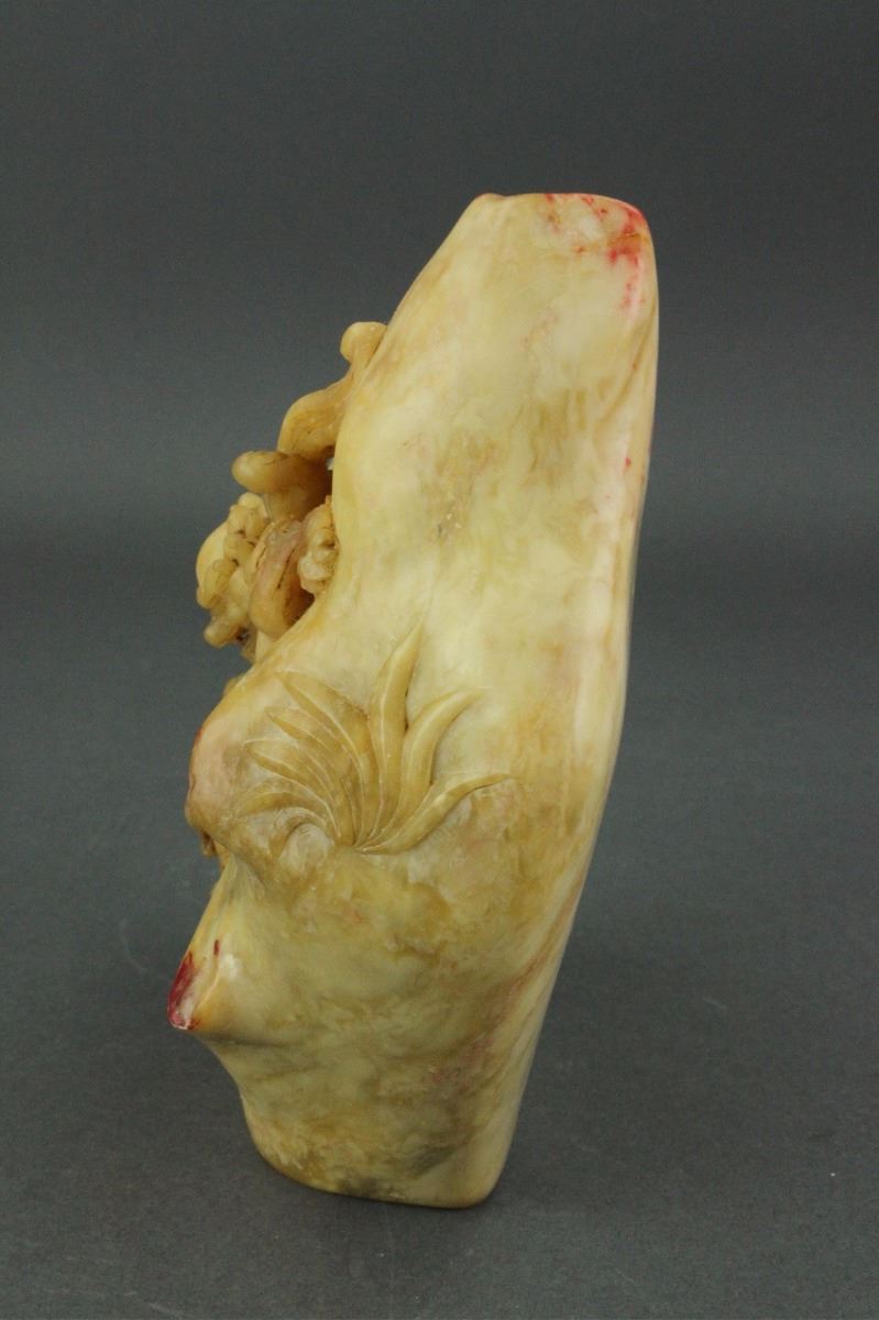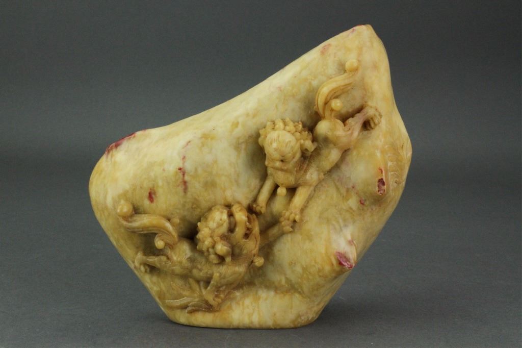 Chinese Shoushan stone boulder; featuring two Fu dogs in high relief; of light yellow tone; H: 17 cm, W: 14 cm, L: 16 cm, 1413 grams