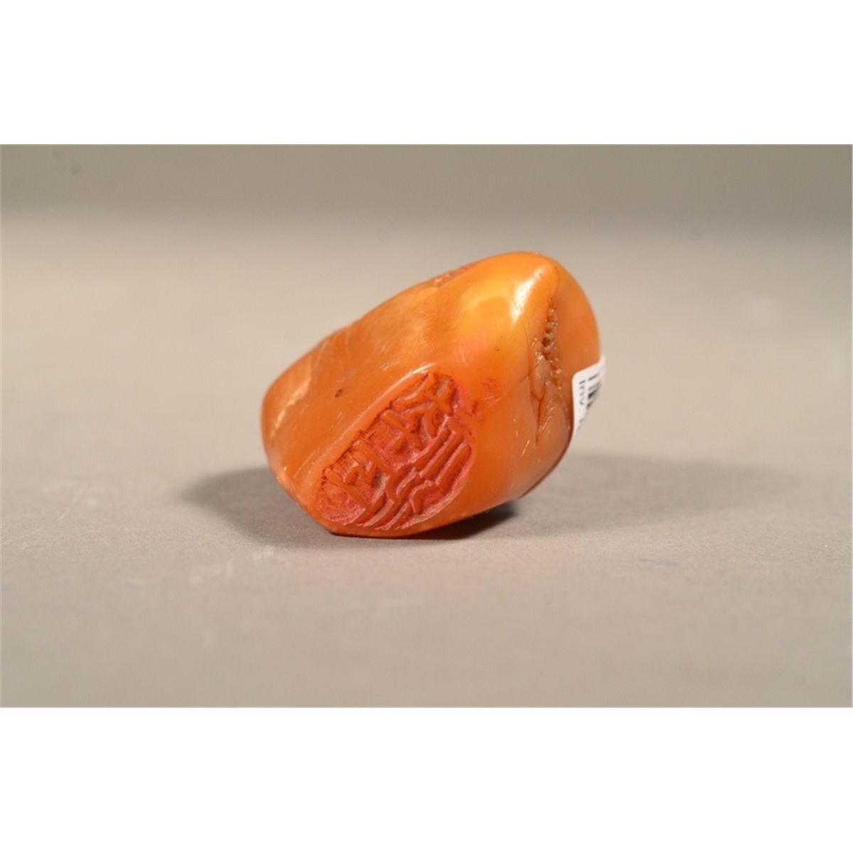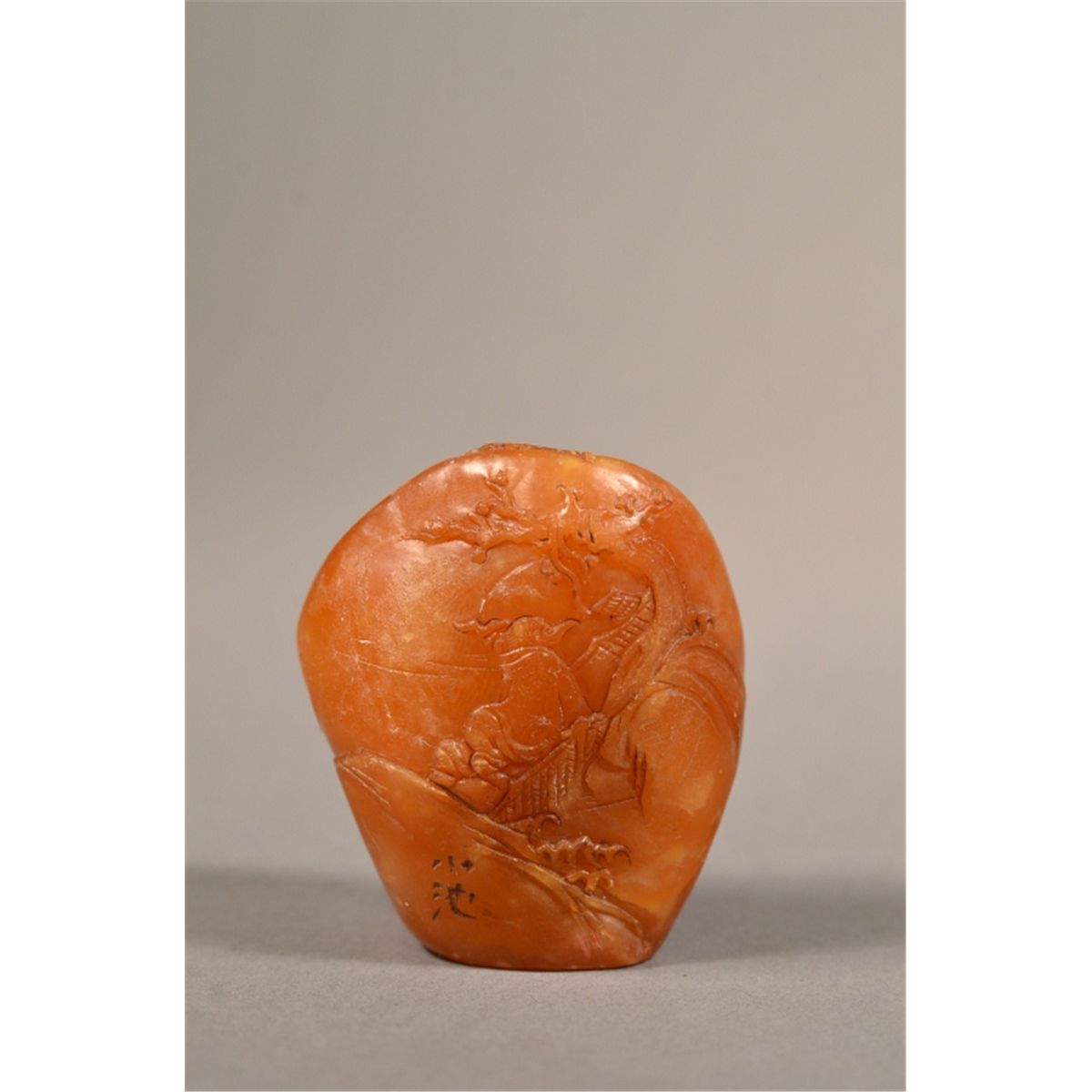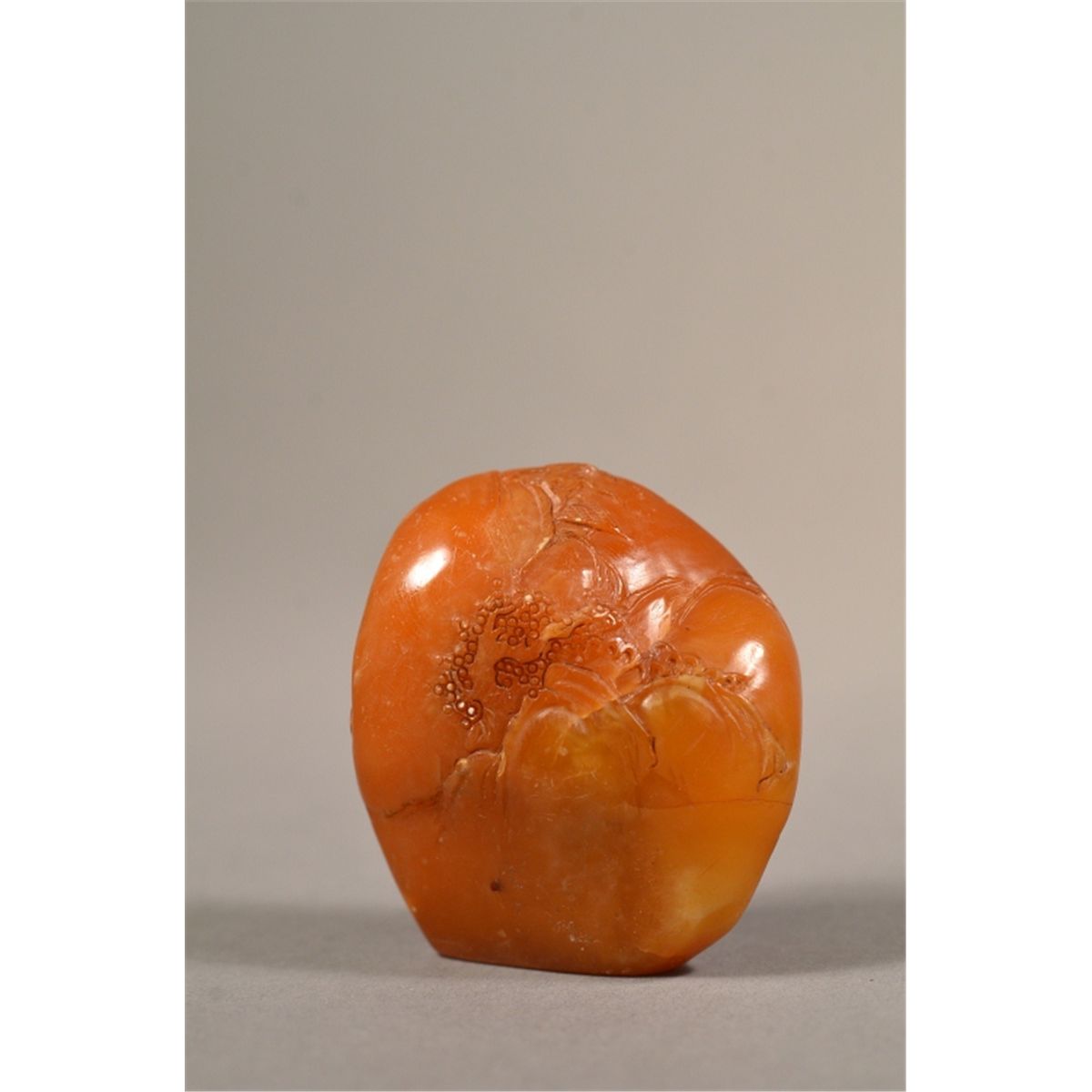 Well carved Chinese shoushan Tianhuang pebble stone seal; featuring small home amongst landscape; W: 4 cm, L: 3 cm, H: 5 cm