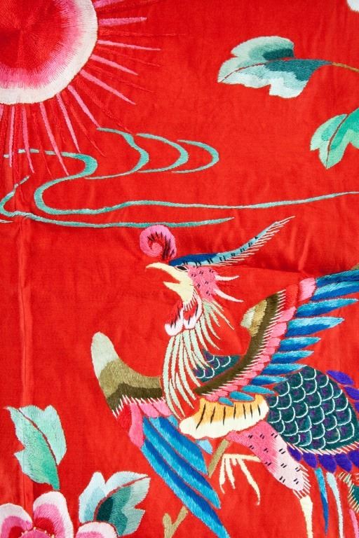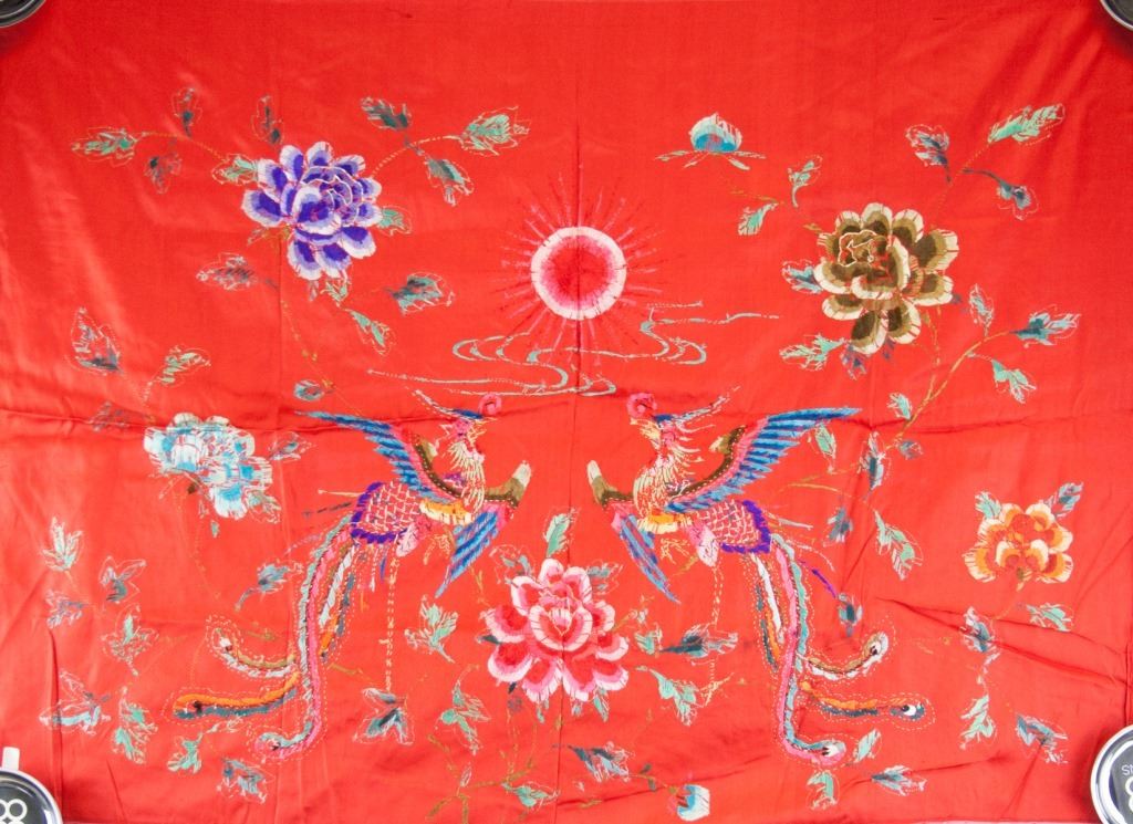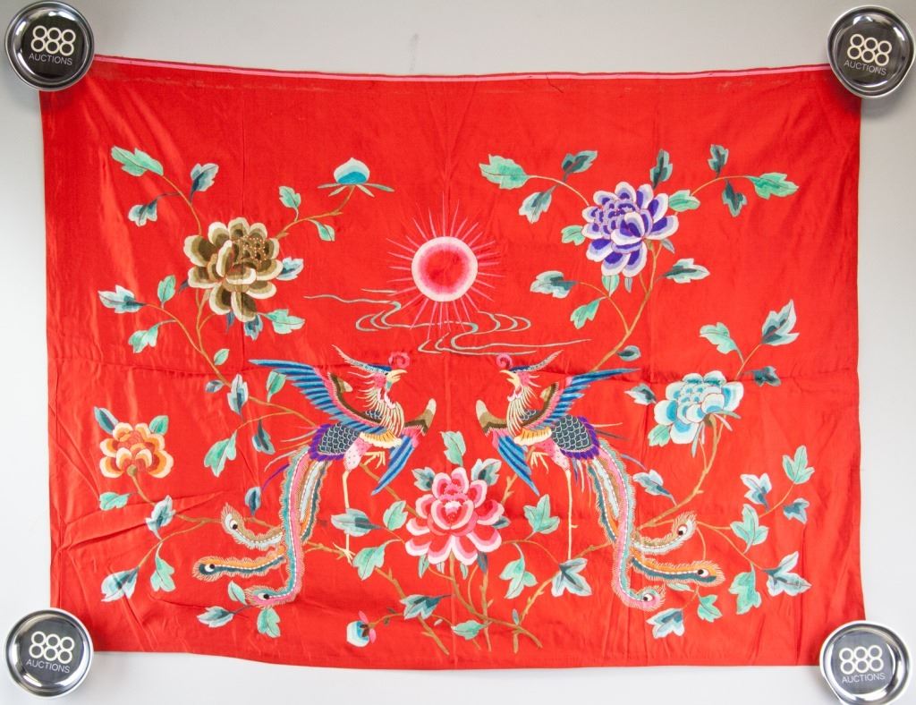 Chinese embroidery. On red silk. Depicting two phoenixes and flowers with a rising sun in the middle. 96 x 68 cm.