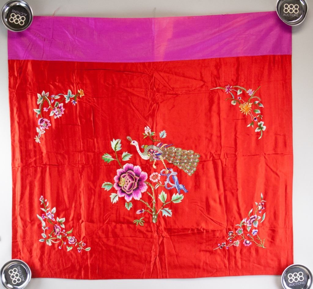 Chinese silk embroidery. Featuring flower and peacock on red background. 92 x 92 cm.