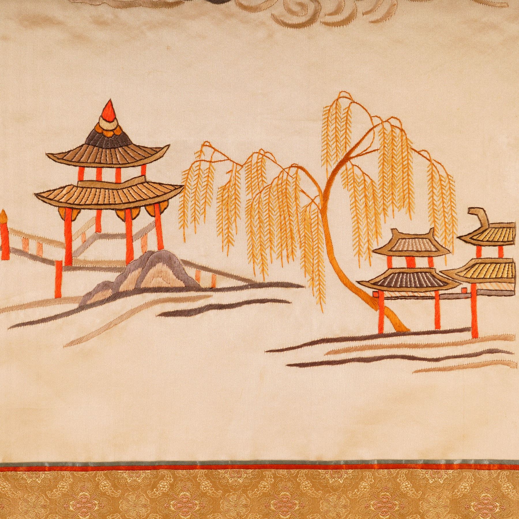 Finely embroidered silk textile depicting two celestial maidens bearing offerings while standing upon clouds above a traditional pagoda landscape. The figures are intricately detailed with delicate satin stitchwork in shades of tan, rust, and ochre, highlighted with subtle metallic threads. The lower register features classic Chinese architectural motifs and a weeping willow, rendered in balanced symmetry. Mounted on a brocade silk border with gold floral motifs and framed under Lucite. The work exemplifies traditional Chinese craftsmanship, likely mid-20th century, reflecting themes of prosperity and harmony common in decorative silk art. Artwork can be unframed and rolled for shipment.