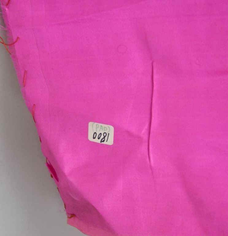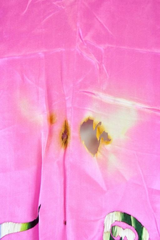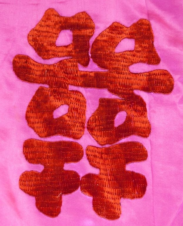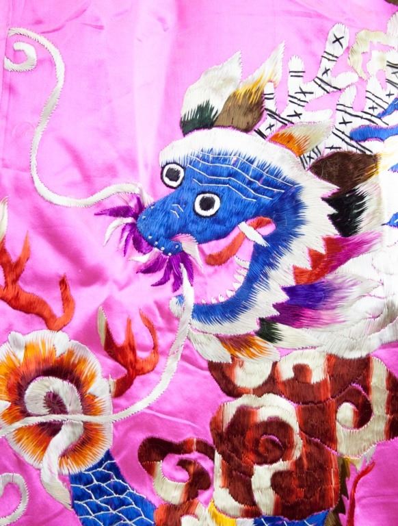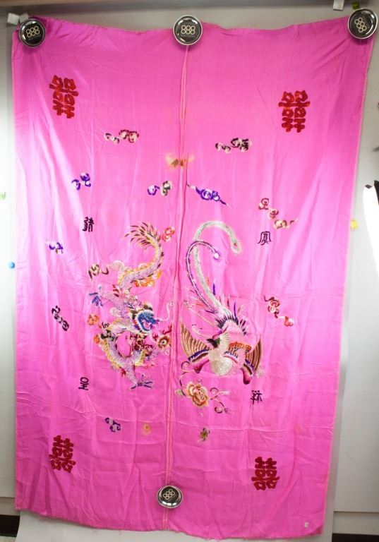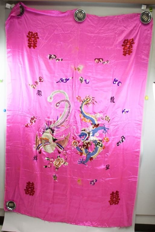 Chinese embroidery on silk. Featuring phoenix and dragon on pink silk. 207 x 134 cm.