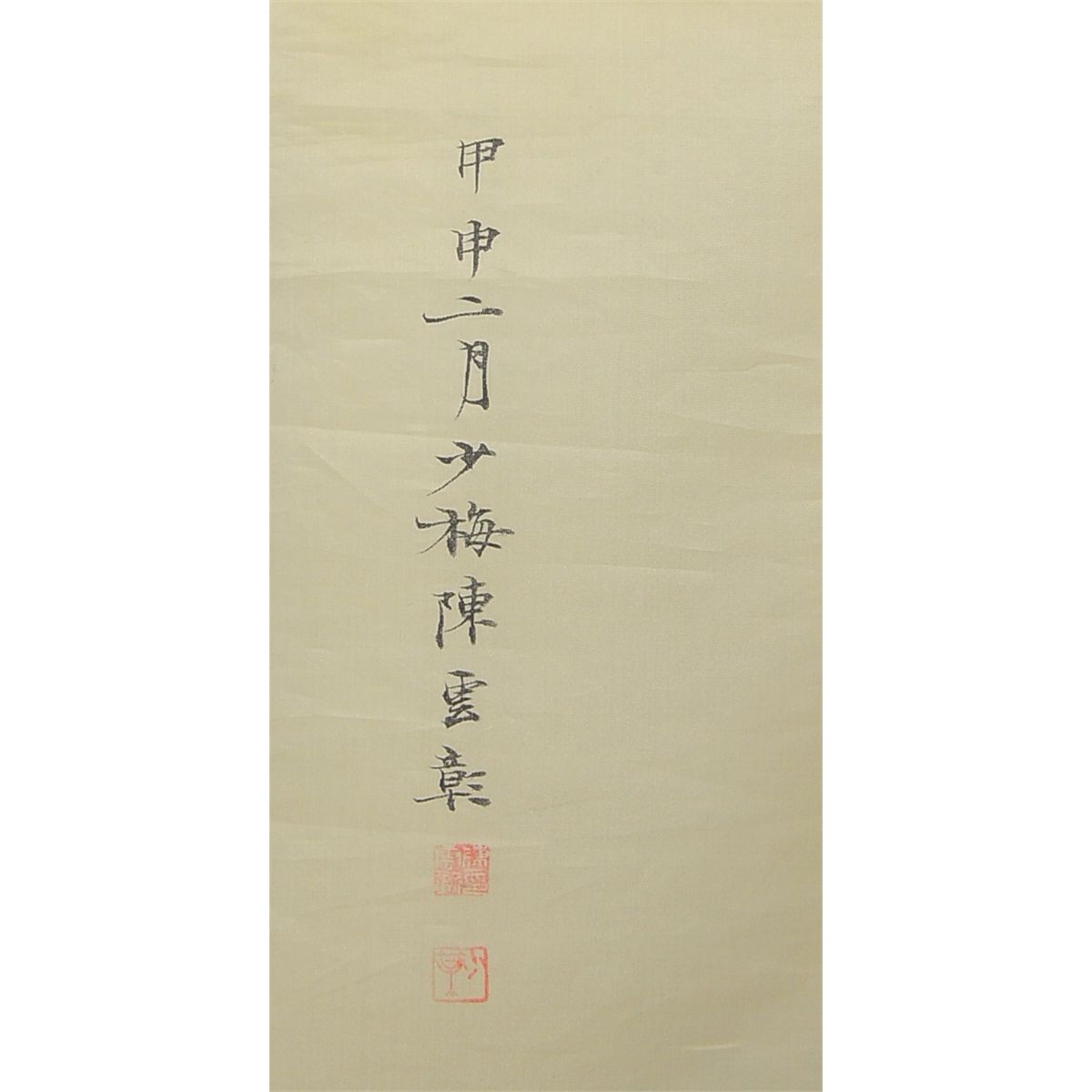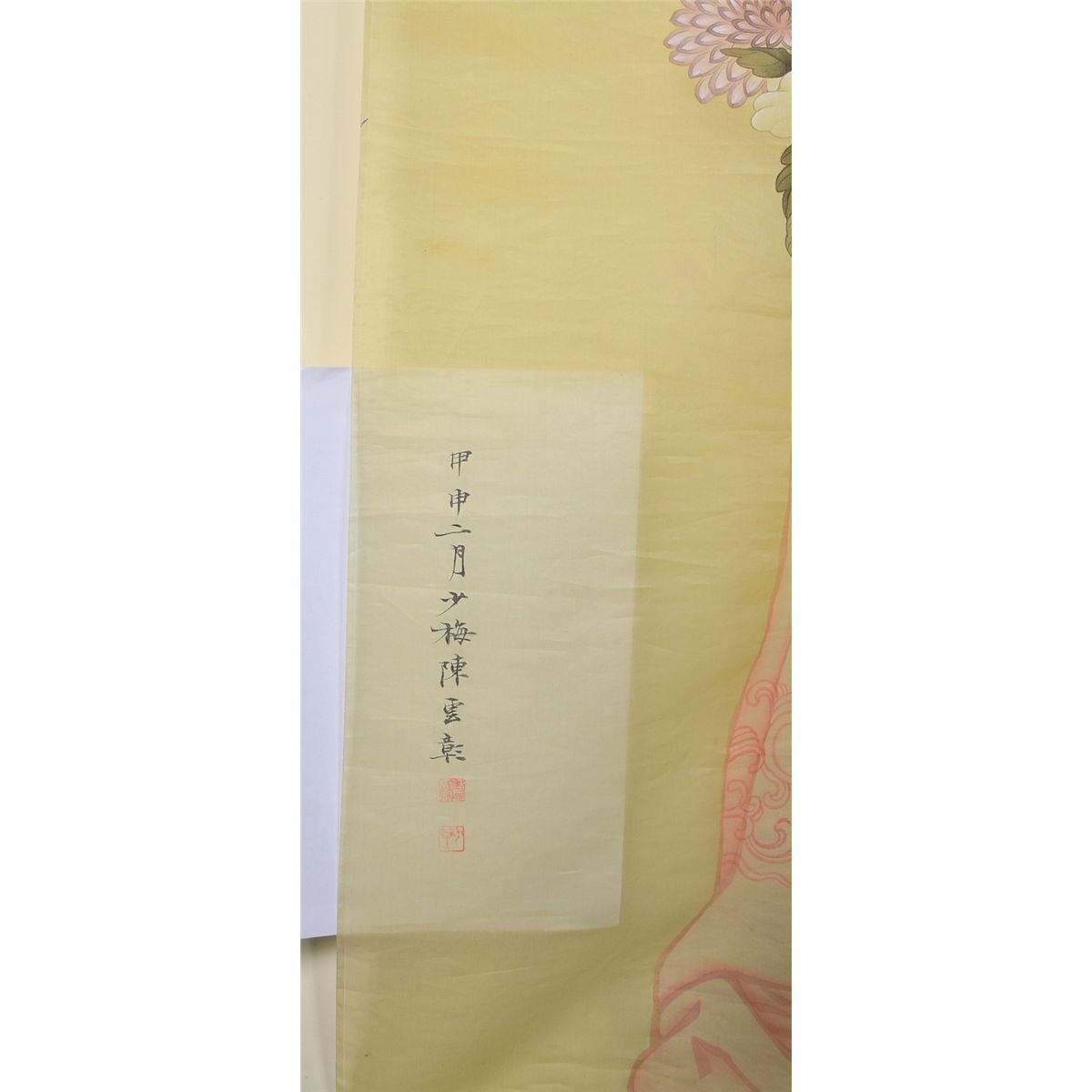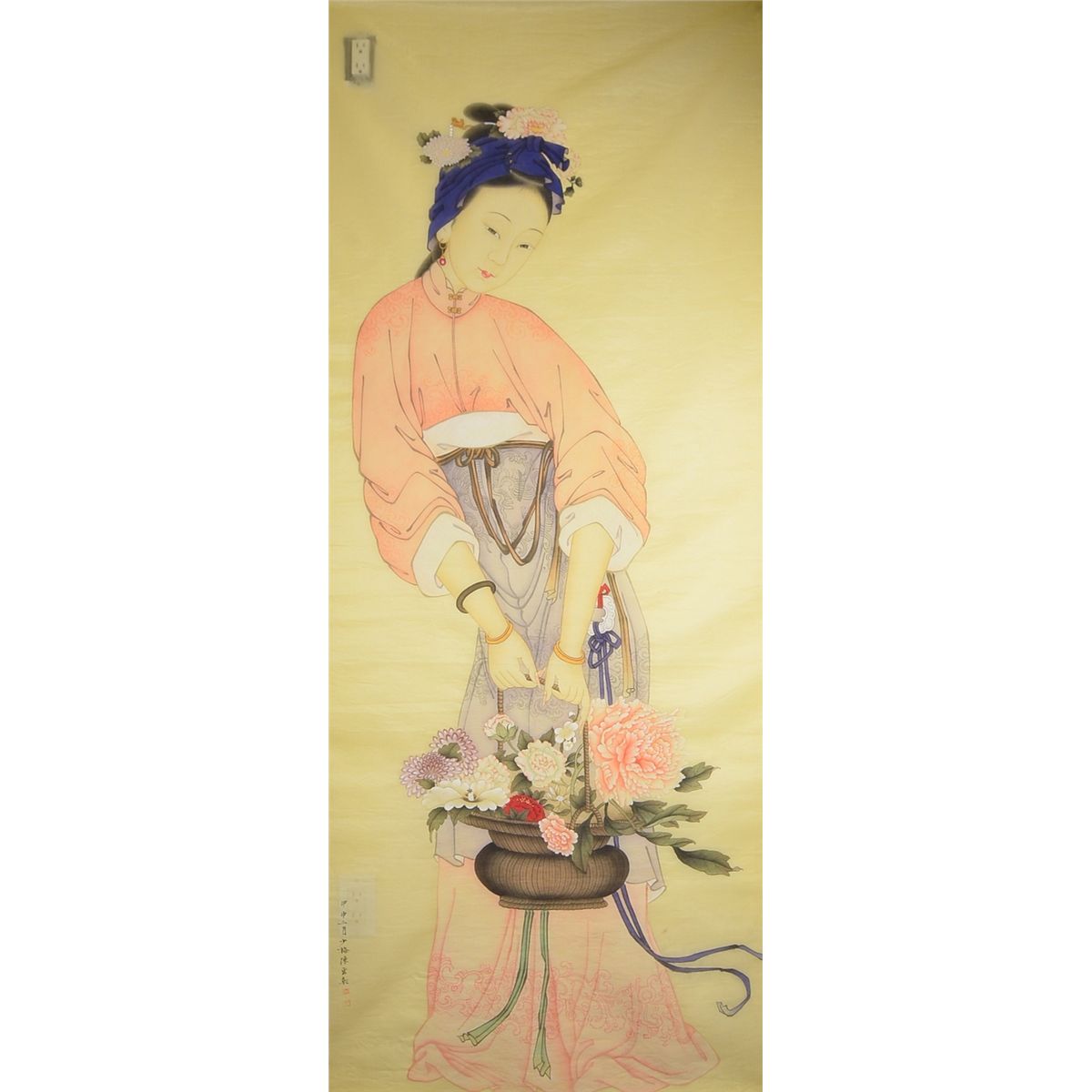 Chinese silk portrait painting of woman; signed and inscribed with two artist seals; 210 cm x 90 cm