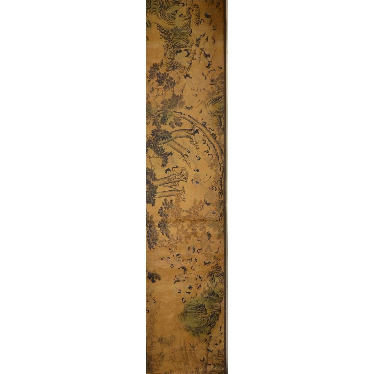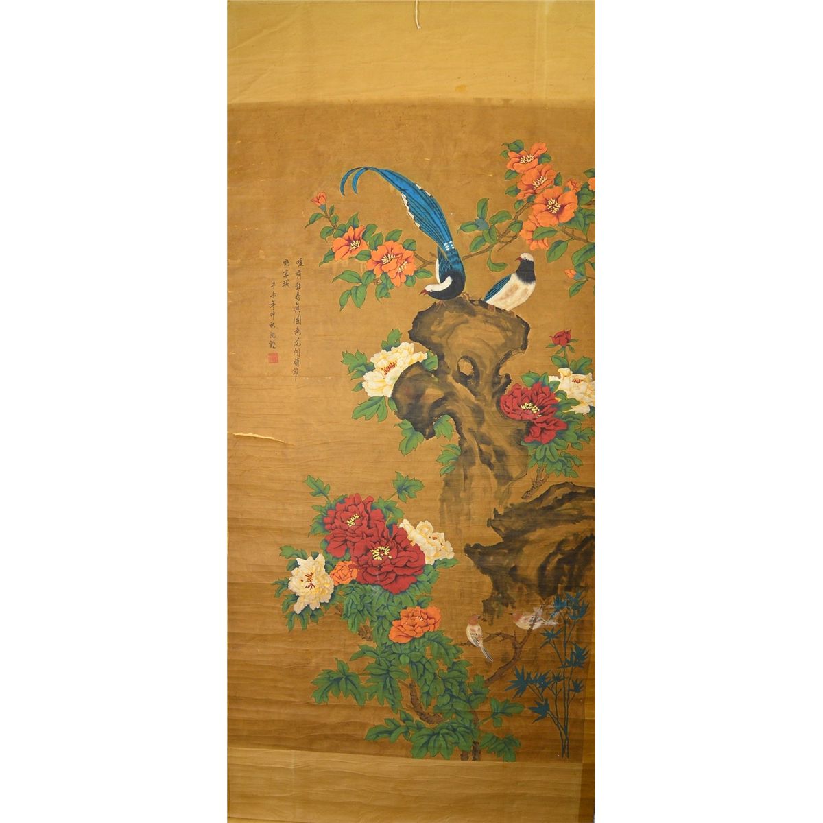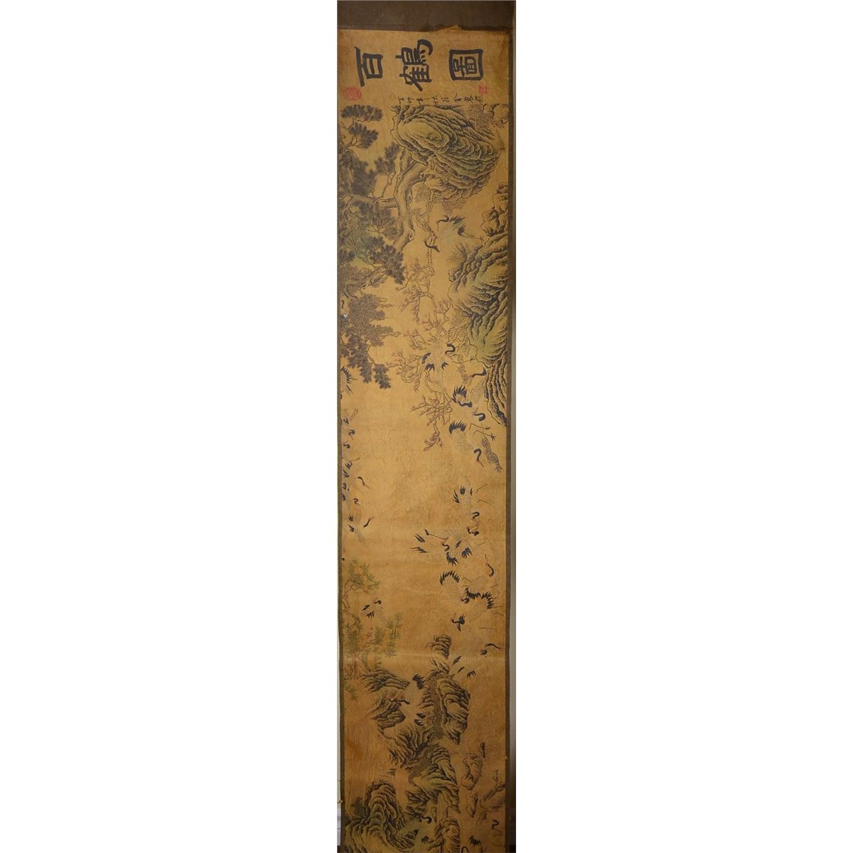 Chinese silk watercolour on lithographed on paper; inscribed and signed with one artist seal; 415 cm x 42 cm