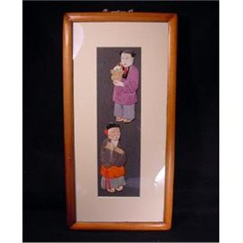 Two Chinese paper and silk figures, with hand painted faces, mounted on a mottled background, and framed in a pine frame with a metal chinese pattern hanger at the top. The framed area is in excellent condition. The frame is rustic pine, with glued corners, one of which is filled. Good clean condition. Picture measures 40cm (15.3/4 inches) by 20cm (8 inches). Figures are circa 1890 - 1920.