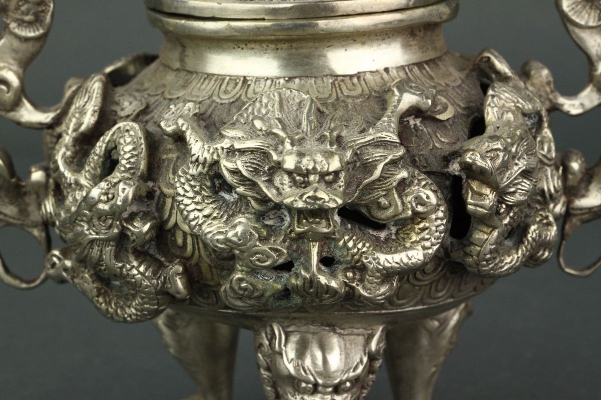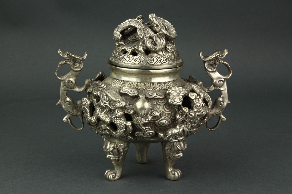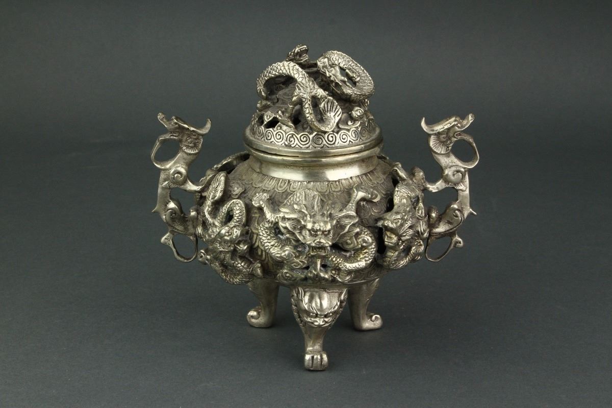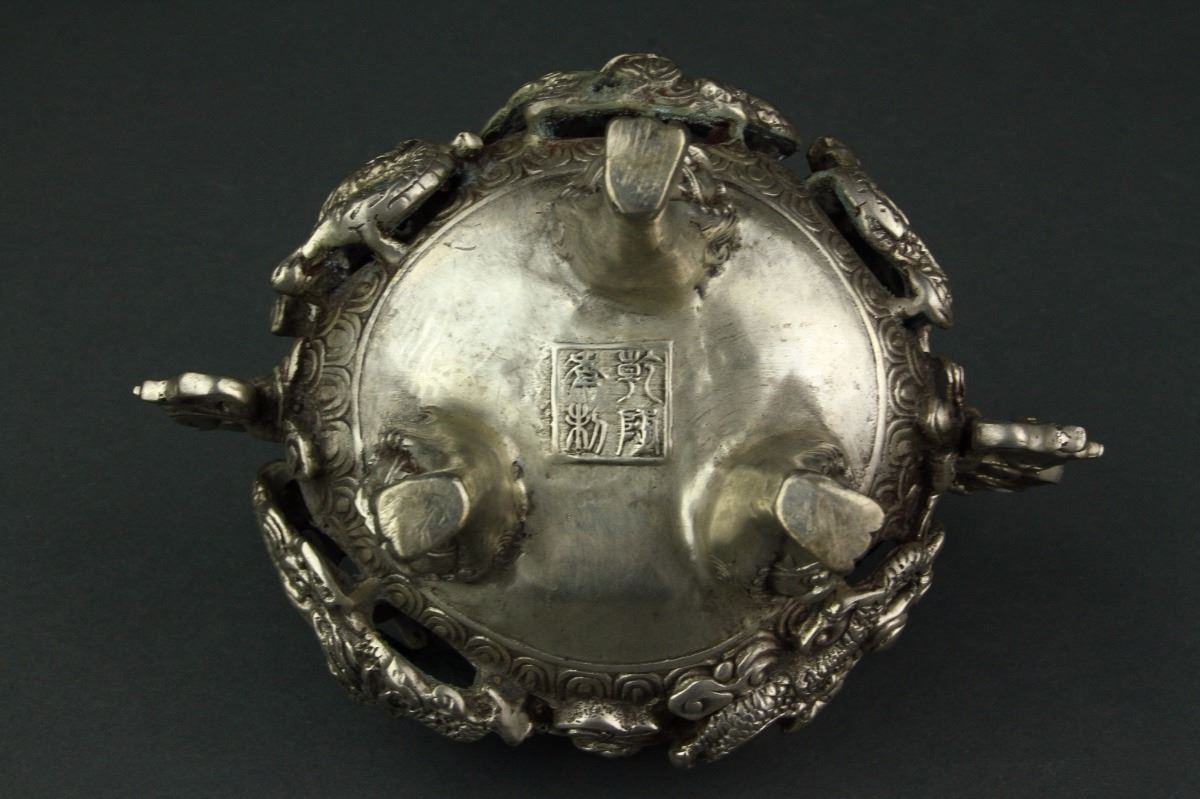 Chinese silver censer; supported on three feet and flanked by double Chilong-shaped handles; four-character Qianlong mark on base; silver purity not tested; H: 15 cm, W: 16 cm, 971 grams