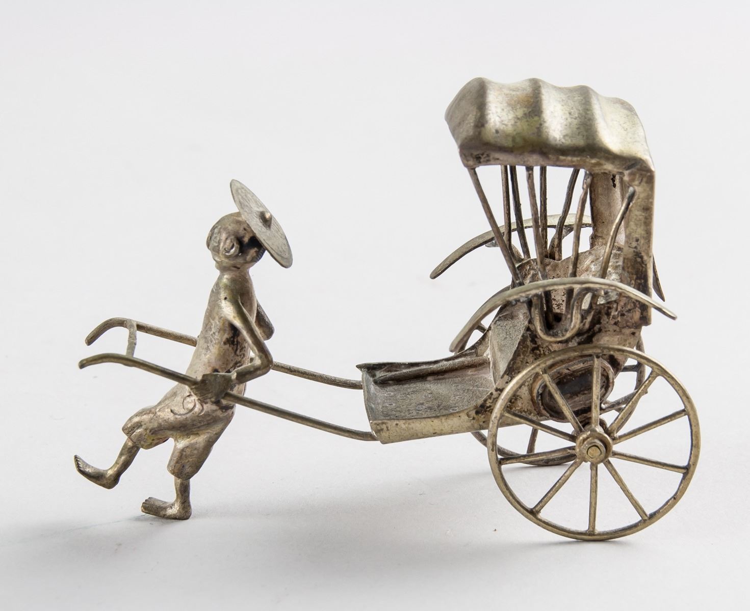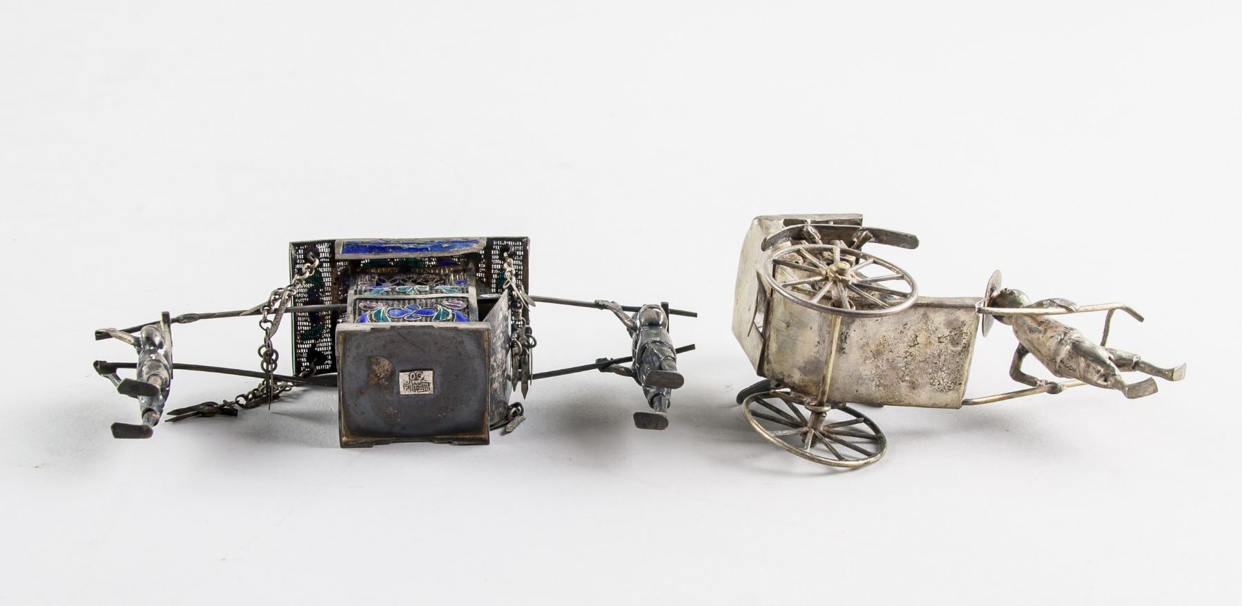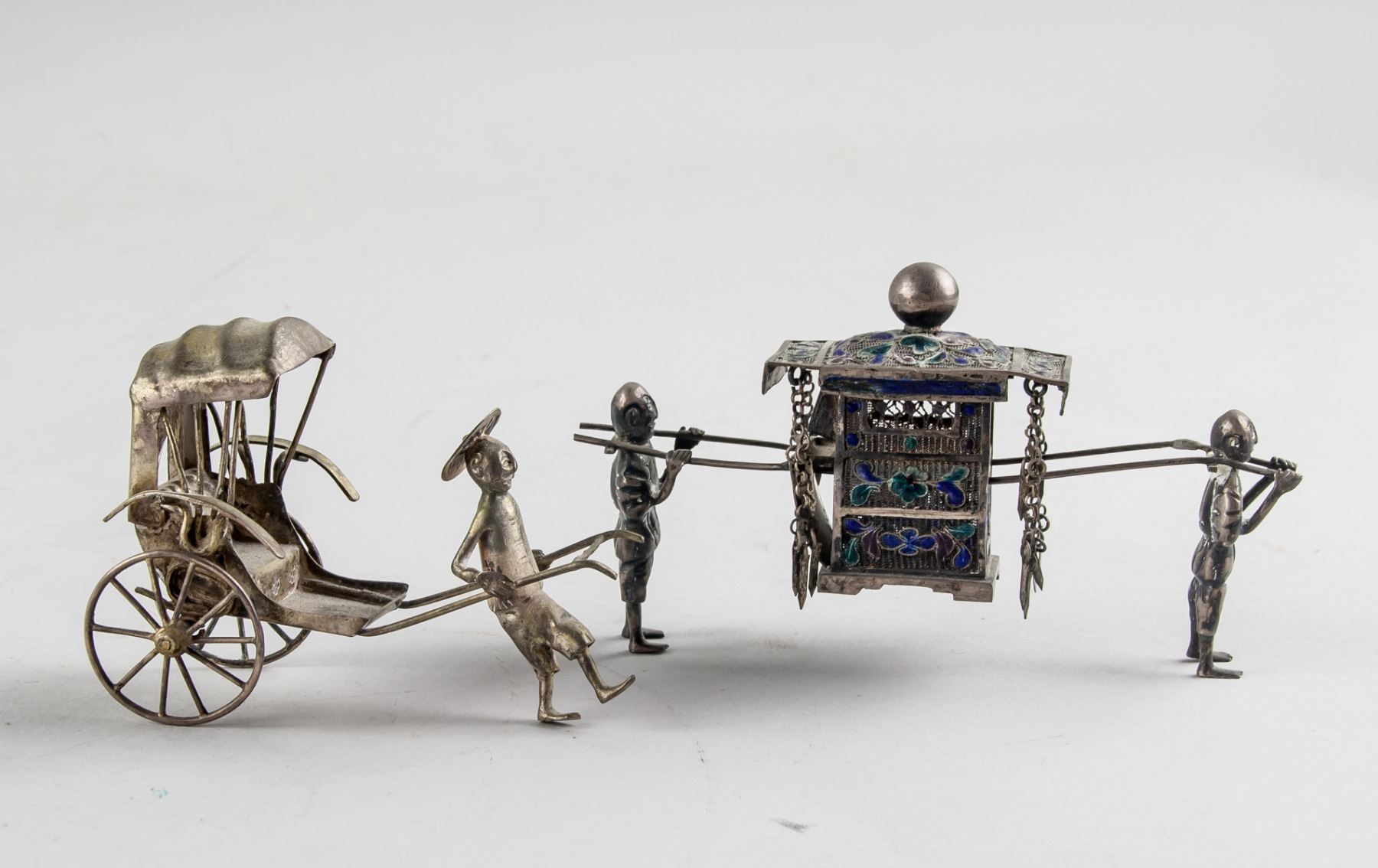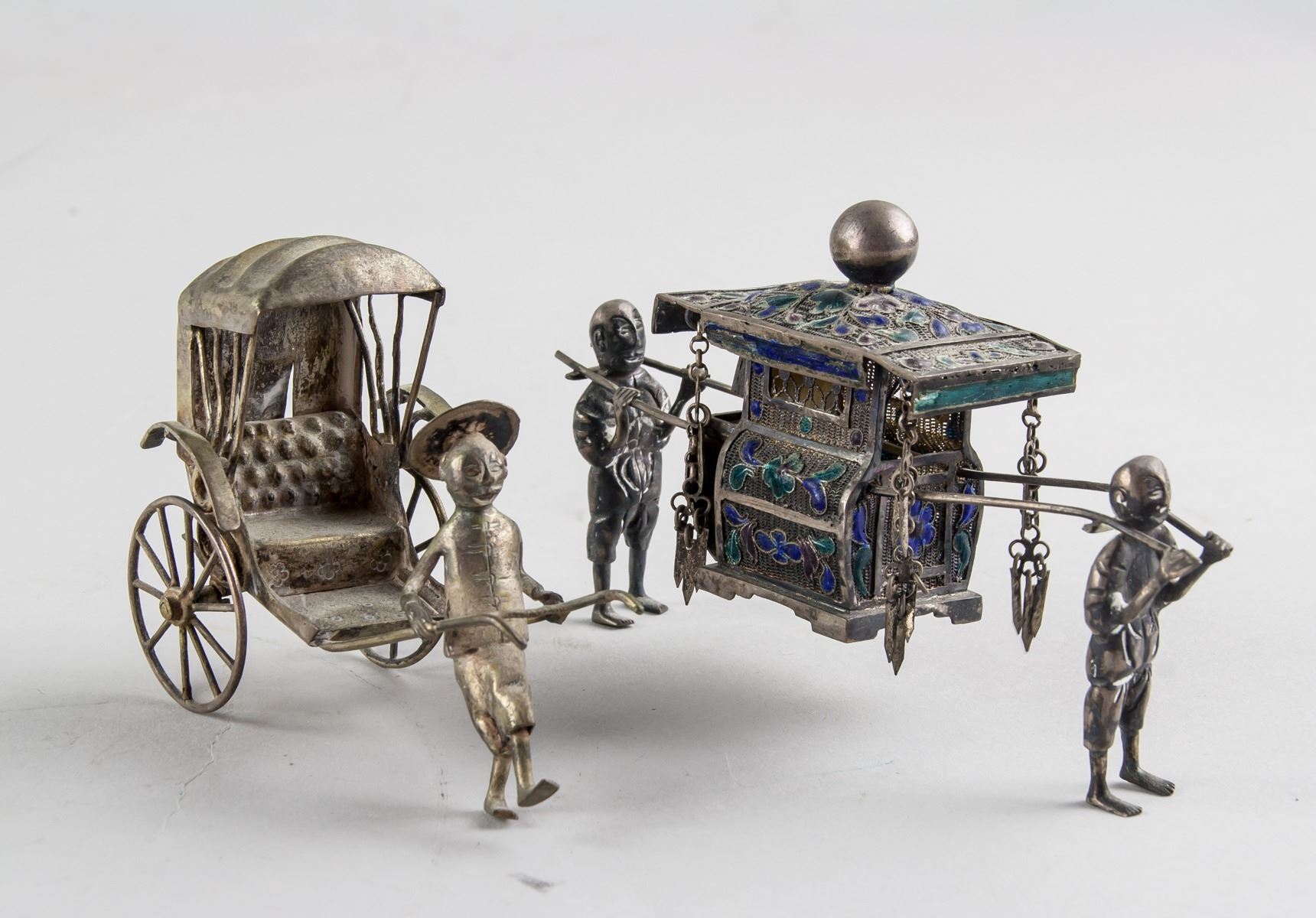 Two Chinese silver miniatures, one of pulled rickshaw form, one of two-men litter, both with Guang Sheng Yuan mark, 6 x 10 cm, 85 grams total