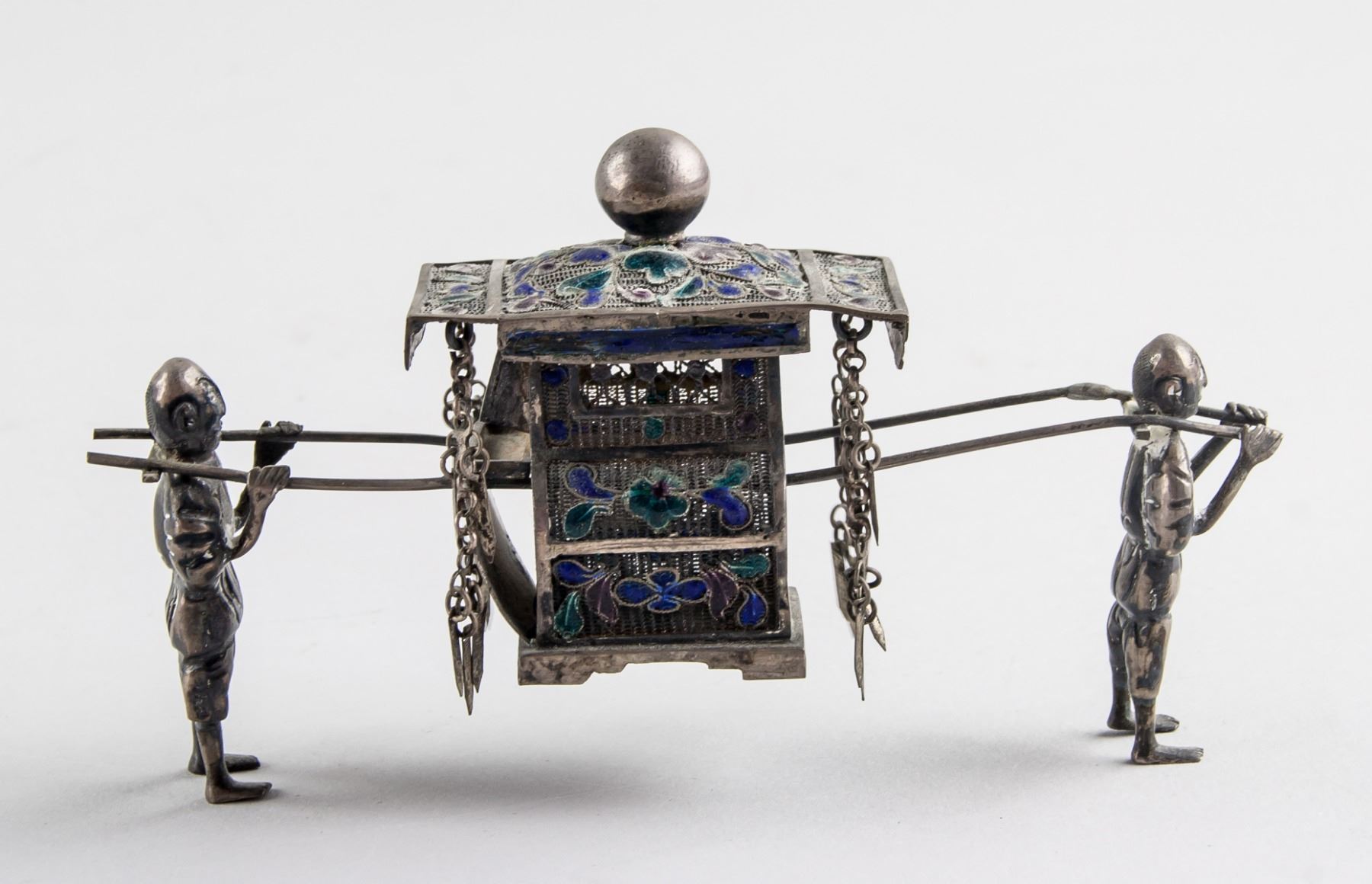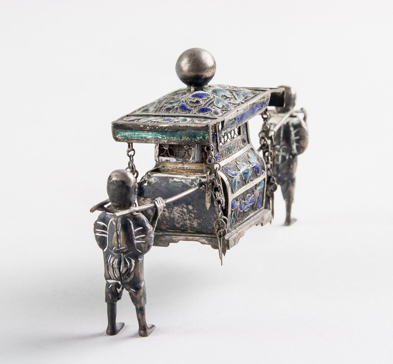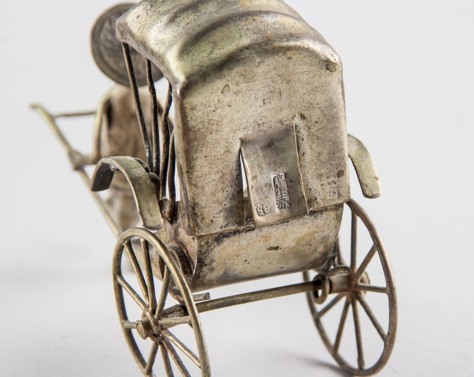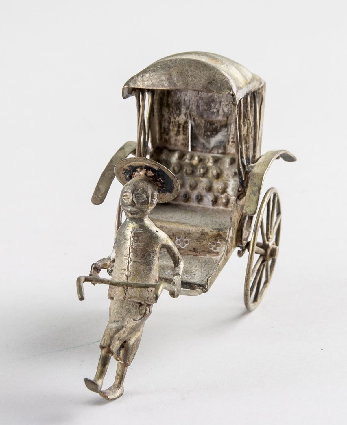 Two Chinese silver miniatures, one of pulled rickshaw form, one of two-men litter, both with Guang Sheng Yuan mark, 6 x 10 cm, 85 grams total