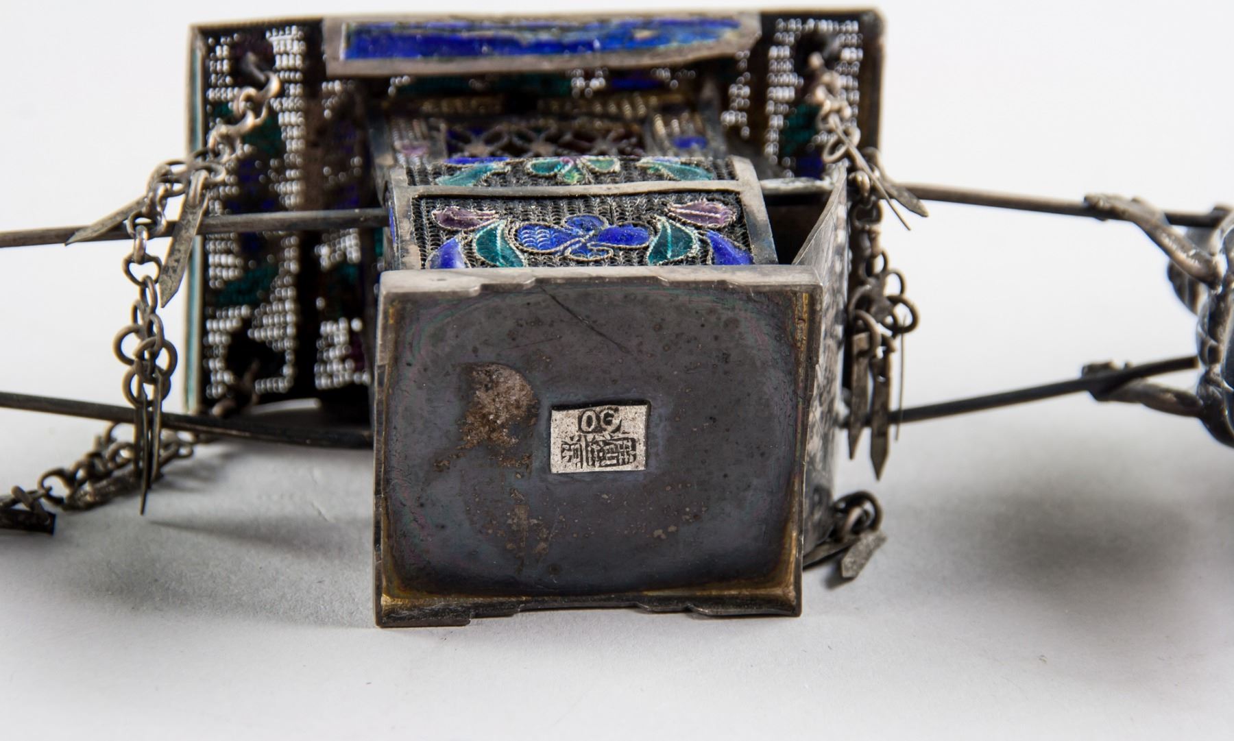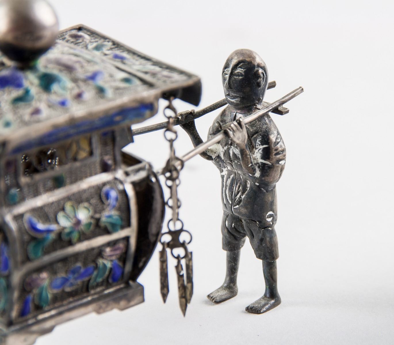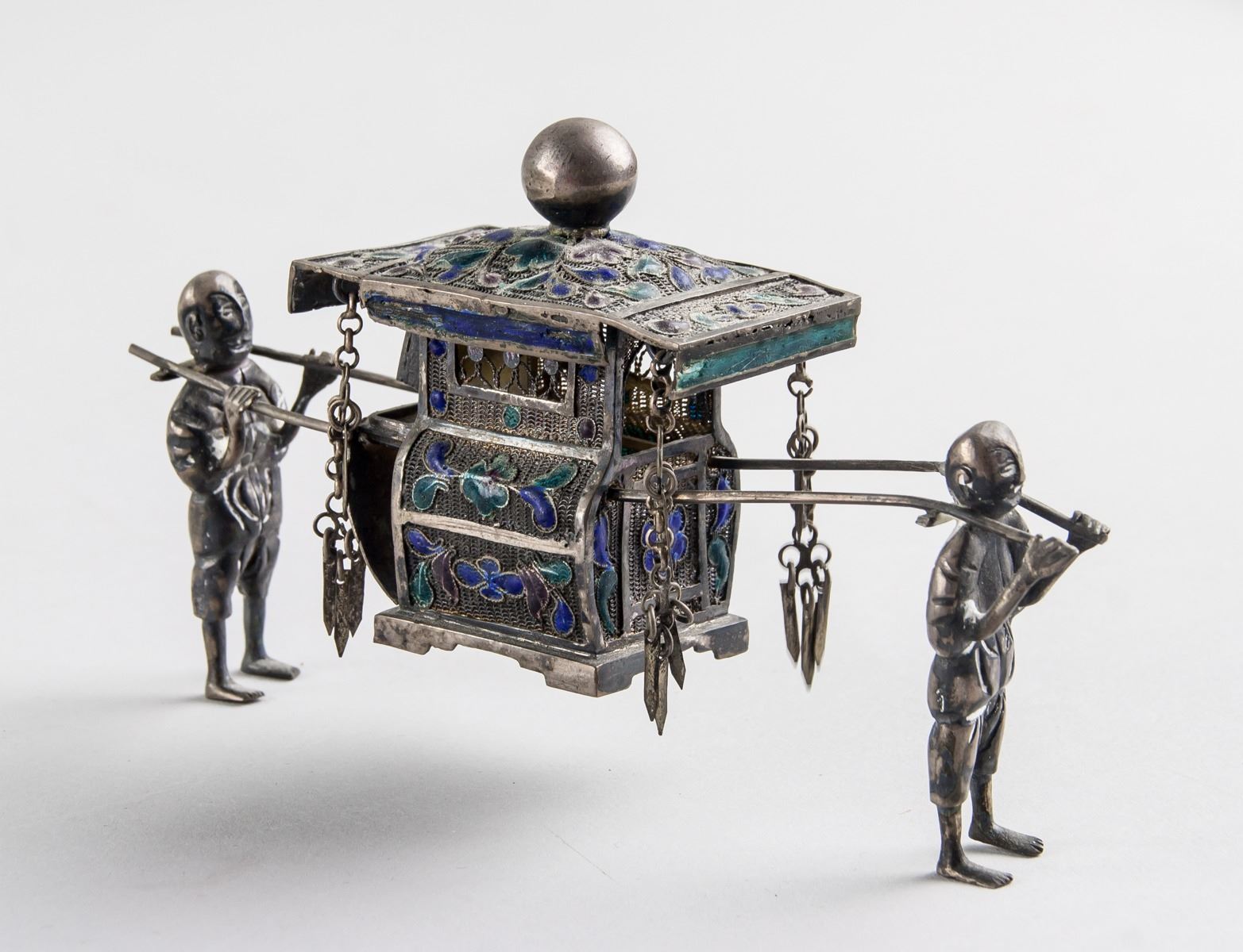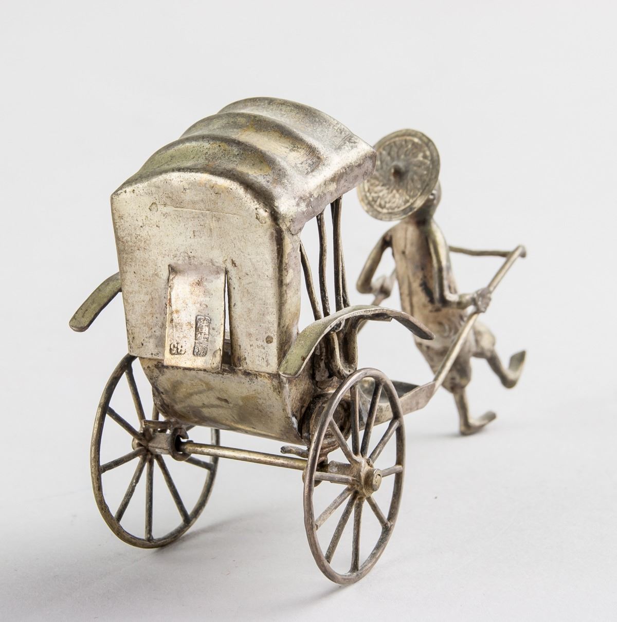 Two Chinese silver miniatures, one of pulled rickshaw form, one of two-men litter, both with Guang Sheng Yuan mark, 6 x 10 cm, 85 grams total