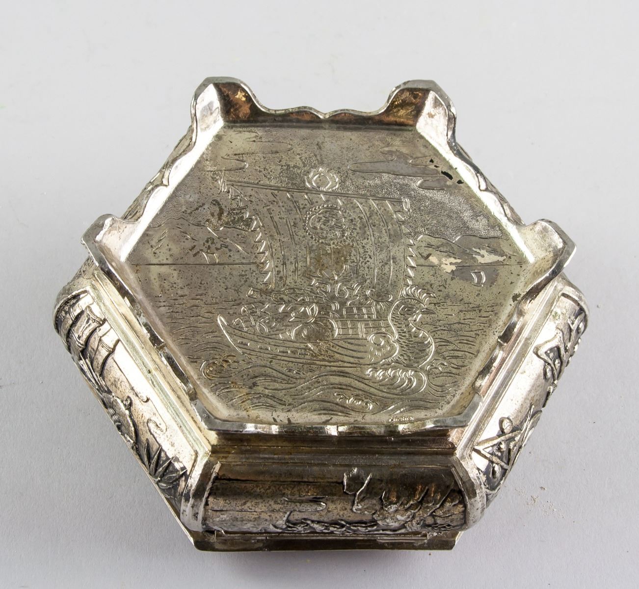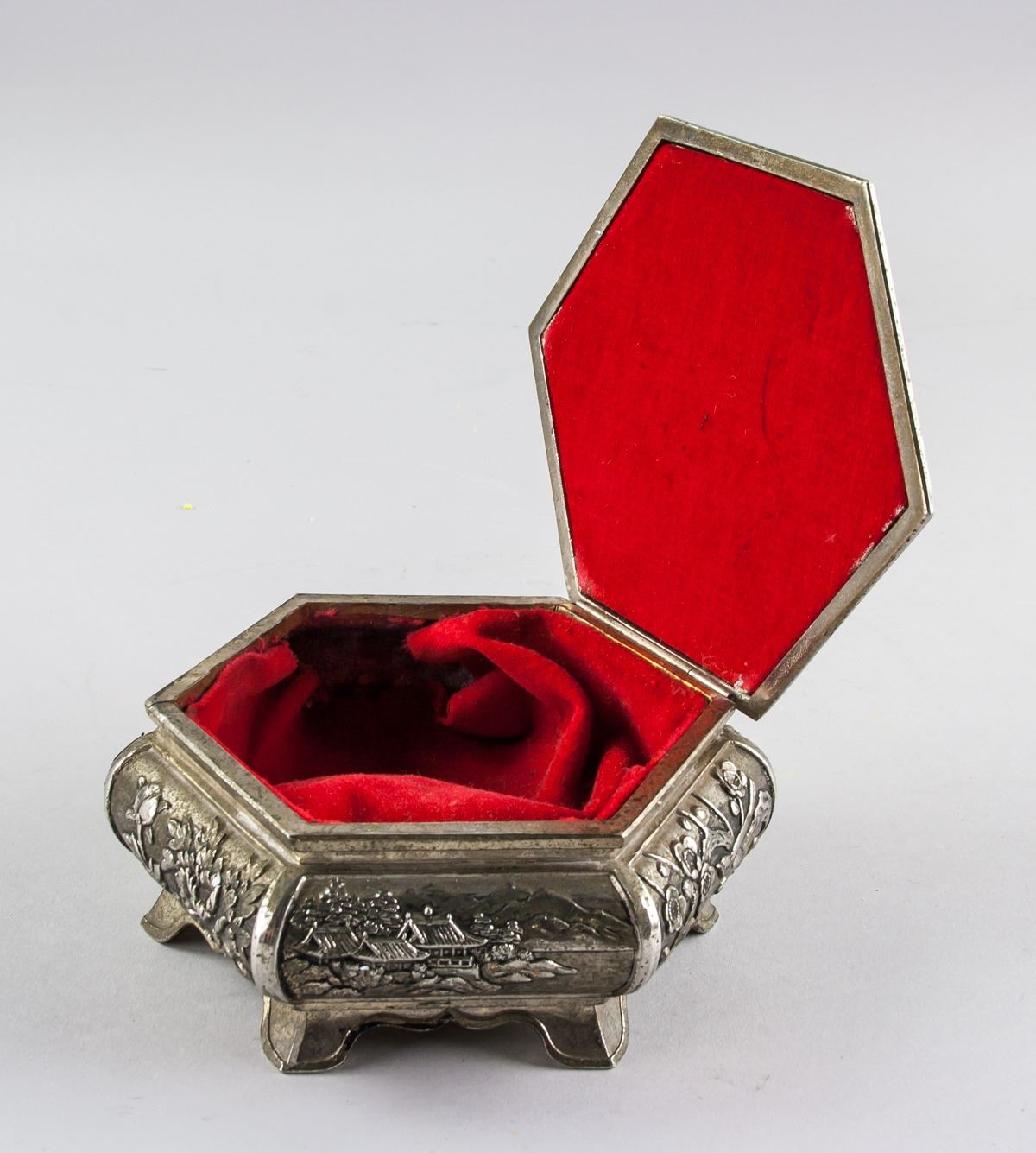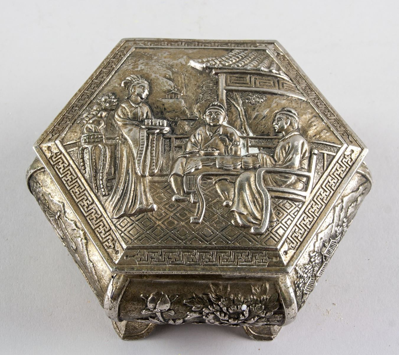 Chinese silver plated cosmetic box, of hexagon body, supported on 6 feet, with hinged lid, carved with figures on lid, flower and landscape on side, 7 x 14 cm, 561 grams. PROVENANCE: Atef Elshikh He was ambassador in China 1975-1977. Then ambassador in Austria and then Italy. Died in September 1984.