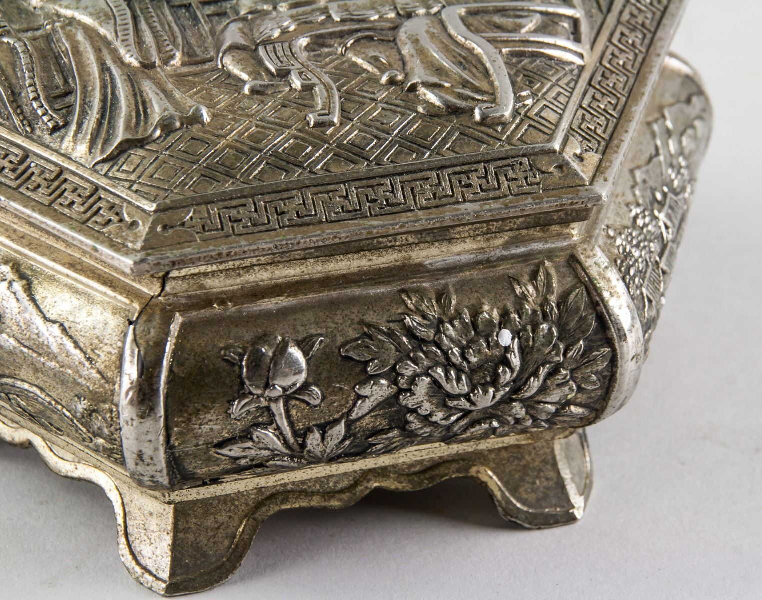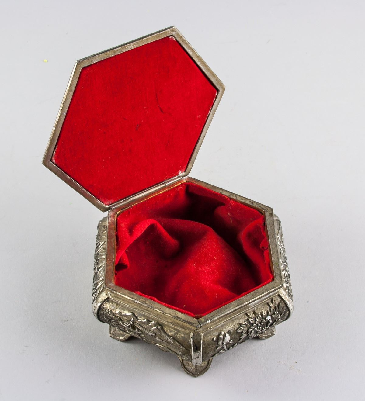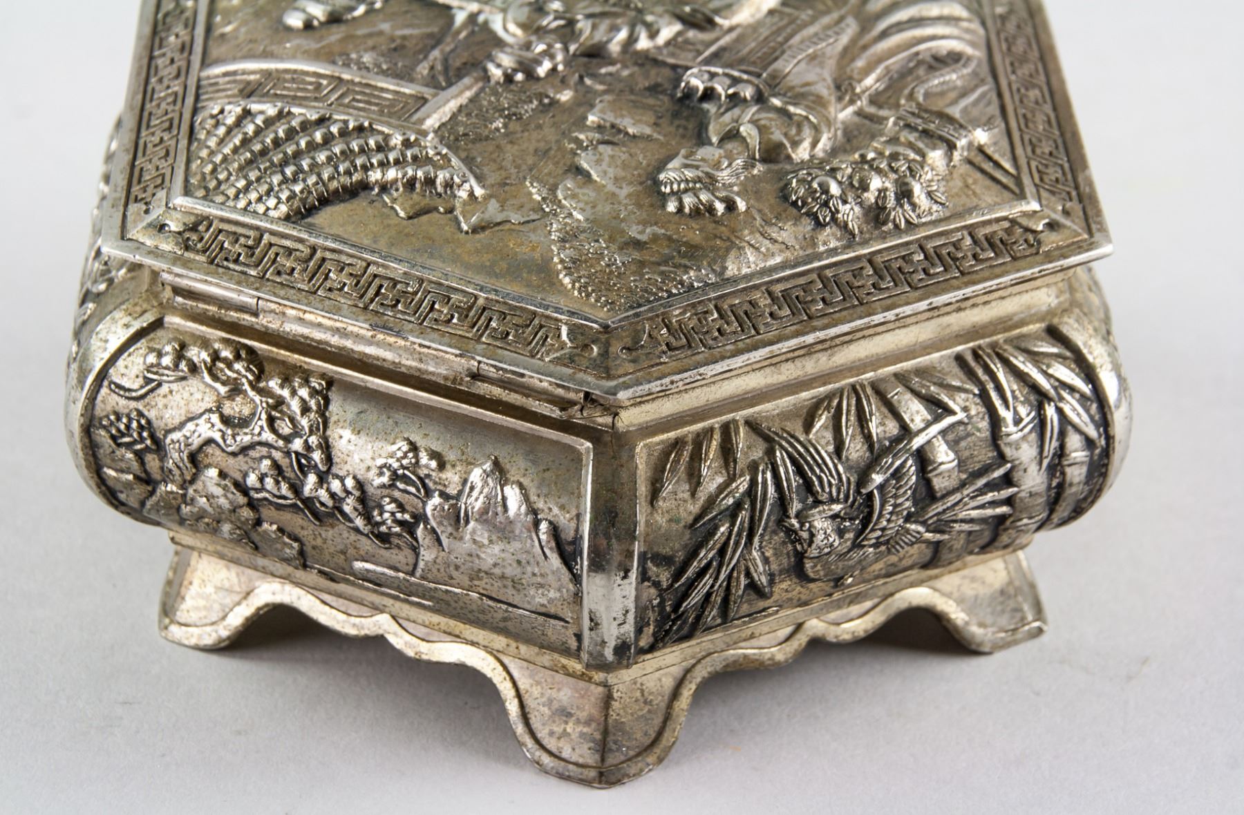 Chinese silver plated cosmetic box, of hexagon body, supported on 6 feet, with hinged lid, carved with figures on lid, flower and landscape on side, 7 x 14 cm, 561 grams. PROVENANCE: Atef Elshikh He was ambassador in China 1975-1977. Then ambassador in Austria and then Italy. Died in September 1984.