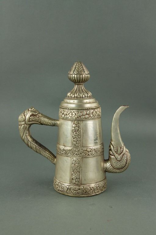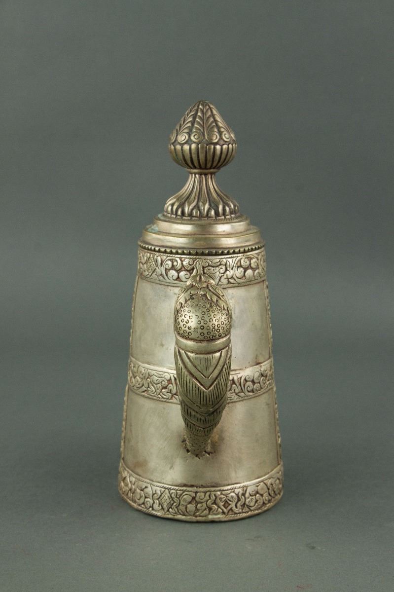 Chinese silver pot with cover; of tapered body flanked by dragon-shaped handle and spout; the base engraved with vajra mark; silver not tested for purity; H: 22 cm, W: 18.5 cm, 1002 grams