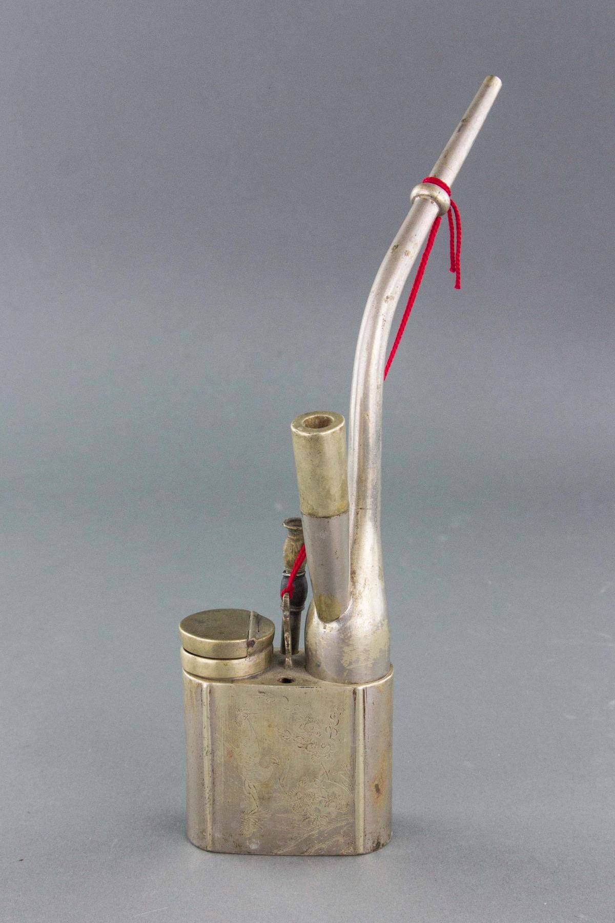 Chinese silver water pipe; carved with birds and flowers on body; with Guangzhou Yangliji mark on cap; Qing period; H: 27 cm, W: 7 cm, 437 grams
