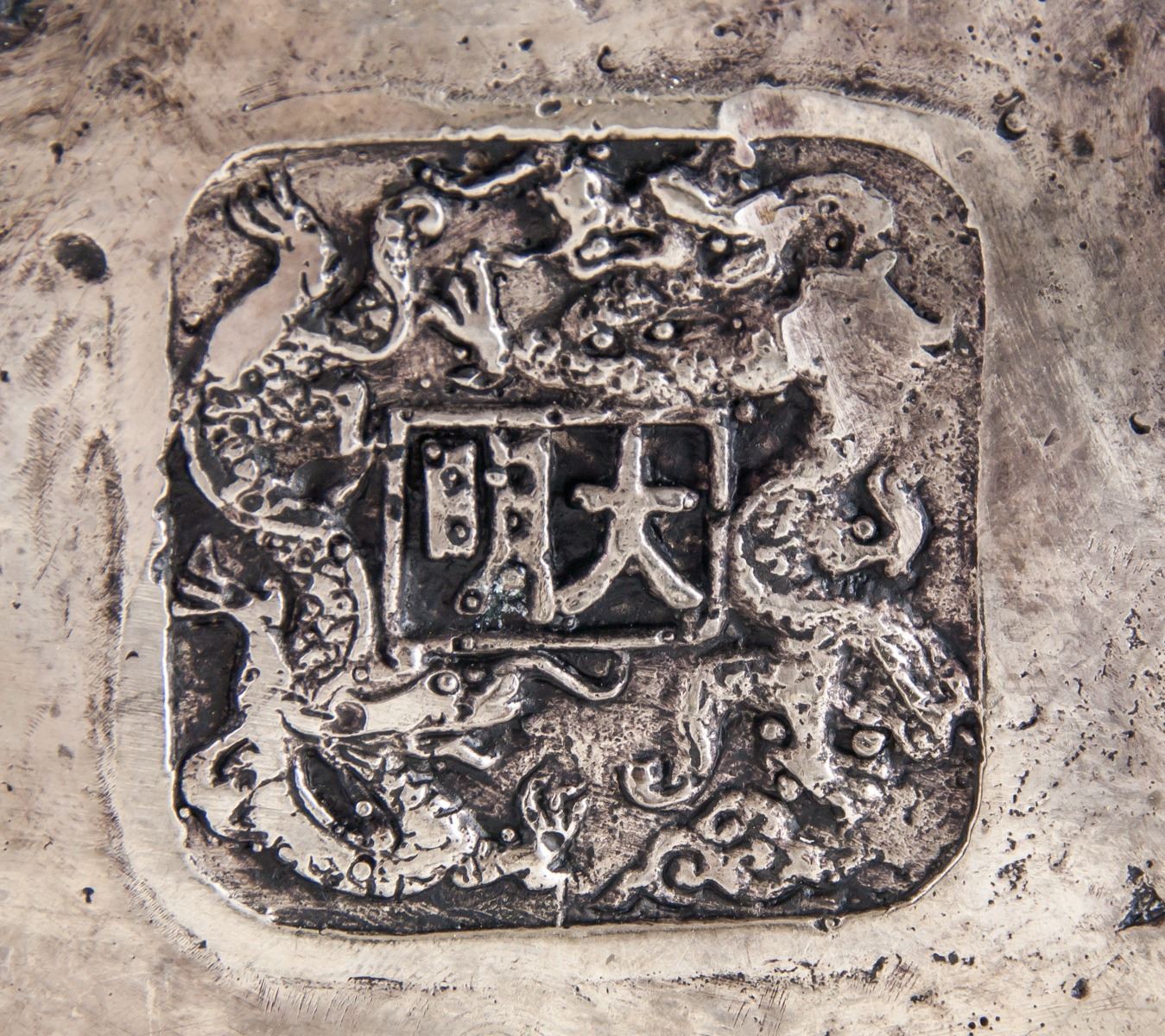 Chinese silver-like vase, of ovoid shape body, supported on tripod stand, carved with dragons and waves on surface, flanked with two dragon form handles, two-character Da Ming mark on base, 30 x 13 cm, 1531 grams