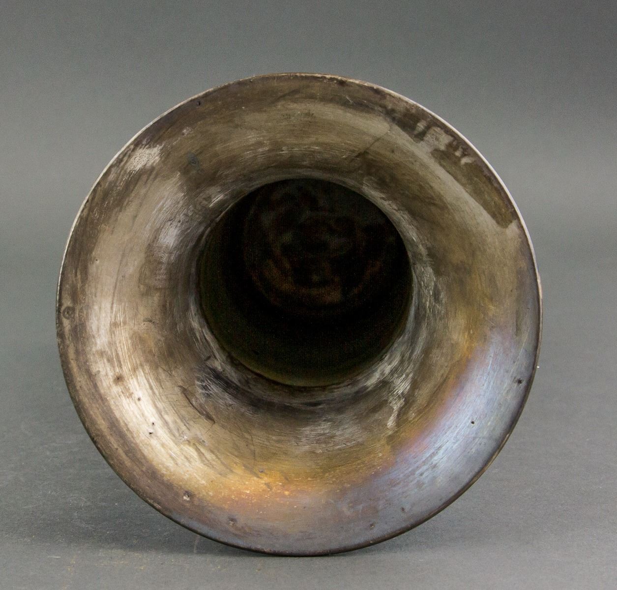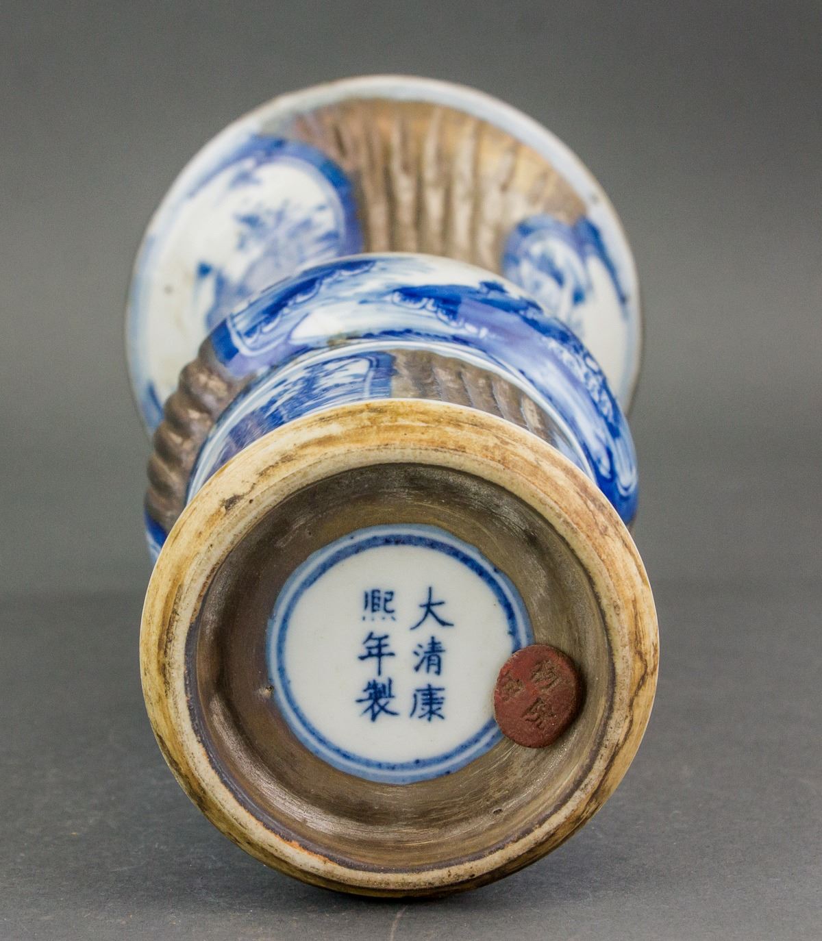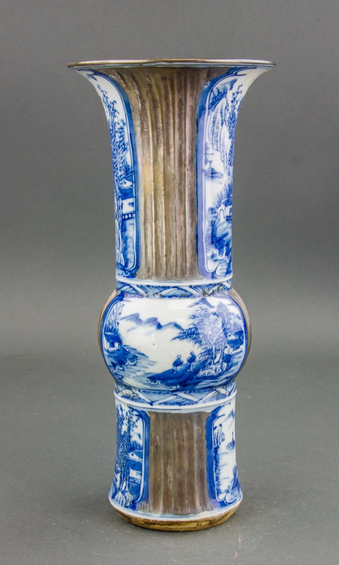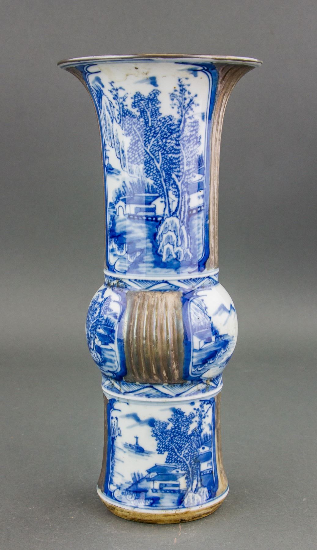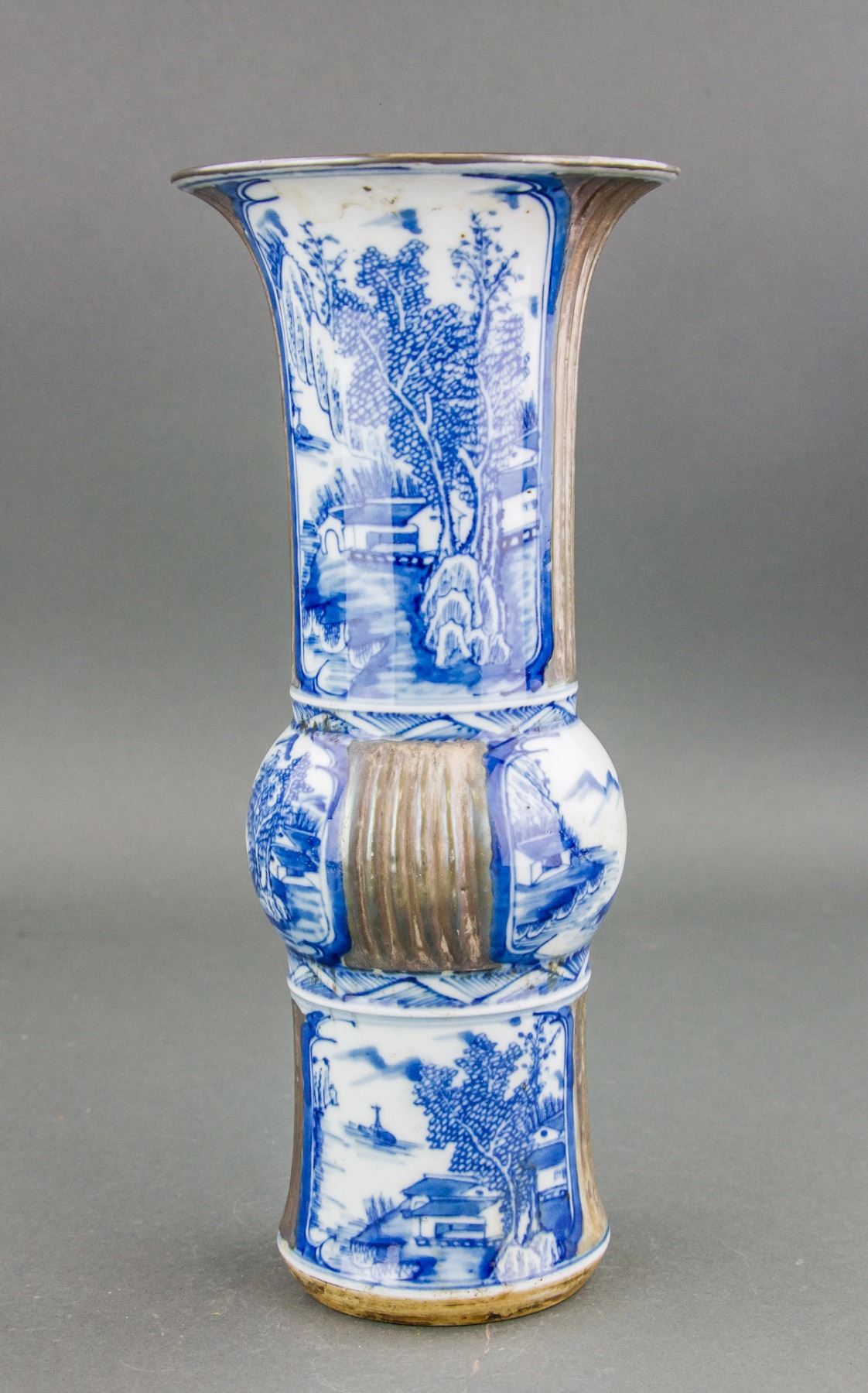 Chinese silvered blue and white porcelain vase; of globular body with long neck and foot rim; with splayed mouth; painted with landscape scene; silver covered on edge and part of body; six-character Kangxi mark on base; H: 27 cm, D: 12 cm, 668 grams