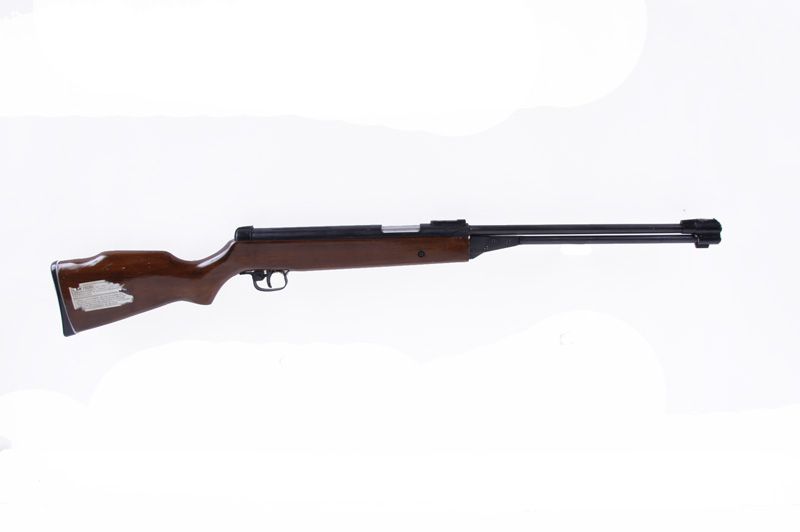 Wood stock, no sights, in .177 caliber. Condition: Fair with signs of heavy use.
