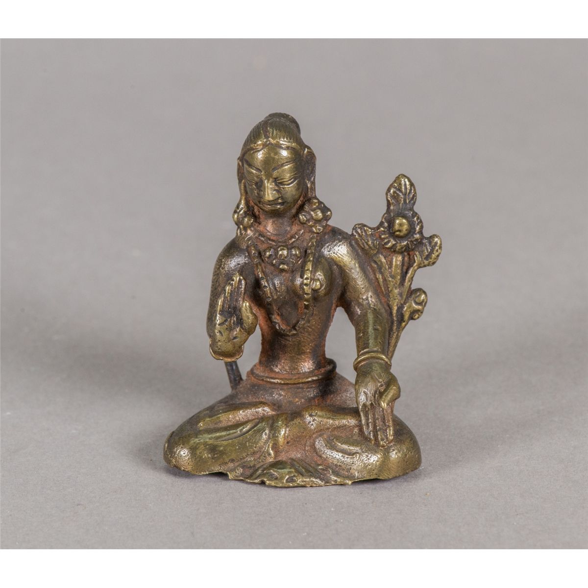 Chinese small 19th century bronze Buddha figure; featuring a female Buddha seated on ground in Abhaya Mudra (the gesture of fearlessness); H: 8 cm, W: 5 cm, 96 grams