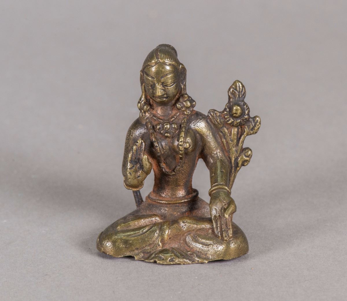 Chinese small 19th century bronze Buddha figure; featuring a female Buddha seated on ground in Abhaya Mudra (the gesture of fearlessness); H: 8 cm, W: 5 cm, 96 grams